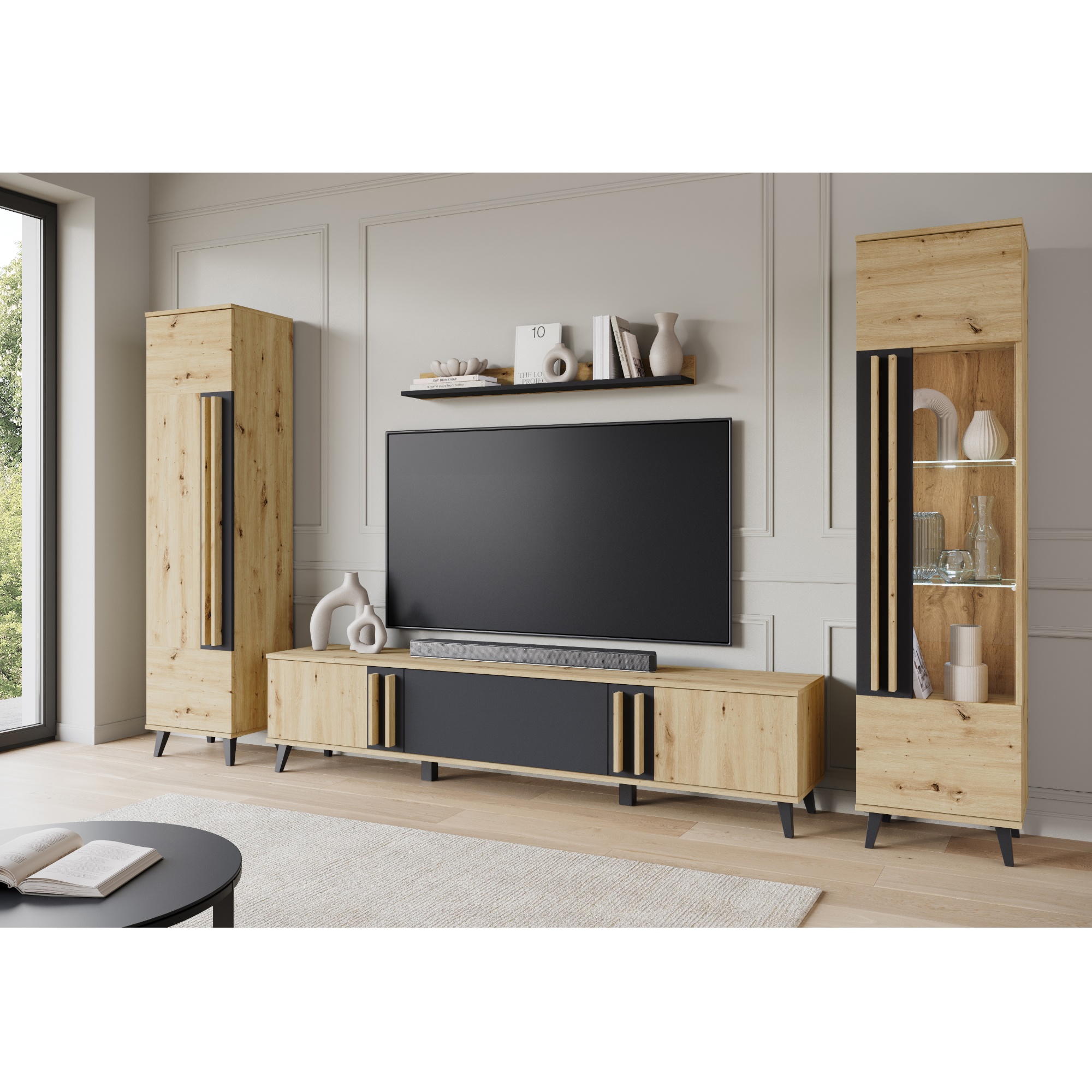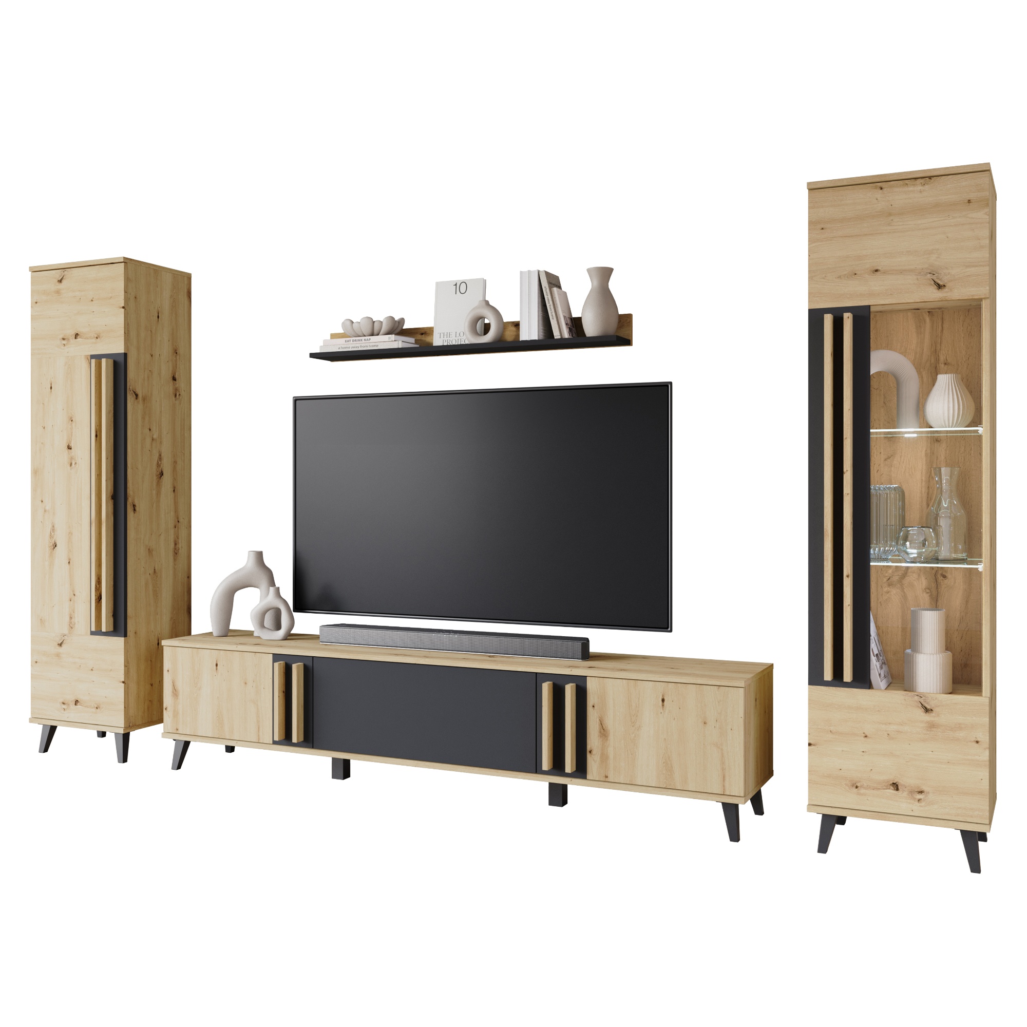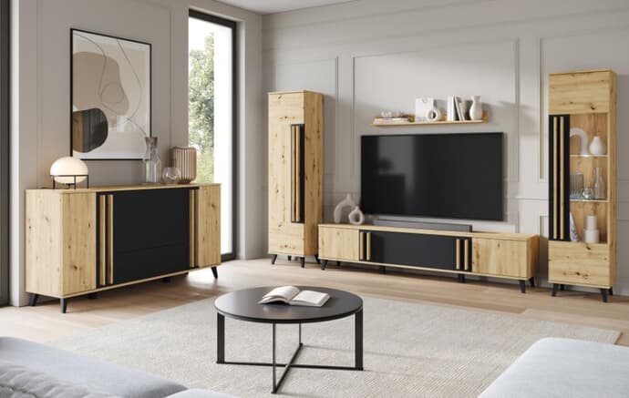 - Skladá sa z: 1 x TV komoda, 1 x nástenná polica, 1 x skrinka, 1 x vitrína