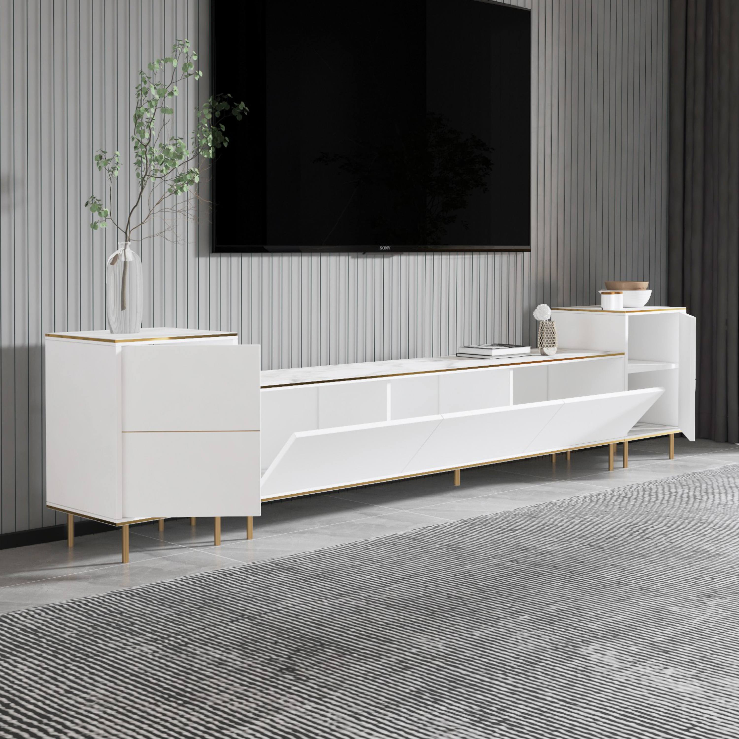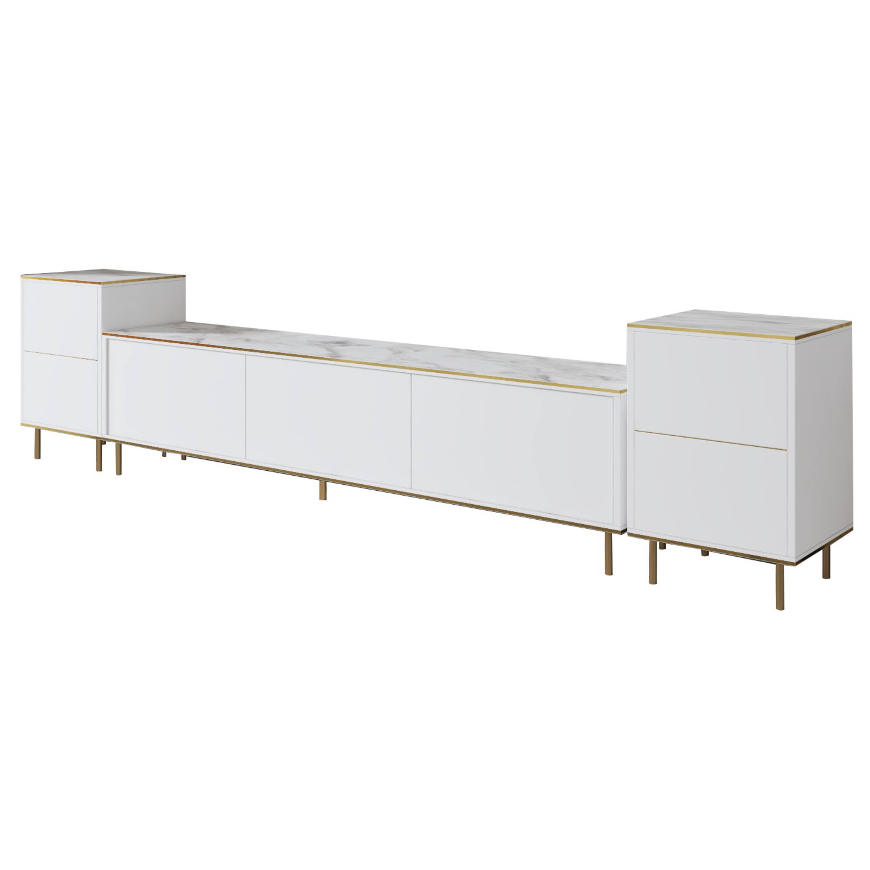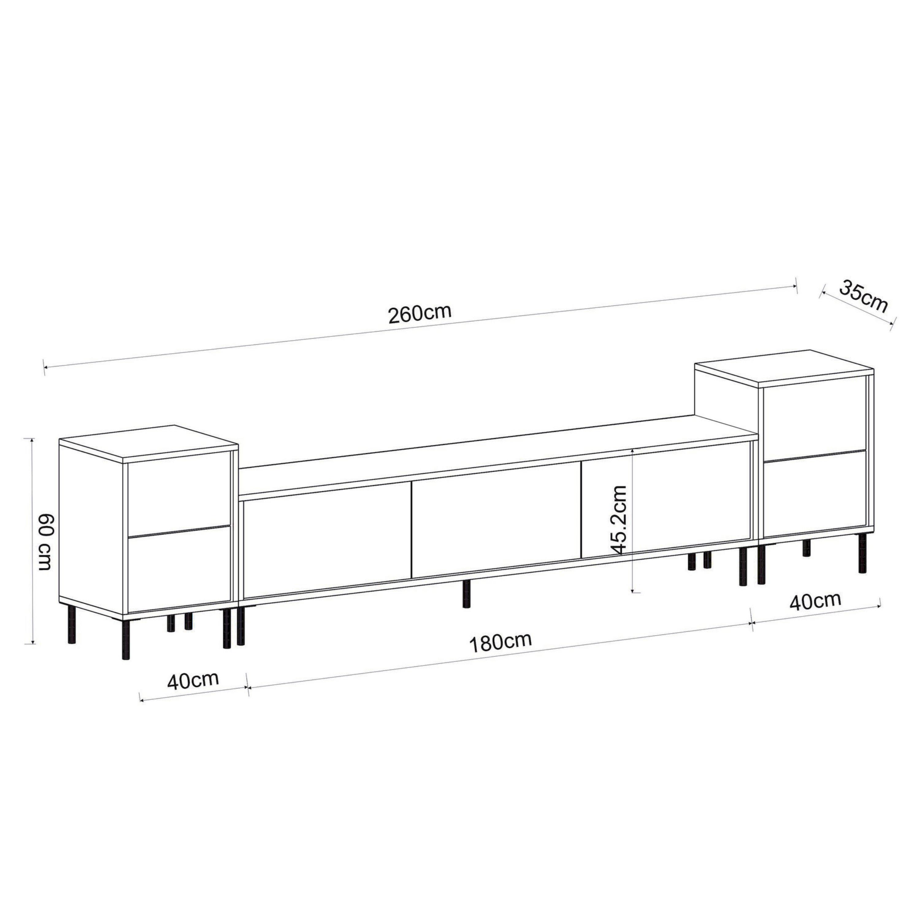 Hlavným prvkom je široká TV komoda disponujúca množstvom uzatvárateľného úložného priestoru, kam ukryjete nielen TV príslušenstvo, ale aj ďalšie nevyhnutnosti. Uzatvárajú ju 3 výklopné dvierka, ktoré umožňujú naplno využiť vnútorný priestor. Komodu dopĺňajú 2 malé skrinky, pričom každá z nich je vybavená vloženou policou za otočnými dverami. Set je vyrobený z laminovanej drevotriesky s povrchom nenáročným na údržbu.