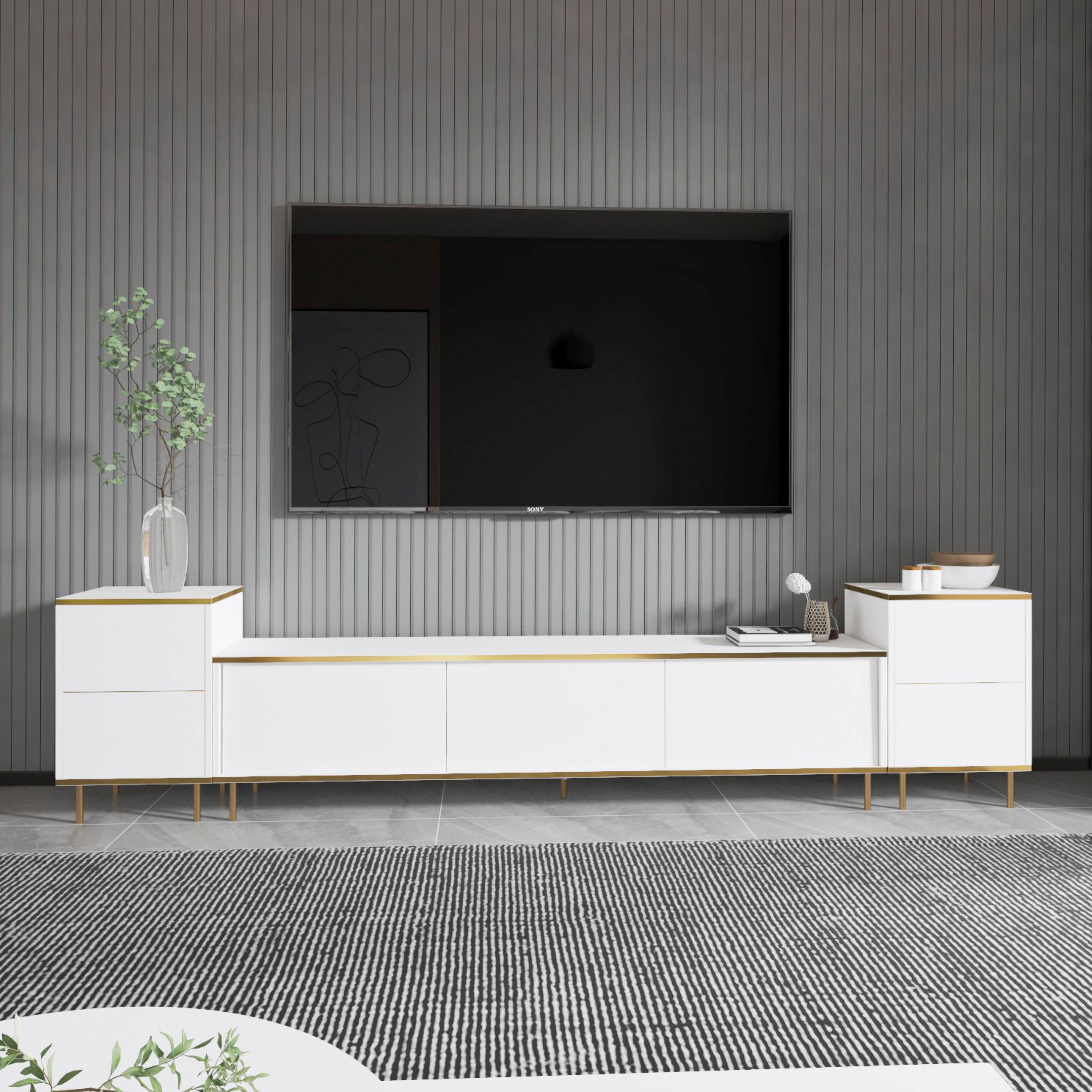 Hlavným prvkom je široká TV komoda disponujúca množstvom uzatvárateľného úložného priestoru, kam ukryjete nielen TV príslušenstvo, ale aj ďalšie nevyhnutnosti. Uzatvárajú ju 3 výklopné dvierka, ktoré umožňujú naplno využiť vnútorný priestor. Komodu dopĺňajú 2 malé skrinky, pričom každá z nich je vybavená vloženou policou za otočnými dverami. Set je vyrobený z laminovanej drevotriesky s povrchom nenáročným na údržbu.