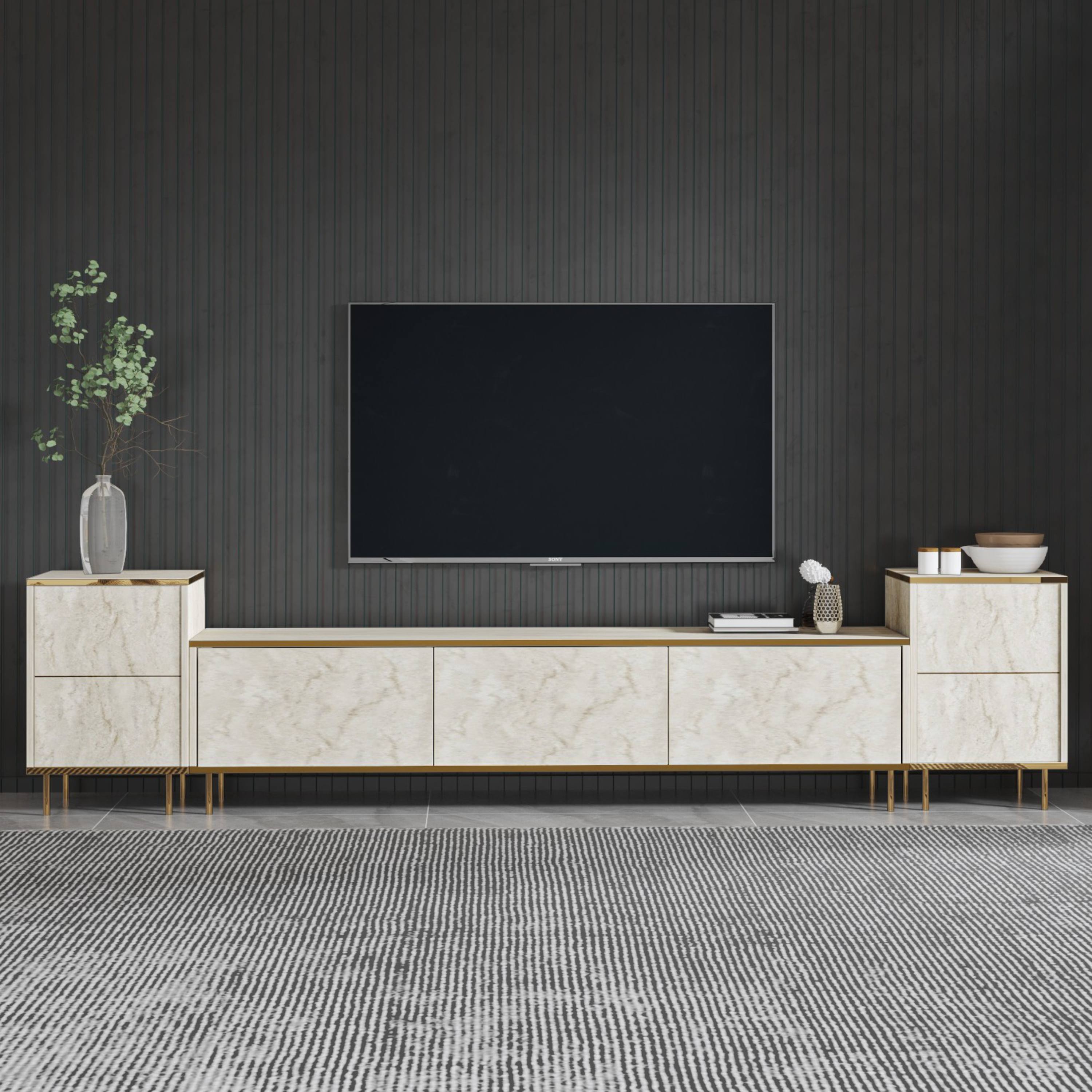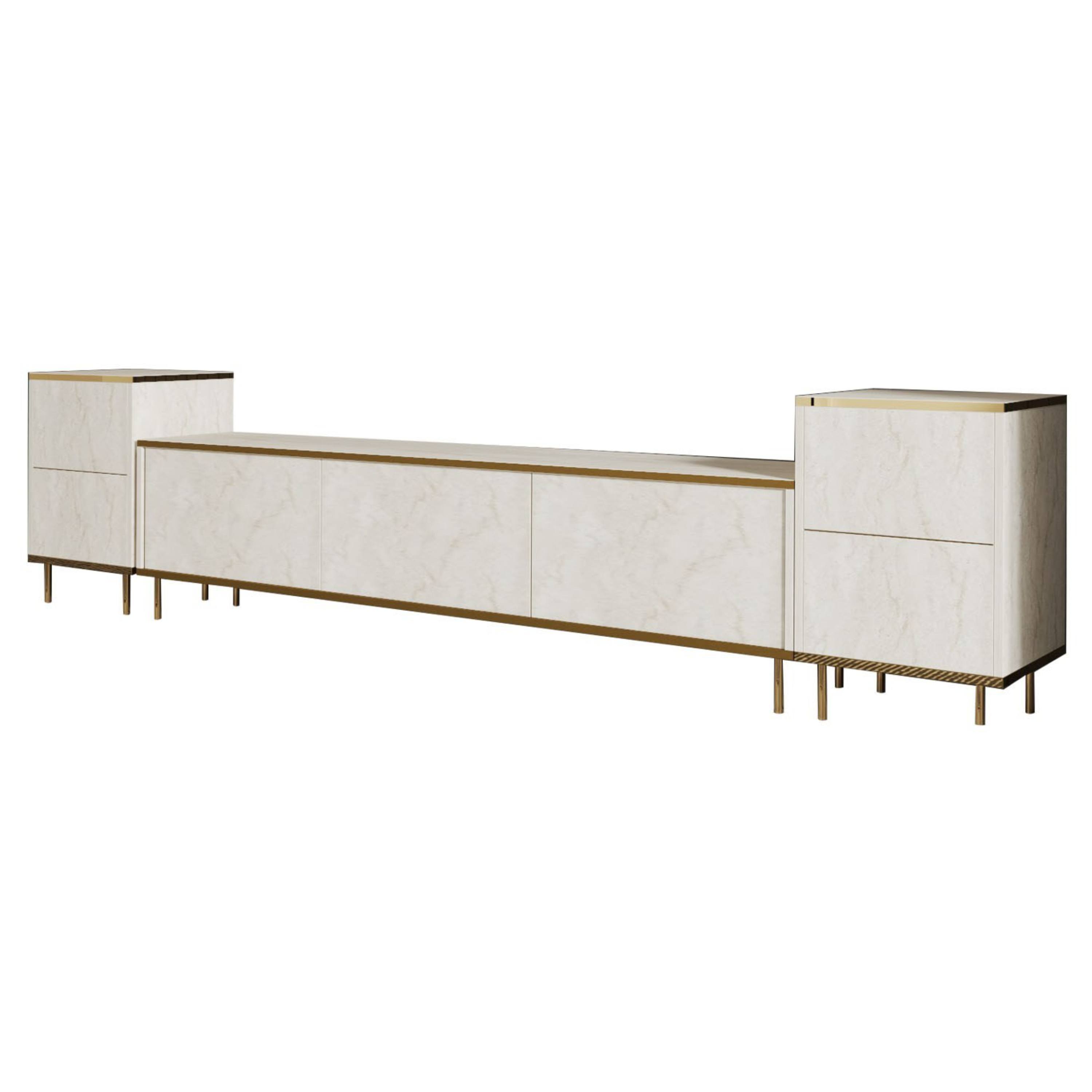Hlavným prvkom je široká TV komoda disponujúca množstvom uzatvárateľného úložného priestoru, kam ukryjete nielen TV príslušenstvo, ale aj ďalšie nevyhnutnosti. Uzatvárajú ju 3 výklopné dvierka, ktoré umožňujú naplno využiť vnútorný priestor. Komodu dopĺňajú 2 malé skrinky, pričom každá z nich je vybavená vloženou policou za otočnými dverami. Set je vyrobený z laminovanej drevotriesky s povrchom nenáročným na údržbu.