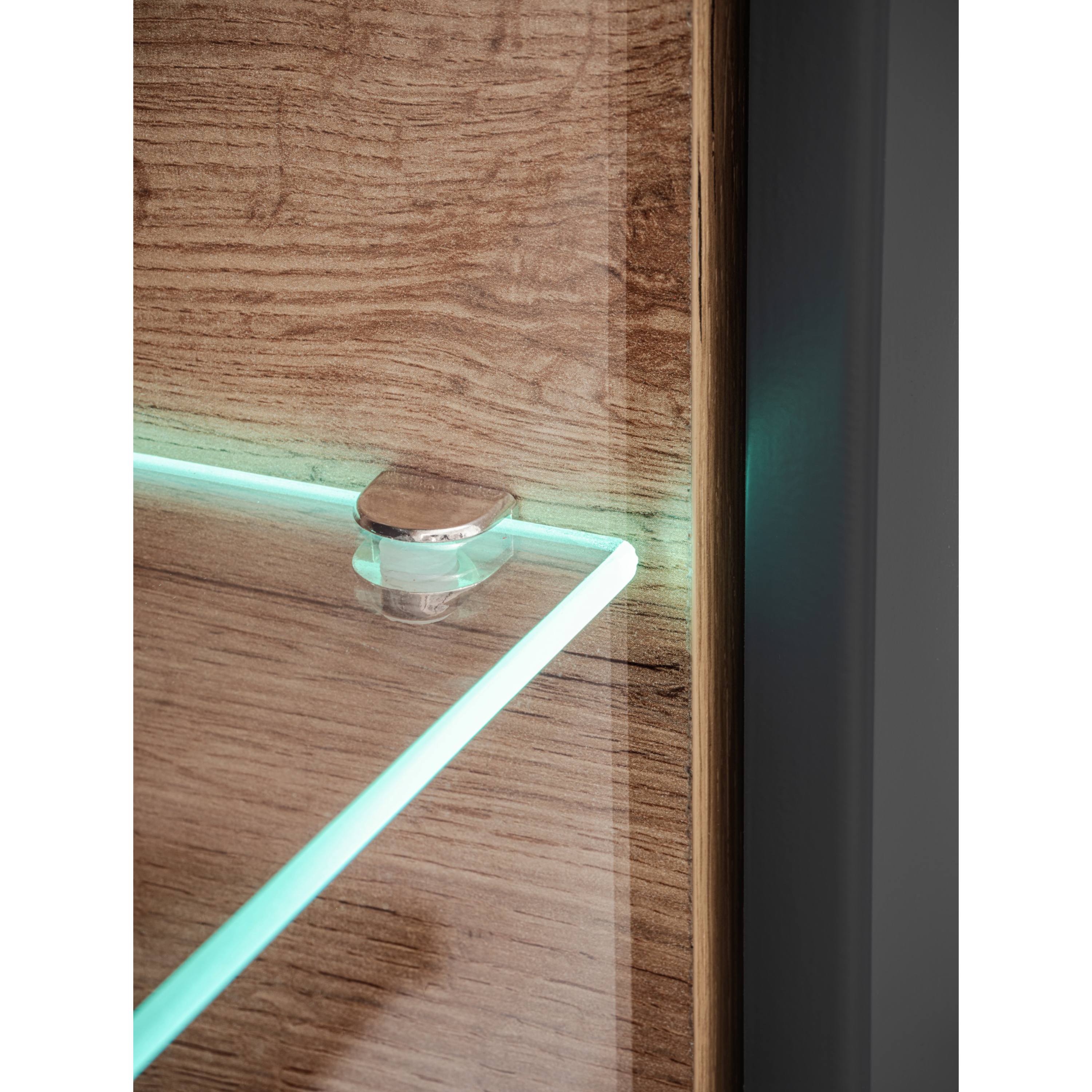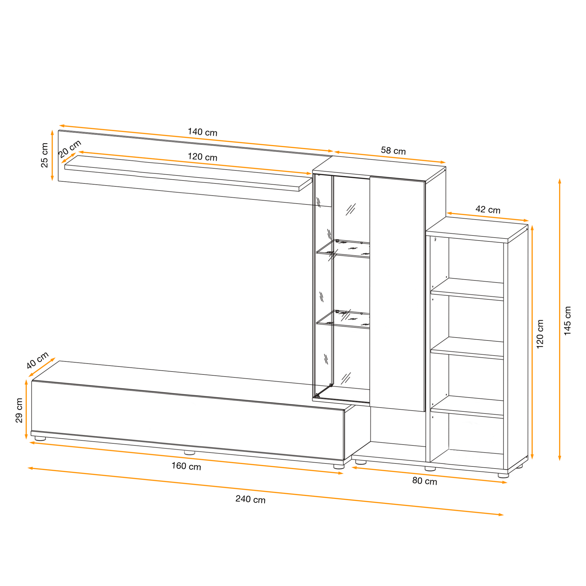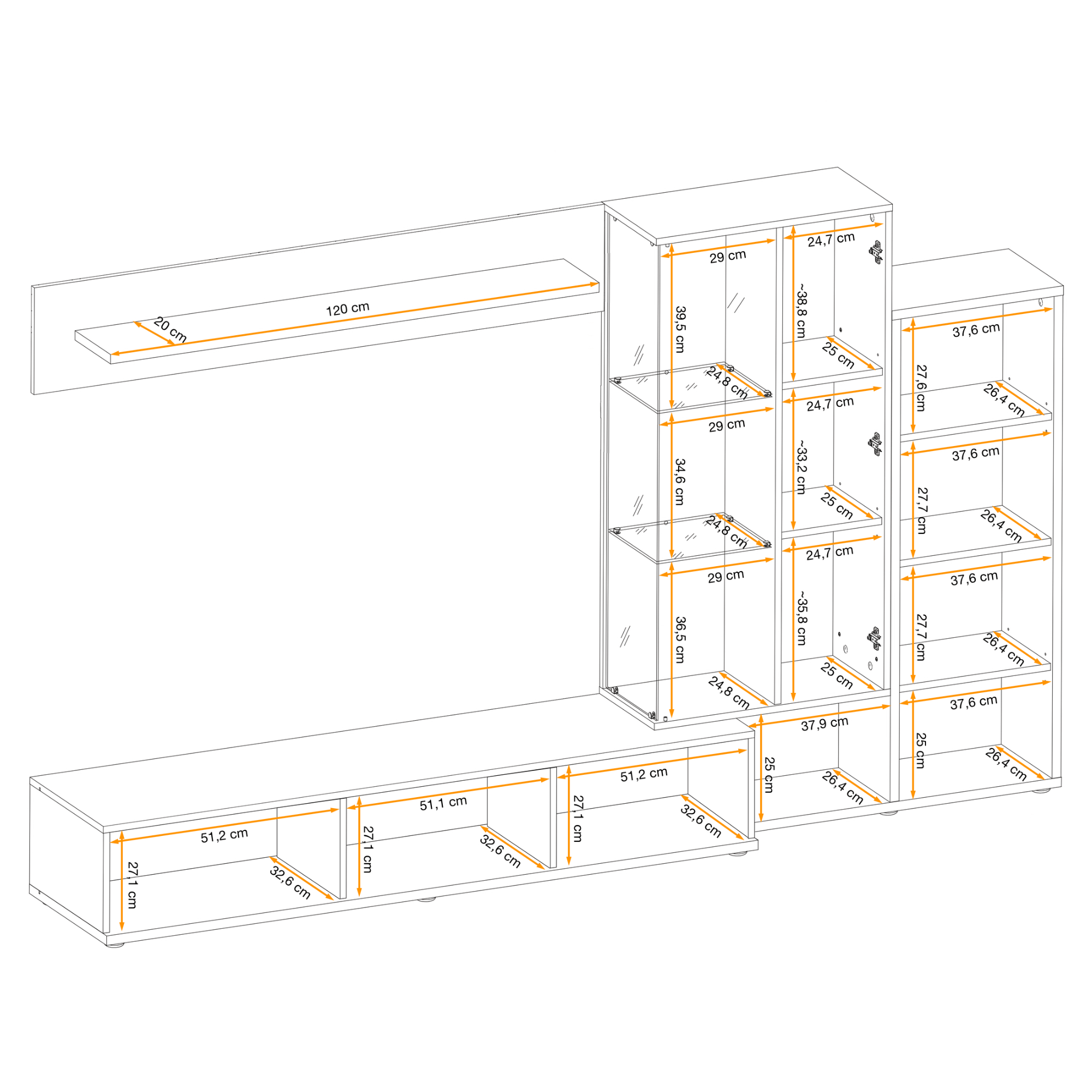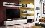Vyrobená je ako celistvý blok s množstvom funkcií. Spodná časť slúžiaca ako TV komoda disponuje úložným priestorom s výklopnými dvierkami, ktorý je prakticky rozdelený na 3 oddelené priestory. Na komodu plynule nadväzuje panel kombinujúci pravú stranu s 3 otvorenými vloženými policami a ľavou so 4 vloženými policami za uzatvárateľnými dverami. Táto časť slúži ako vitrína pretože je čiastočne presklená a osvetlená príjemným LED osvetlením. Voľný priestor nad televízorom dotvorí nástenná polica, ktorá je ako stvorená na najrôznejšie dekorácie. Celá stena je vyrobená z materiálov, ktoré sa vám budú ľahko udržiavať.