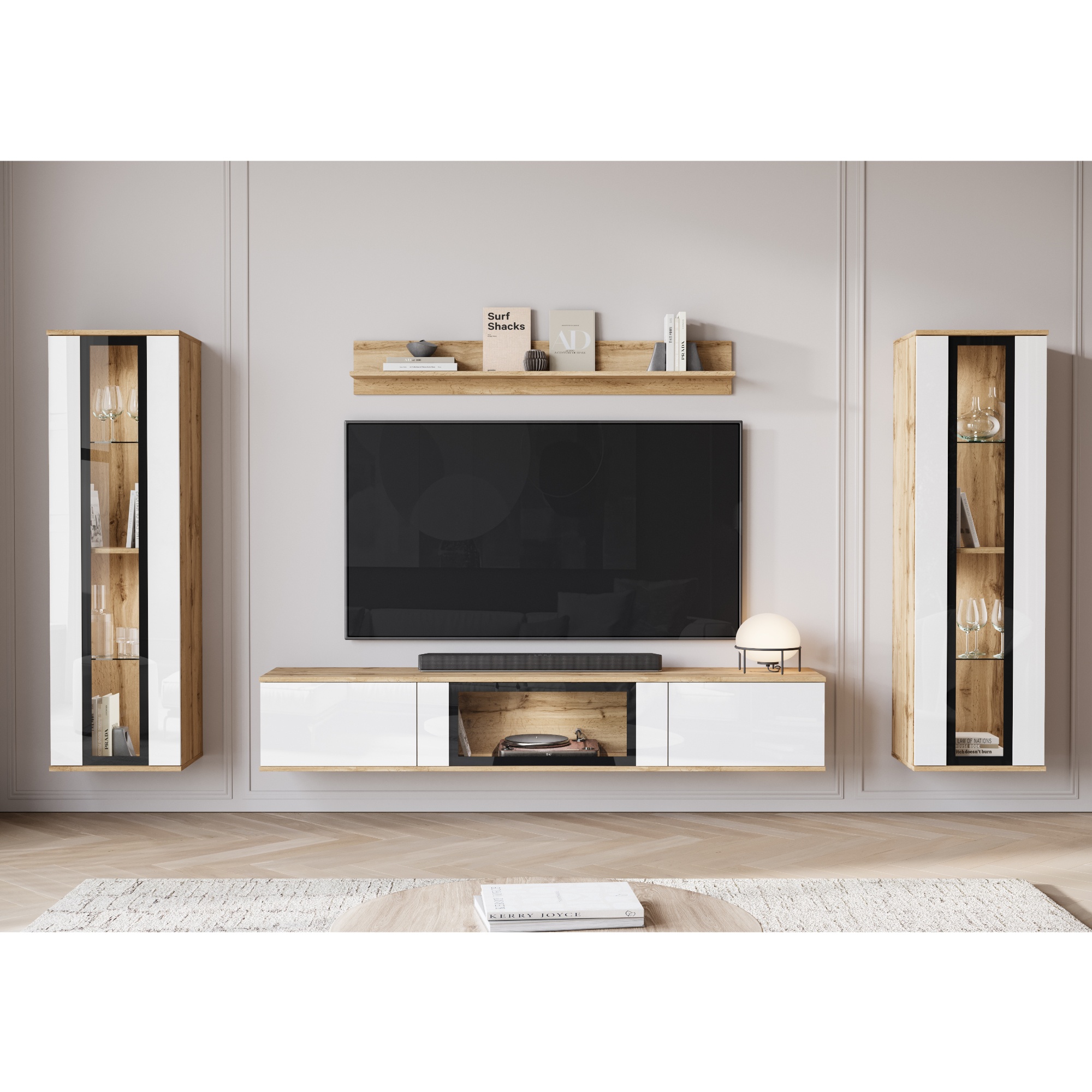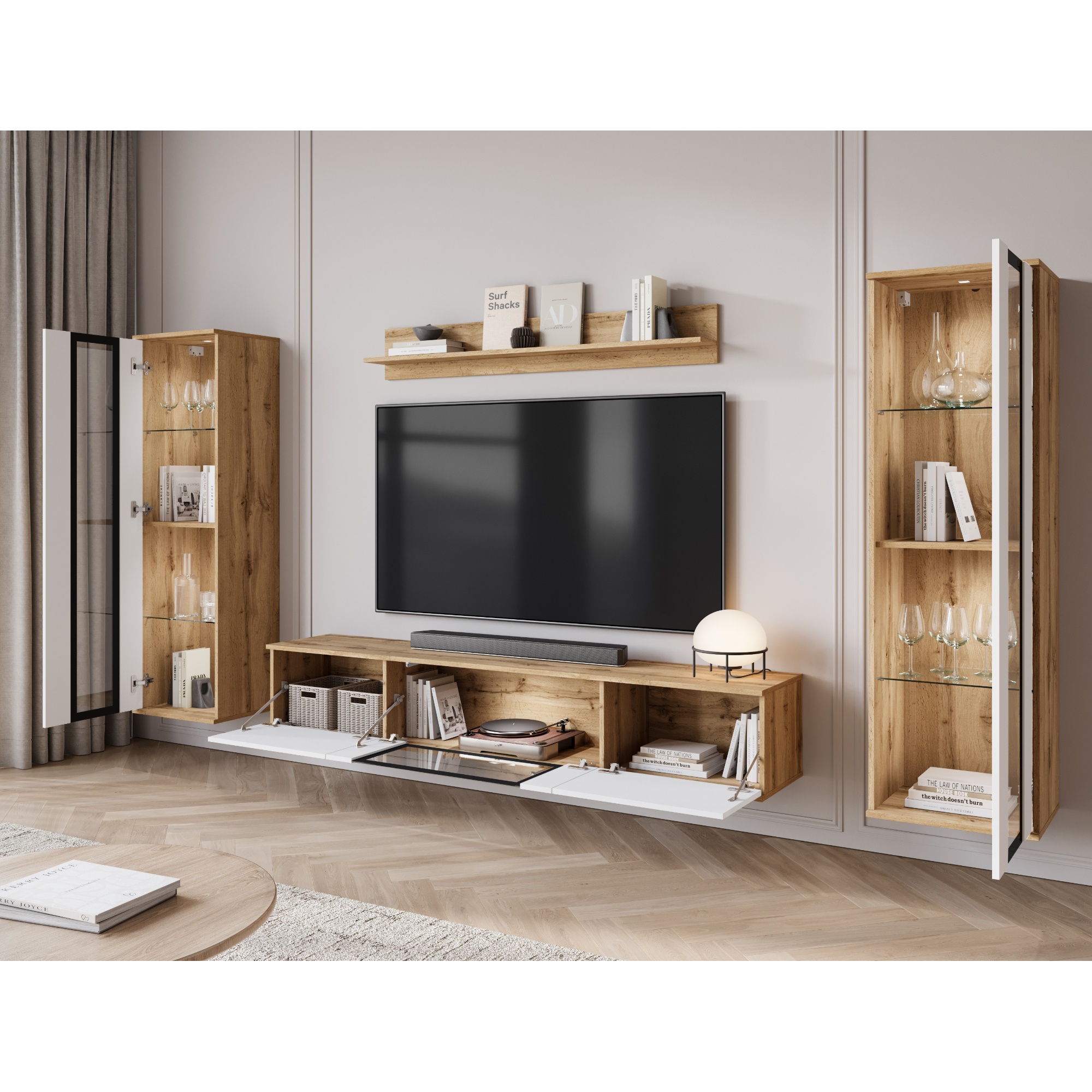Skladá sa z 2 úzkych vitrín s presklenými otočnými dverami, z ktorých každá obsahuje 3 praktické police. Súčasťou je aj priestranná TV komoda s 3 výklopnými dverami z ktorých jedny sú presklené na efektívne vystavenie dekorácií. Stenu dopĺňa nástenná polica, ideálna na uloženie kníh, rastlín alebo drobných dekorácií.