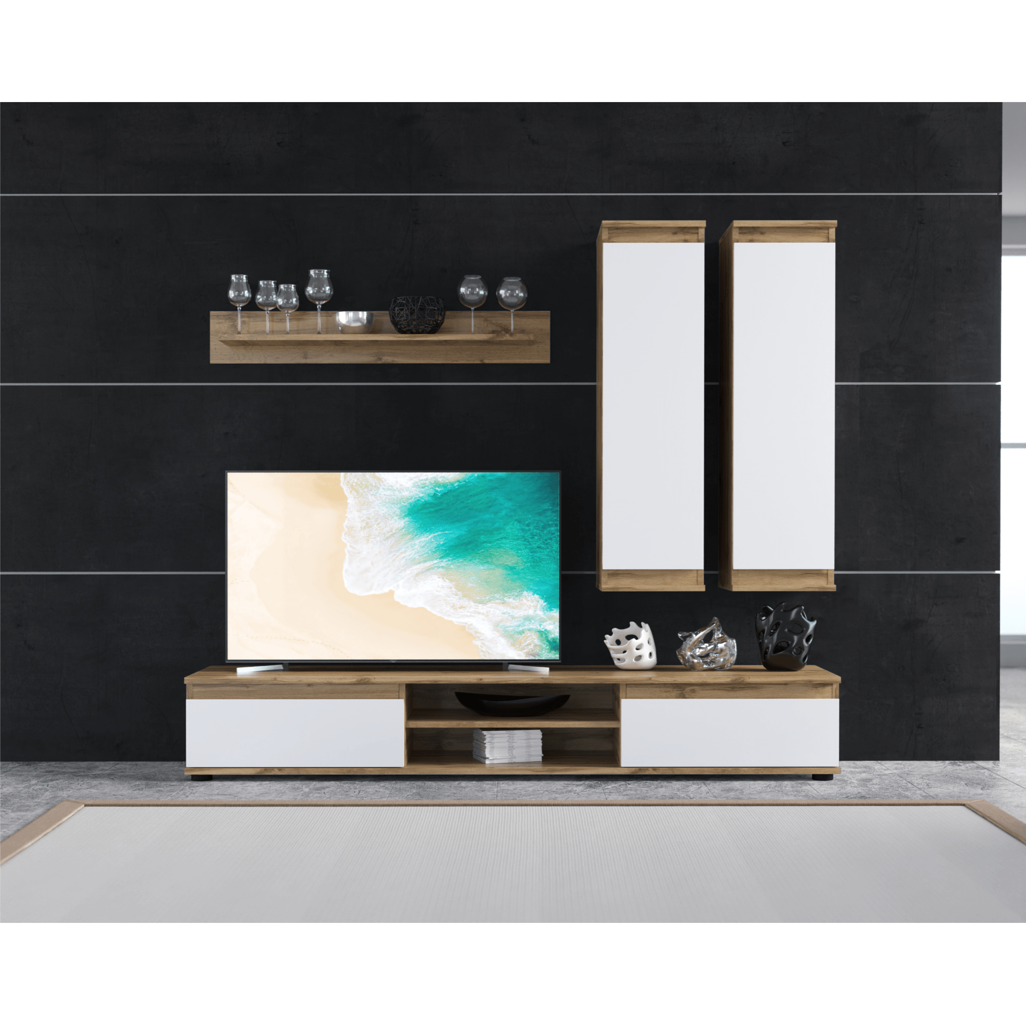 - Skladá sa z: TV komoda, 2x závesná skrinka, polica