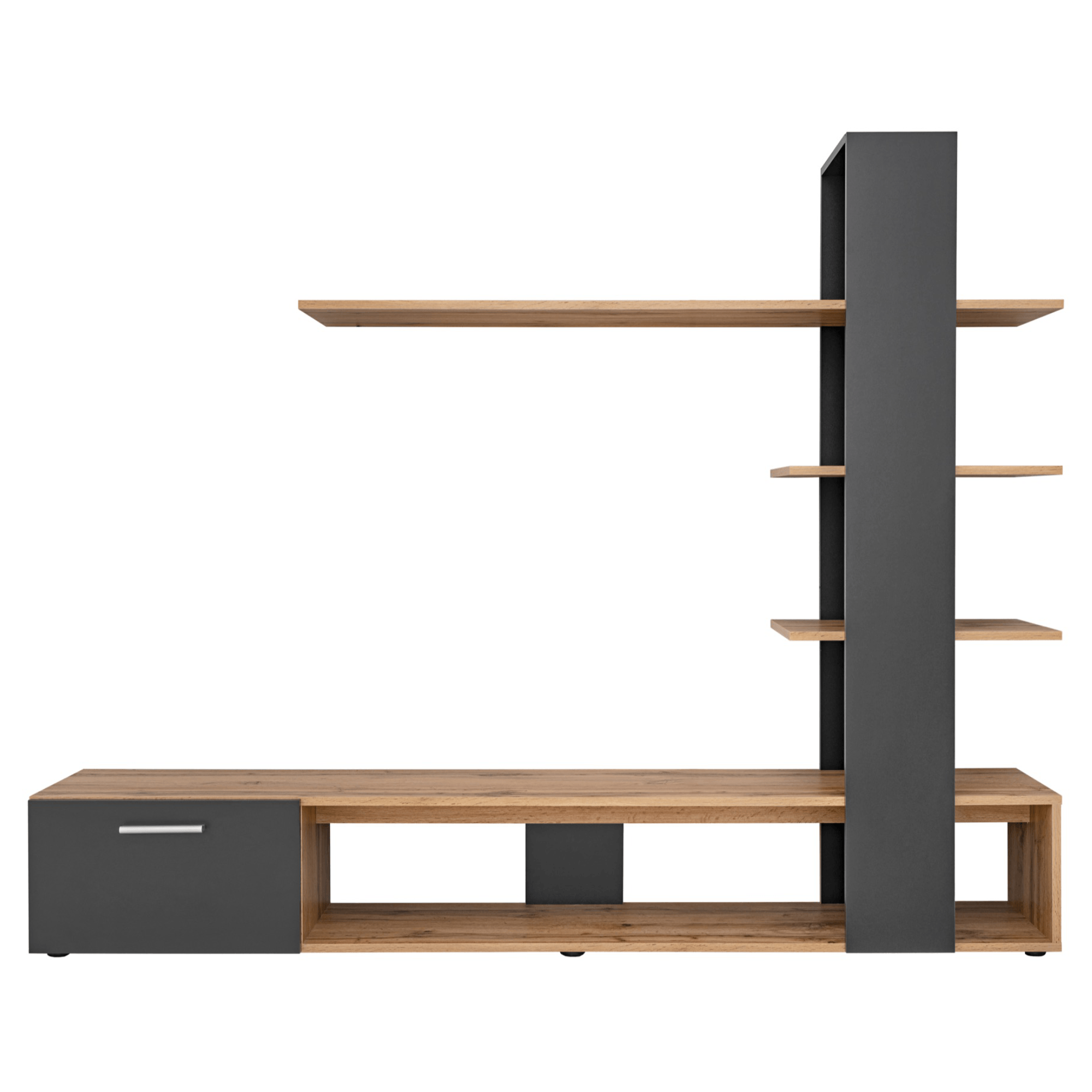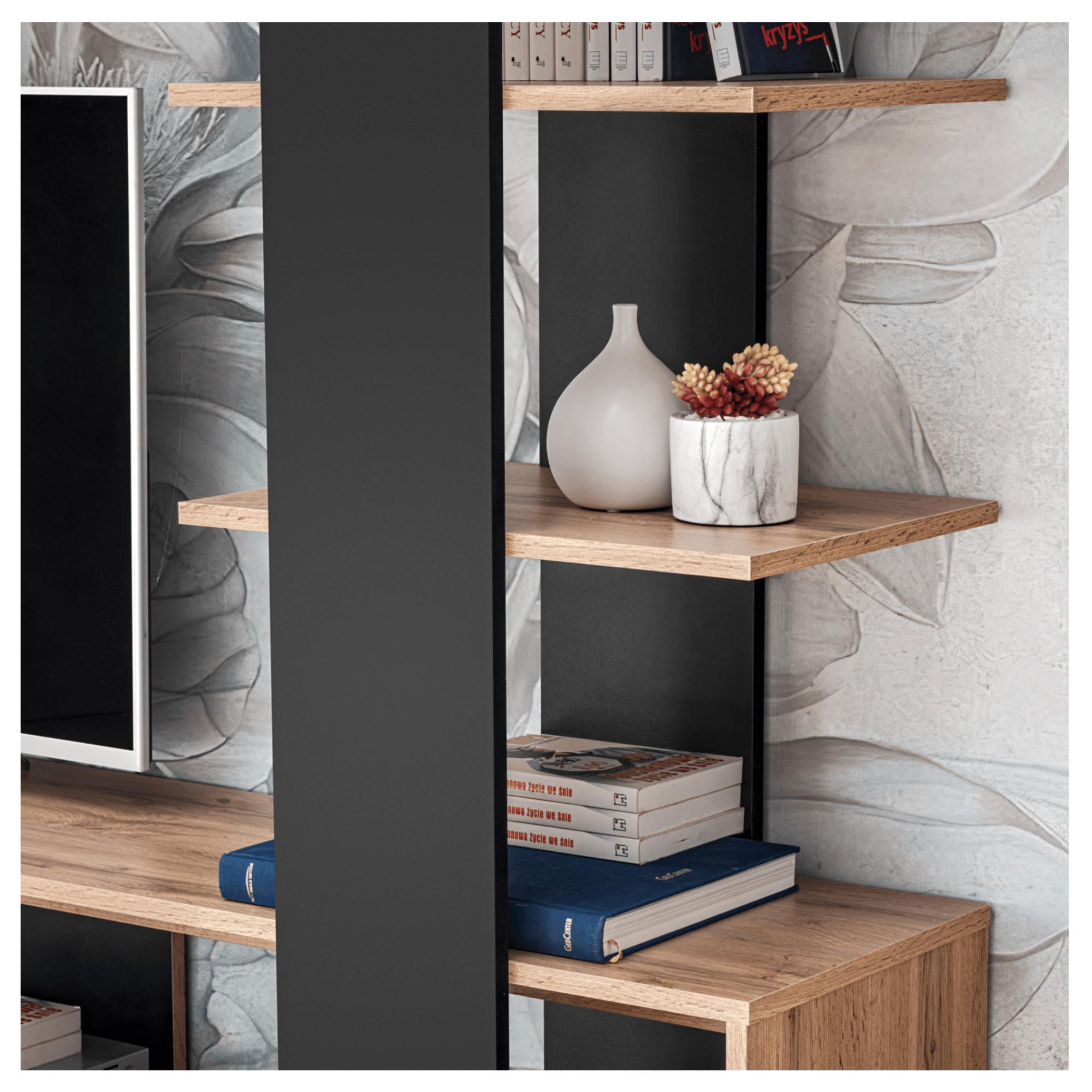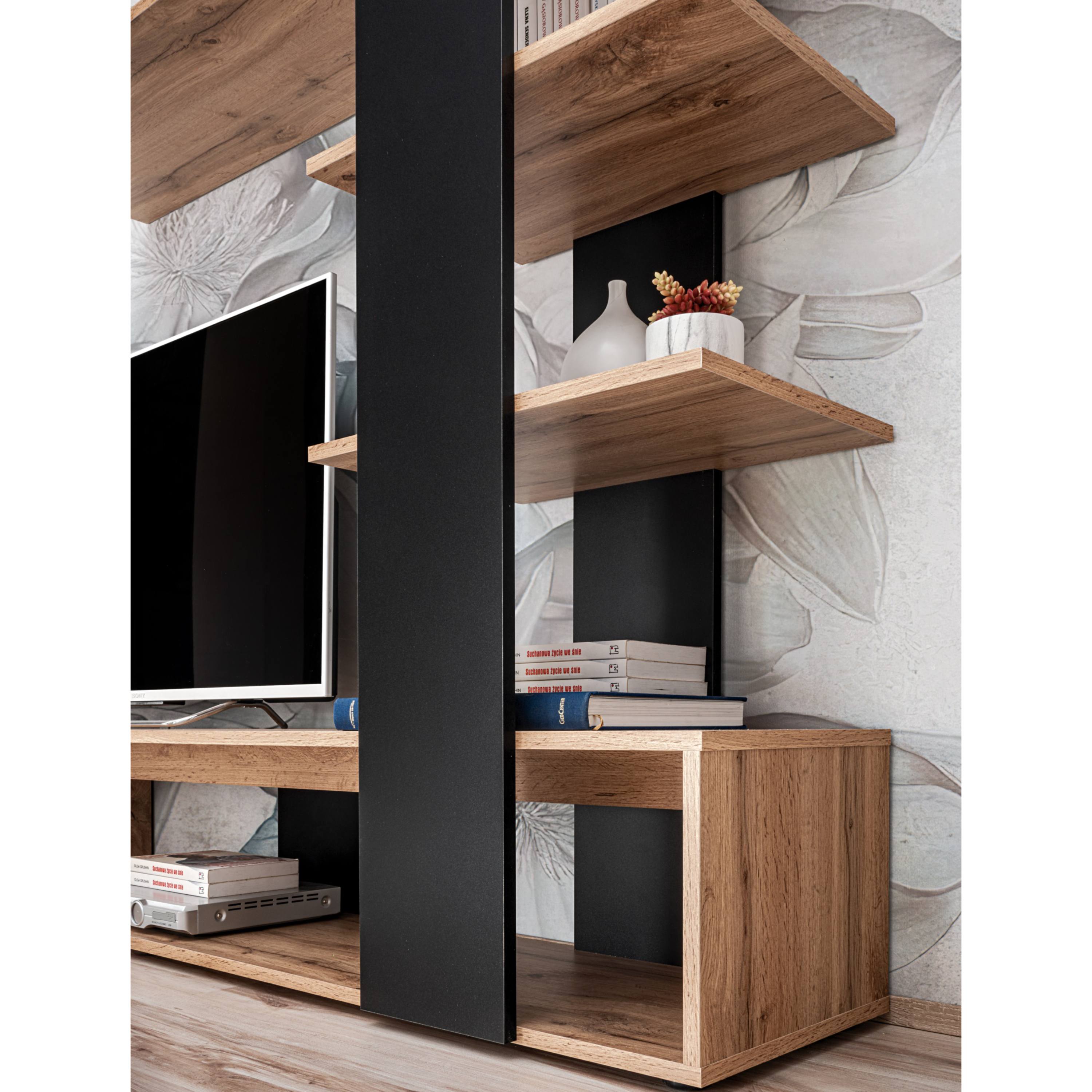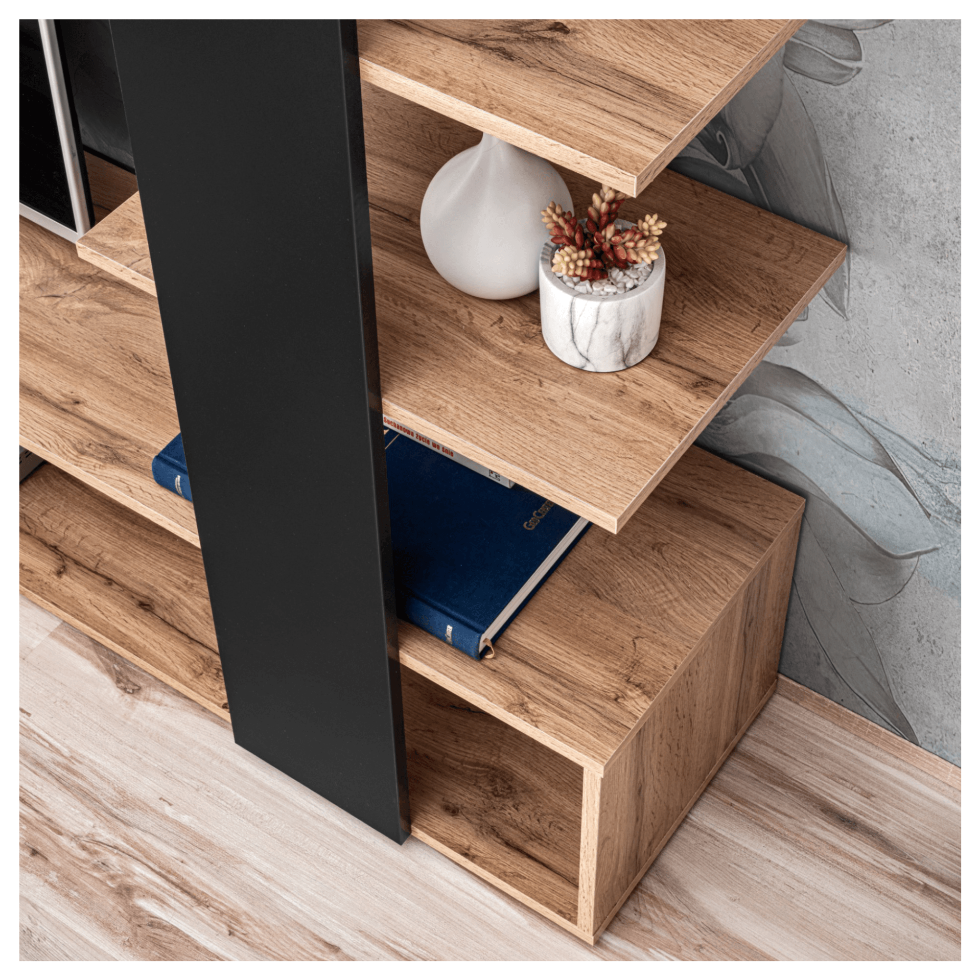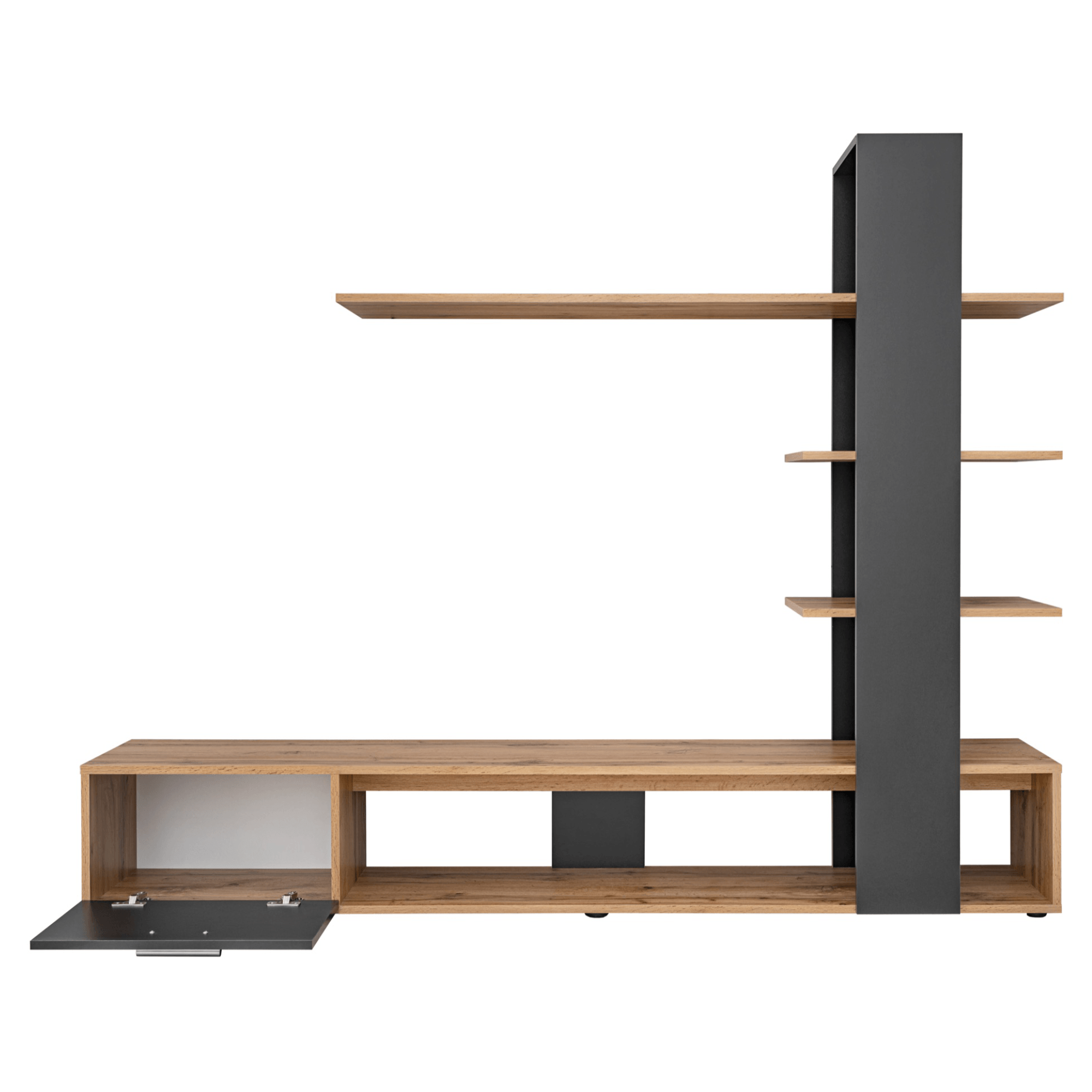 Originálne a vzdušné spracovanie obývacej steny MACO ponúka veľké množstvo prevažne otvoreného odkladacieho priestoru a skvele oživí akékoľvek moderné obývacie izby. Dekor duba wotan je ideálnym kontrastom k moderným, čistým líniám.