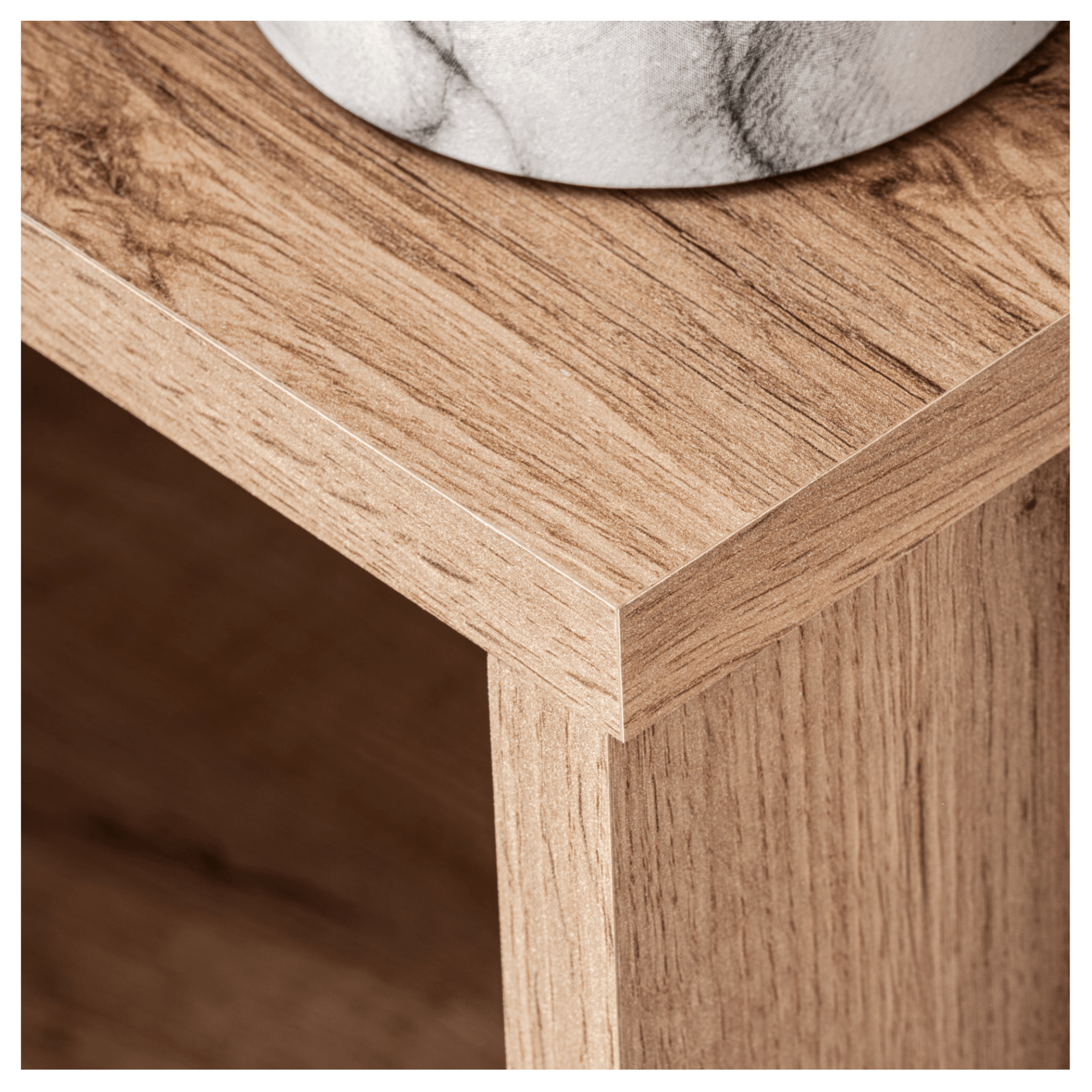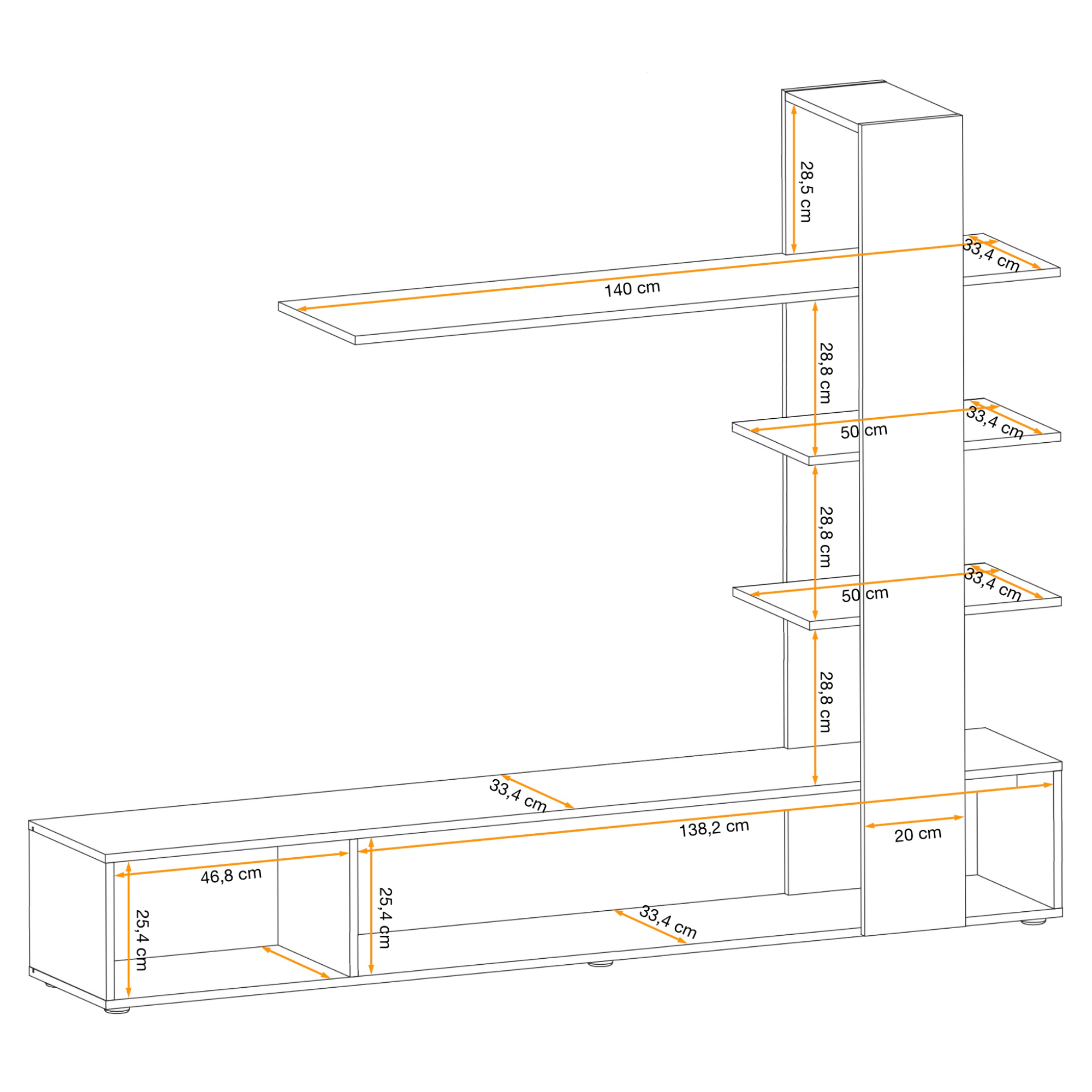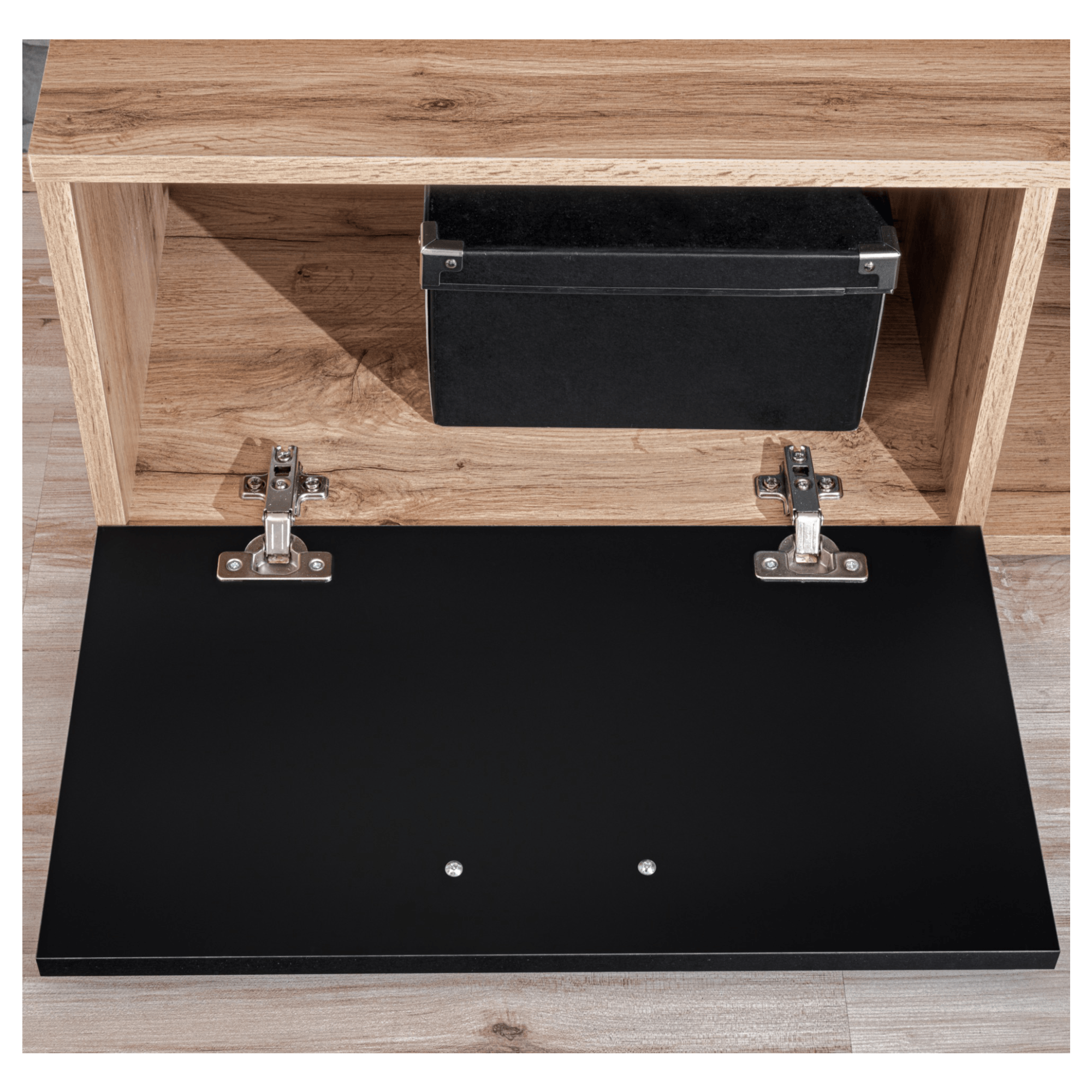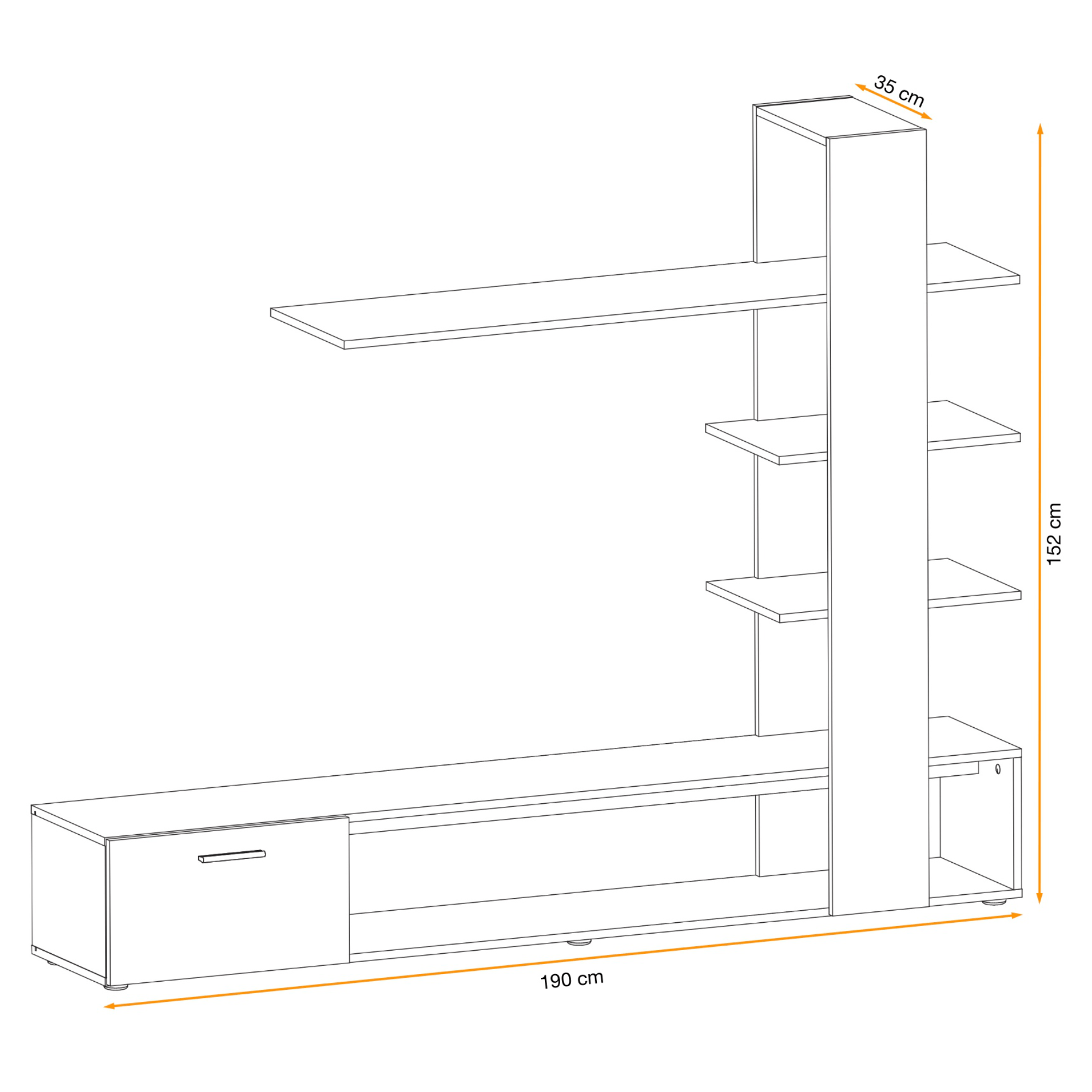 Široká TV komoda ponúka dostatok miesta na uloženie všetkého TV príslušenstva a za výklopné dvierka, ktoré otvoríte pomocou výraznej rúčky môžete uložiť dokumenty a všetko, čo chcete mať po ruke, ale nie priamo na očiach. Komoda je podložená nízkymi klzákmi nahradzujúcimi nohy. Na komodu plynule nadväzuje panel s 3 vloženými policami, ktoré ponúkajú dostatok miesta na uloženie kníh, rastlín, fotografií a ďalších predmetov, ktoré pomôžu zútulniť obývací priestor. Vyrobená je z laminovaného dreveného materiálu, ktorý poteší ľahkou udržiavateľnosťou.