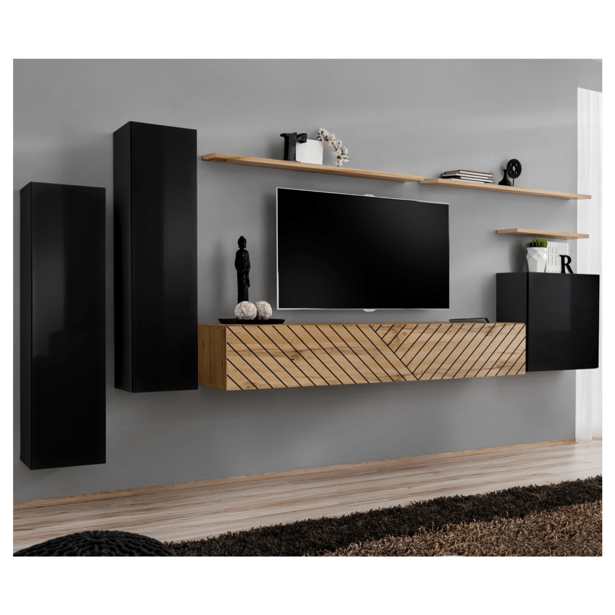 - Skladá sa z: Nástenná TV komoda, 2x nástenná skrinka, 1x nástenný blok, 3x polica