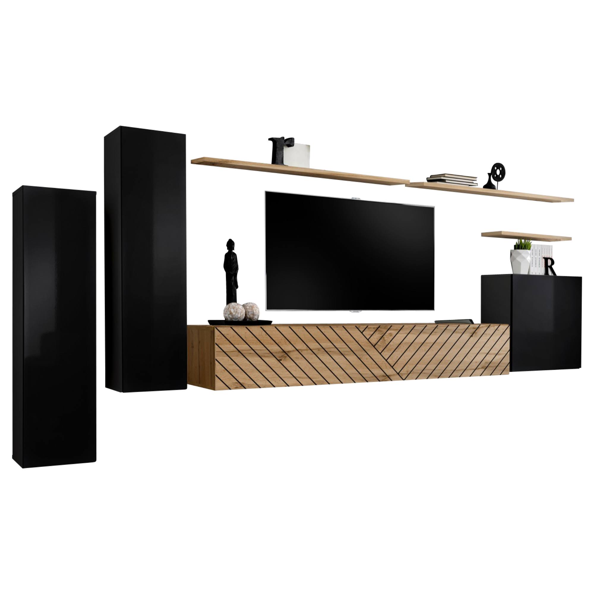 Nástenná TV komoda disponuje uzavretým úložným priestorom, ale aj rozsiahlym odkladacím priestorom na TV príslušenstvo a ďalšie nevyhnutnosti. Súčasťou zostavy sú tiež 2 vysoké, úzke uzatvárateľné skrinky závesného typu z ktorých každá disponuje 2 vloženými policami. Ďalšie úložné miesto vám poskytne nástenný blok s vloženou policou. Predná plocha TV komody je doplnená o dekoratívne frézovanie. Predné plochy ostatných prvkov zostavy sú vyhotovené vo vysokom lesku a ich korpusy v matnom vyhotovení. Stenu doplníte nástennými policami v dvoch veľkostiach, ktoré prakticky vyplnia prázdny priestor nad zostavou. Obývacia stena je vyrobená z materiálov nenáročných na údržbu a rozložiť ju môžete voľne do priestoru.