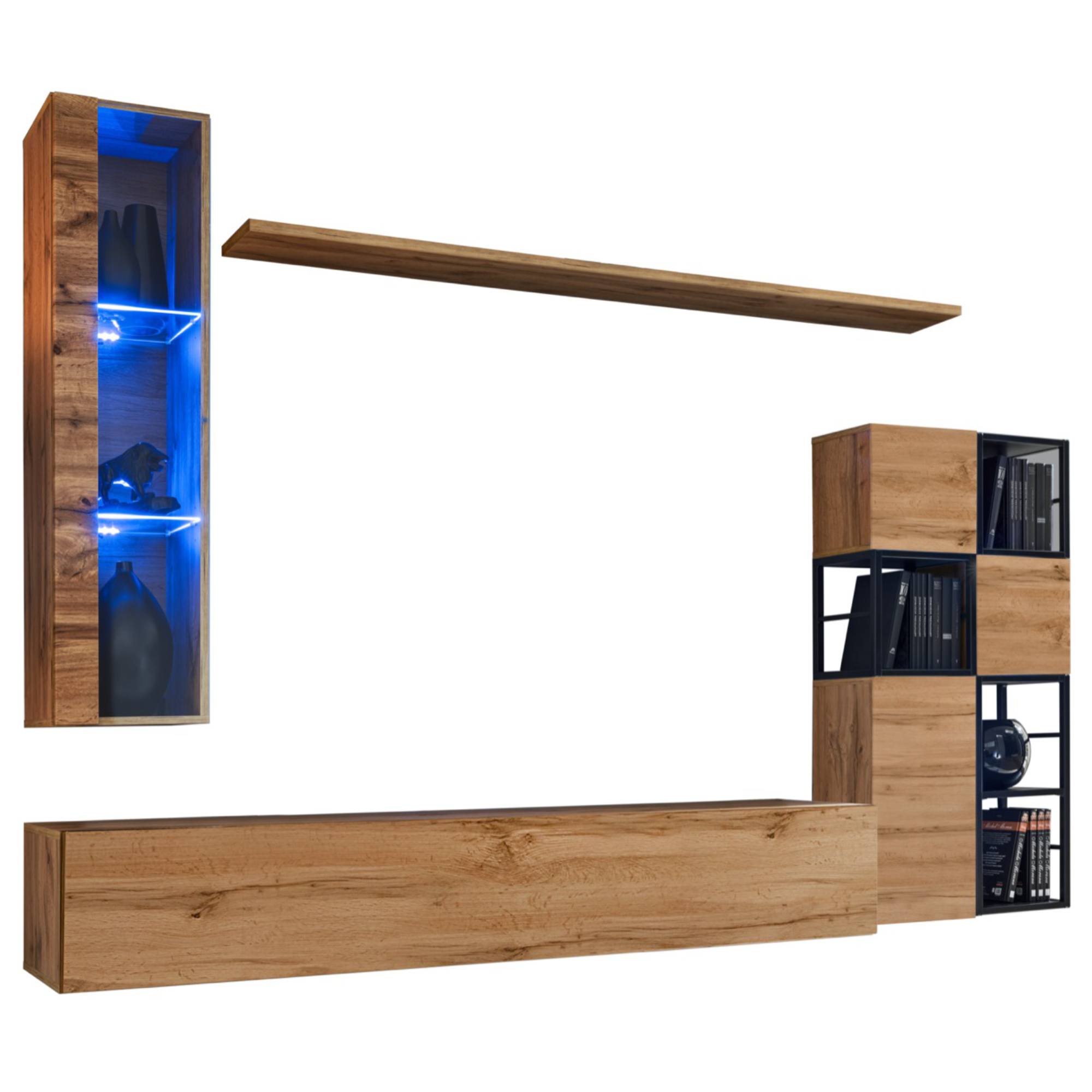 Široká TV komoda, ktorá poskytuje dostatok úložného priestoru na TV príslušenstvo je prakticky rozdelená na tri časti. Dopĺňajú ju tri závesné skrinky a tri kovové nástenné regály. Presklená vitrína ponúka miesto na uloženie zberateľských predmetov. Je doplnená o LED osvetlenie, ktoré pridáva na futuristickom vzhľade. Stenu dopĺňa dlhá polica vhodná na umiestnenie rastlín, fotografií alebo dekorácií. Obývacia stena je vyrobená z laminovaného dreveného materiálu s kovovými a sklenenými prvkami.