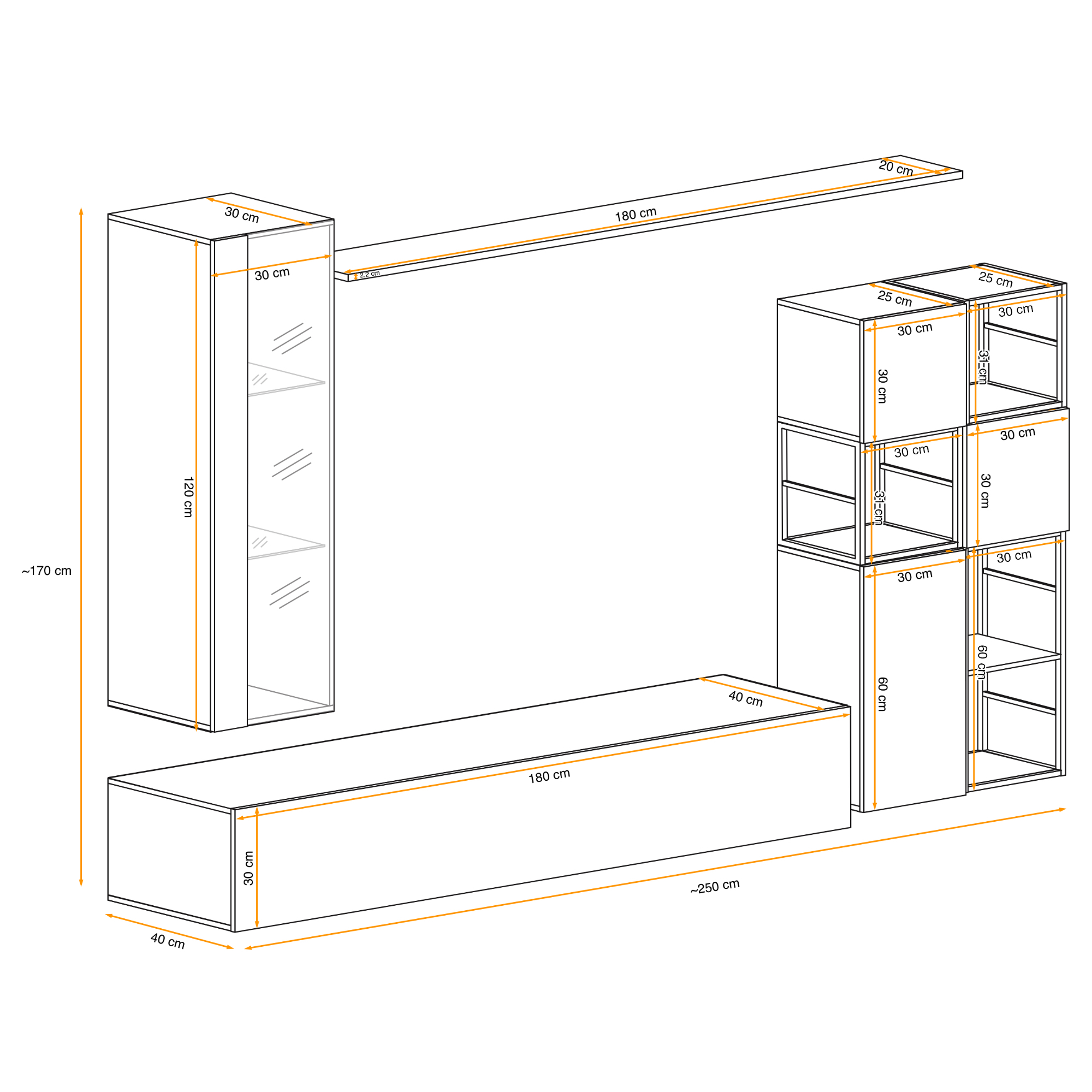 - Skladá sa z: Nástenná TV komoda, nástenná vitrína, 3x nástenná skrinka, 3x nástenný regál, polica