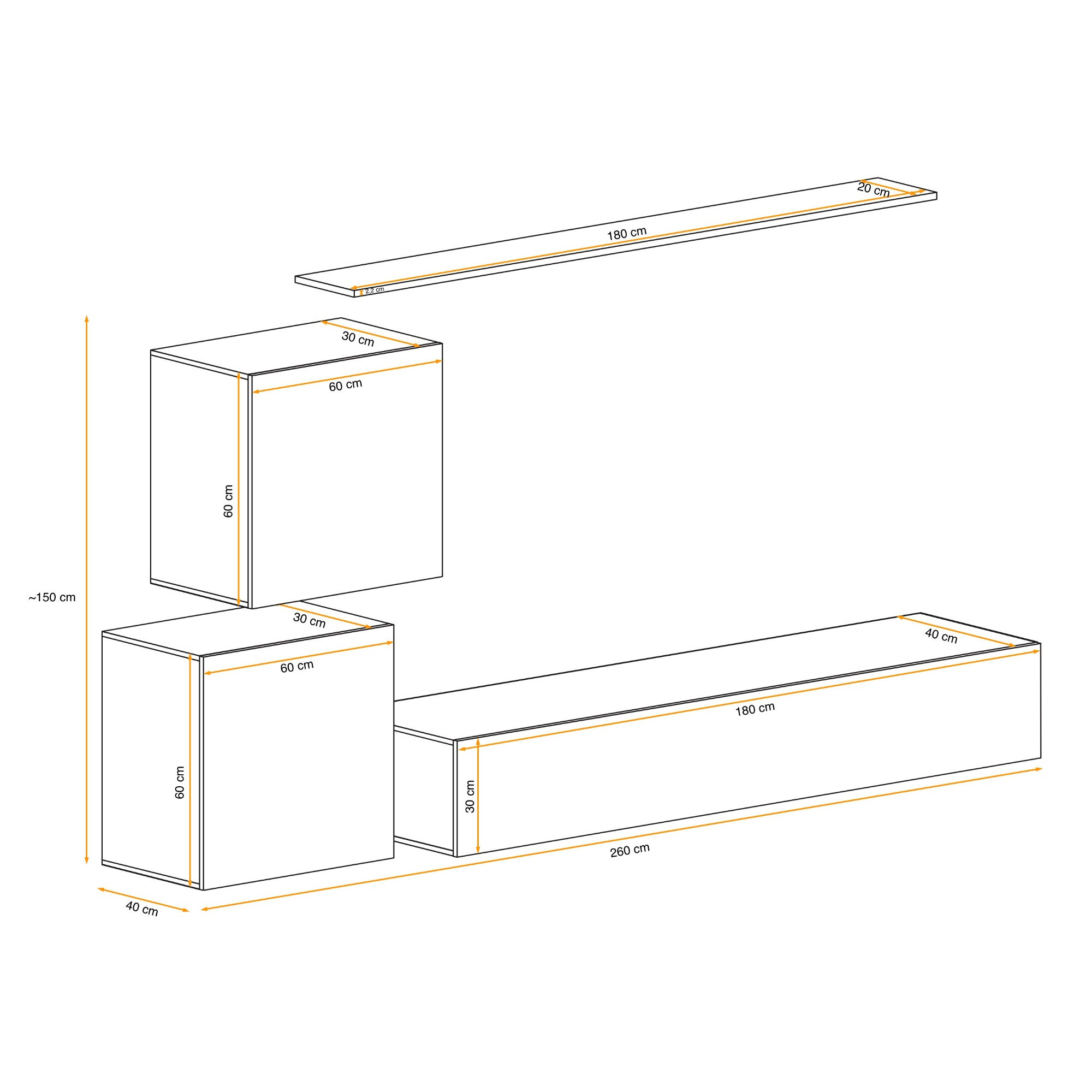| Časť 1 (ŠxVxH) | Nástenná TV komoda: 180x30x40 cm |