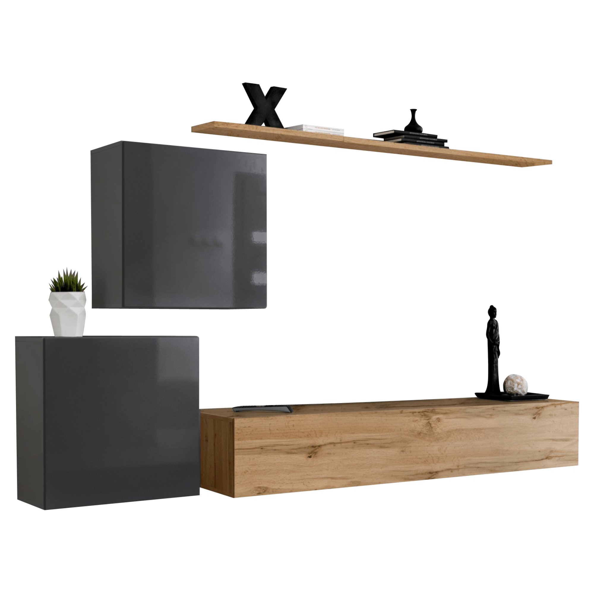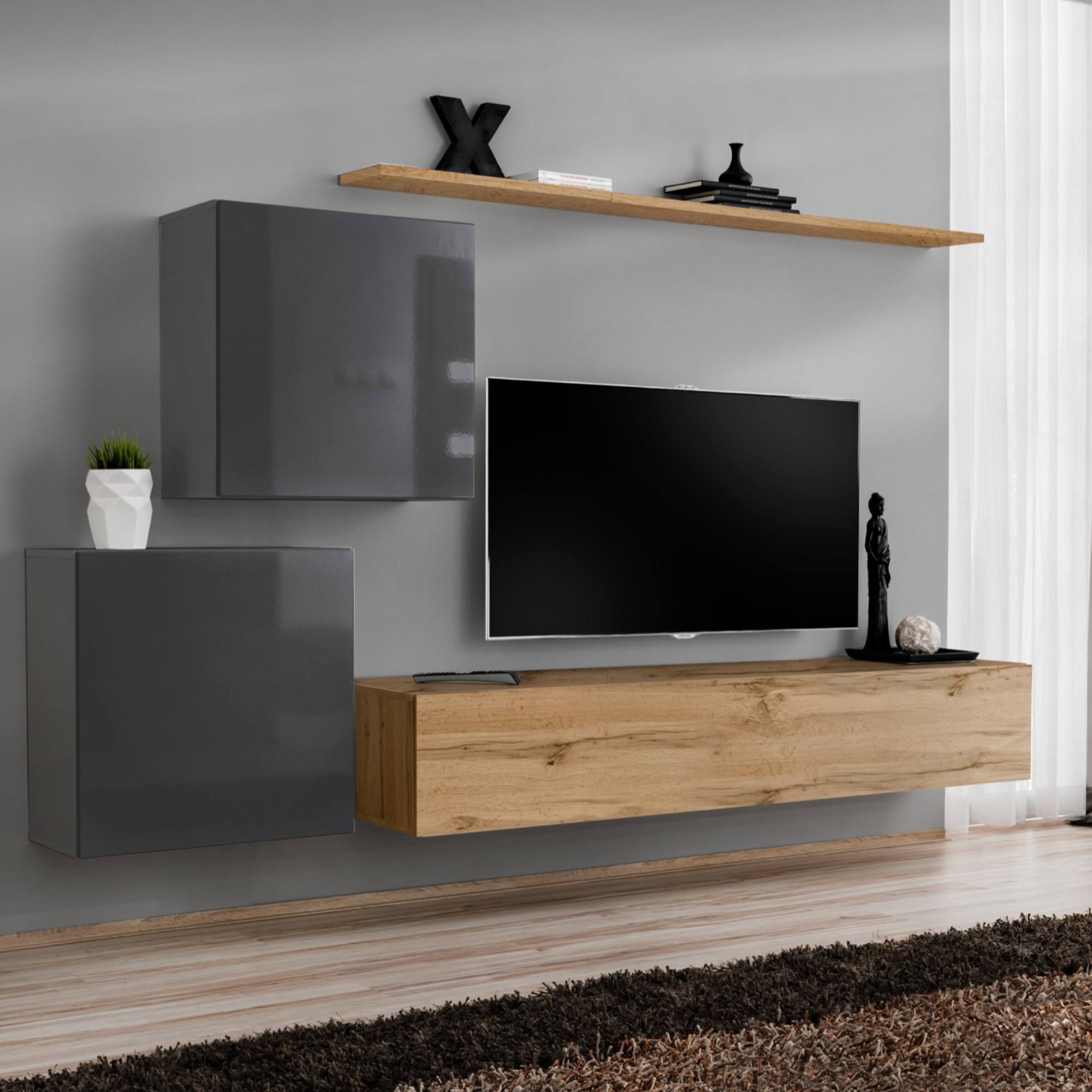 Nástenná TV komoda disponuje uzavretým úložným priestorom, ale aj rozsiahlym odkladacím priestorom, ktorý poskytuje dostatok miesta na TV príslušenstvo a ďalšie nevyhnutnosti. Súčasťou zostavy sú dva závesné uzatvárateľné bloky, ktoré ponúkajú ďalšie úložné miesto a perfektne tak využívajú vertikálny priestor. Stenu dopĺňa nástenná polica, ktorá prakticky vyplní prázdny priestor nad TV. Využijete ju predovšetkým na uloženie rastlín, fotografií alebo ďalších dekoračných predmetov na zútulnenie obývacieho priestoru. Obývacia stena je vyrobená z laminovaného dreveného materiálu, ktorý nie je náročný na údržbu. Vybrať si môžete hneď z niekoľkých vyhotovení.