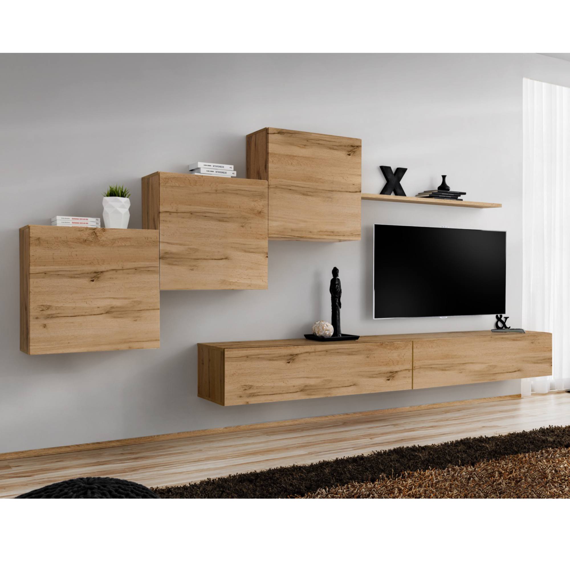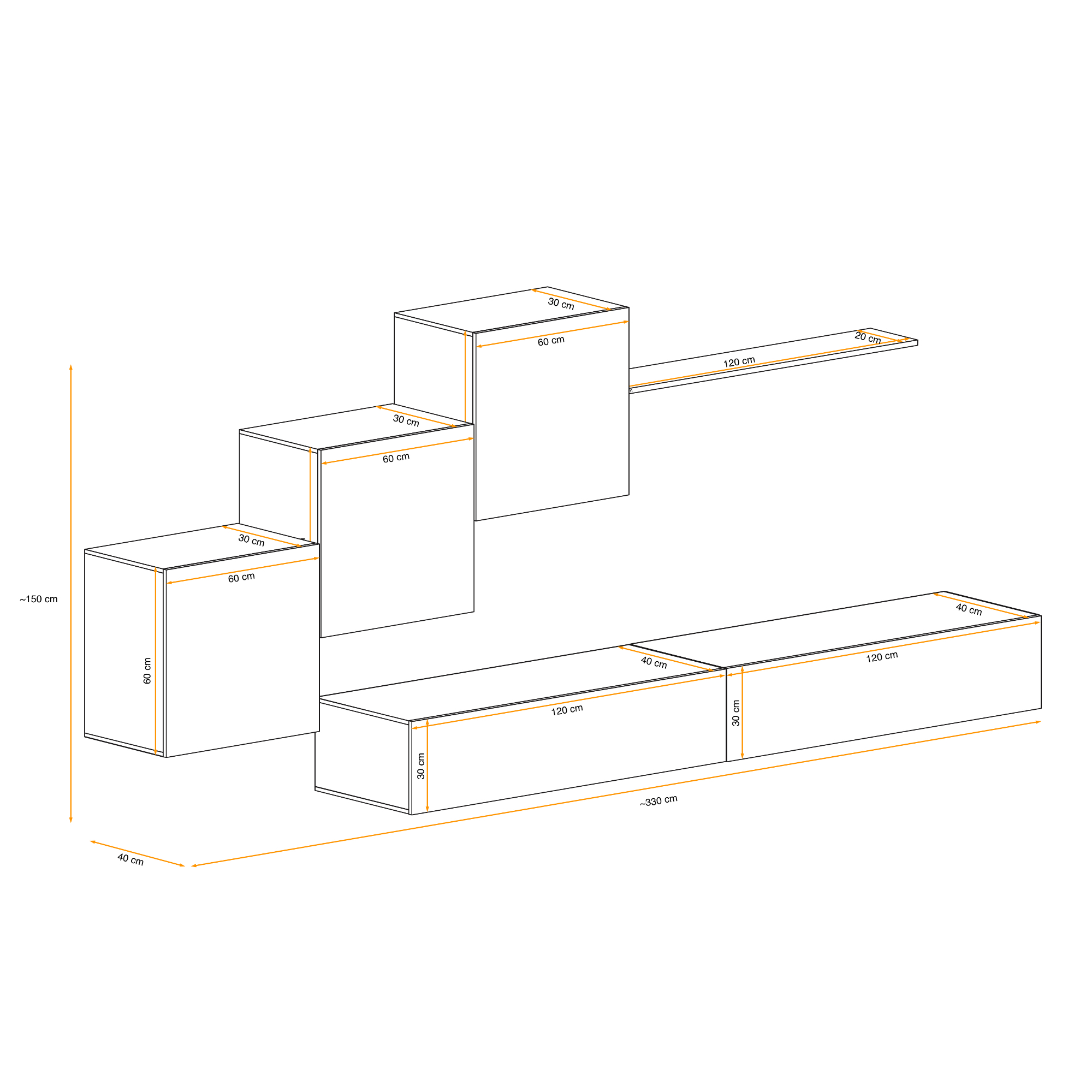Zostavu tvorí široká TV komoda s výklopnými dvierkami, ktorá poskytuje veľké množstvo úložného priestoru aj povrchového odkladacieho miesta na všetky nevyhnutnosti. Tri nástenné uzatvárateľné bloky sú vloženou policou prakticky rozdelené na dve časti. Stenu dopĺňa šikovná polica, ktorá spoľahlivo vyplní voľný priestor nad TV. Hodiť sa bude predovšetkým na vystavenie rastlinnej zbierky, rodinných fotografií, suvenírov z ciest alebo ďalších dekoračných predmetov.