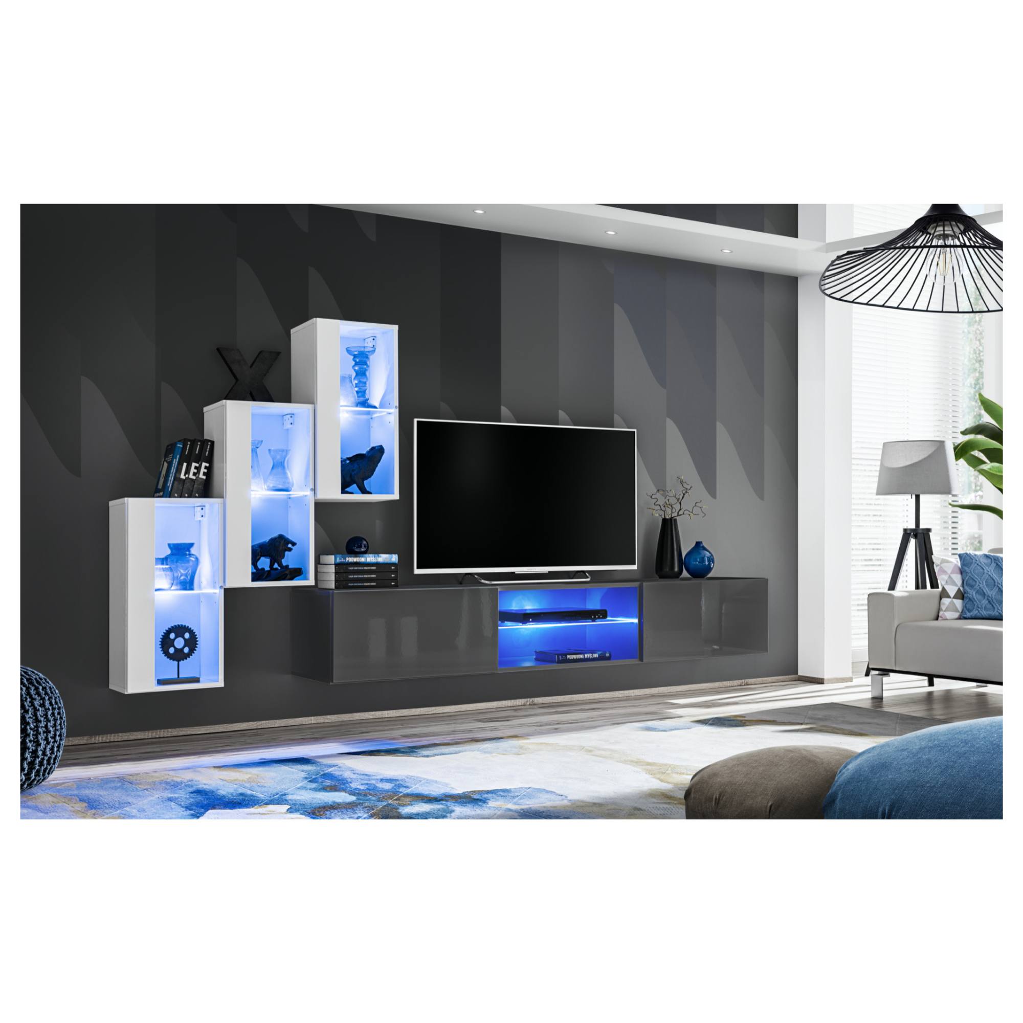 Široká nástenná TV komoda je vybavená uzatvárateľným úložným priestorom, ktorý je skrytý za 2 výklopnými dvierkami vo vysokom lesku. Prostredná časť bez dvierok je doplnená o LED osvetlenie. Každá z 3 závesných vitrín je vybavená sklenenou vloženou policou. Vďaka osvetleniu sa jedná o skvelý spôsob, ako predviesť svoju zberateľskú vášeň priateľom a rodine.