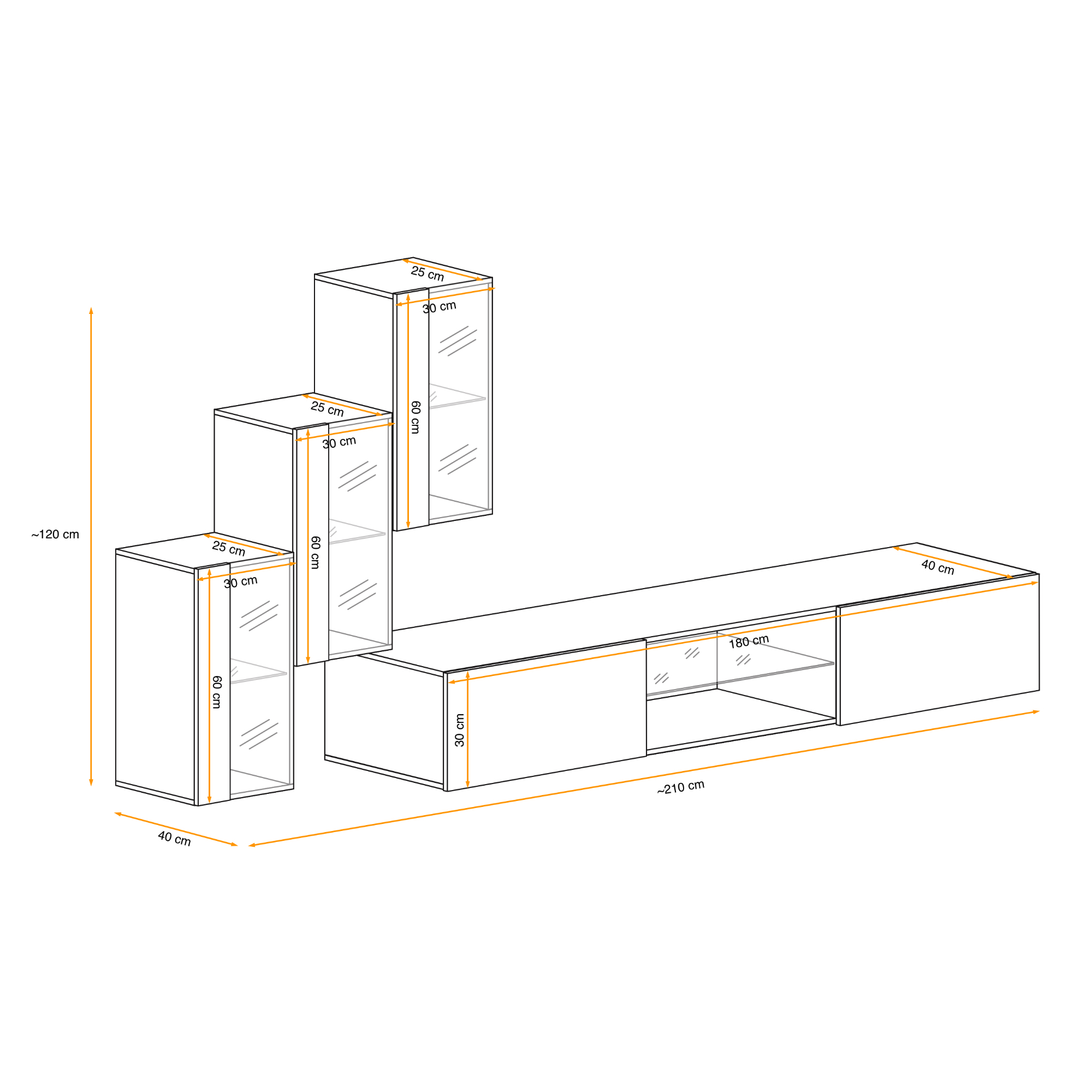 - Skladá sa z: Nástenná TV komoda, 3x nástenná vitrína