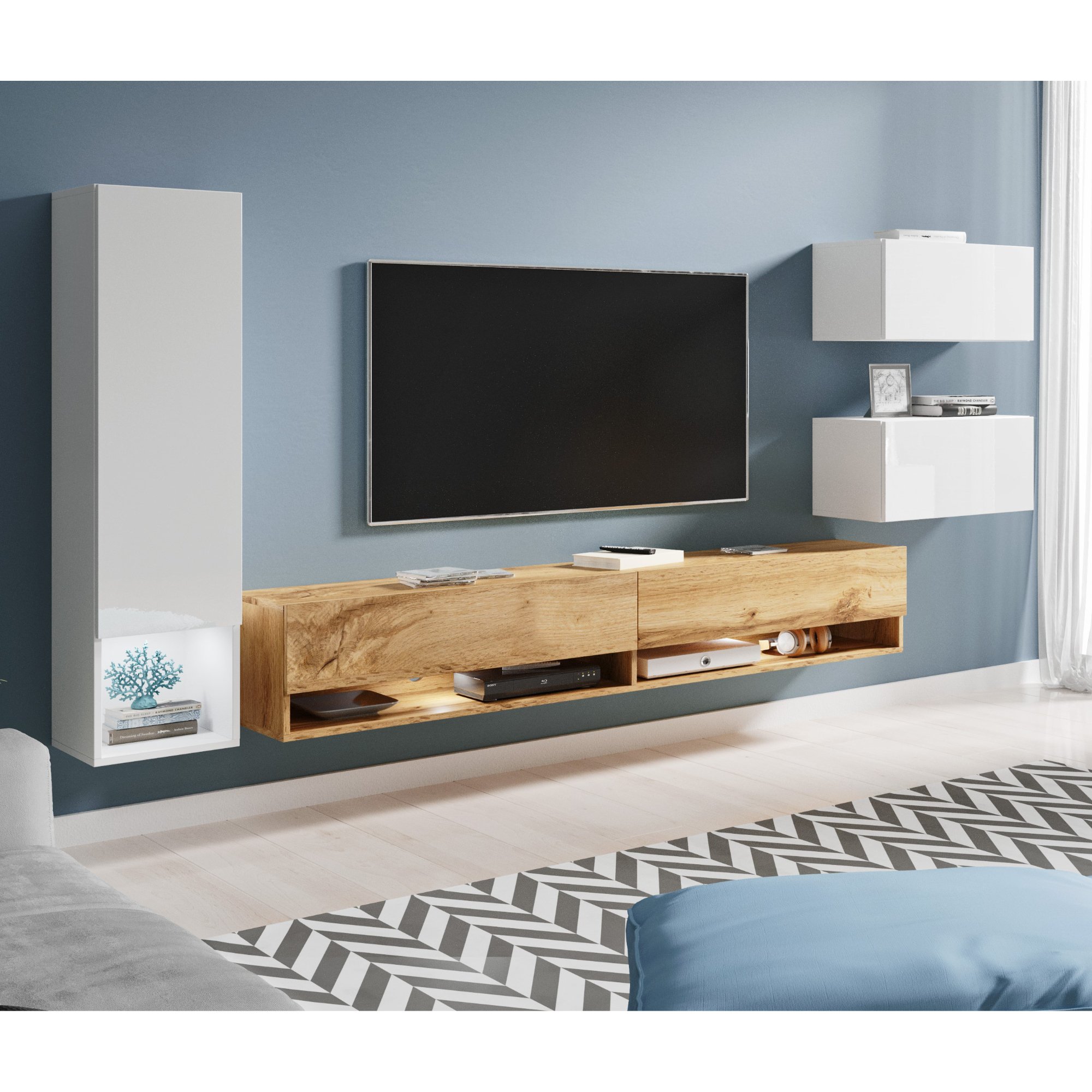 Súčasťou tejto zostavy sú 2 skrinky s výklopnými dvierkami, 1 skrinka s otočnými dvierkami a TV komoda. TV komoda disponuje 2 otvormi na kabeláž a ponúka dostatok priestoru na uloženie TV príslušenstva a ďalších potrebných predmetov. Skrinka s otočnými dvierkami je vybavená 4 vloženými policami, ktoré vám umožnia prehľadne si usporiadať všetky veci, ktoré sa rozhodnete do nej umiestniť. Skrinky s výklopnými dvierkami sú zasa ideálne na uloženie drobností.