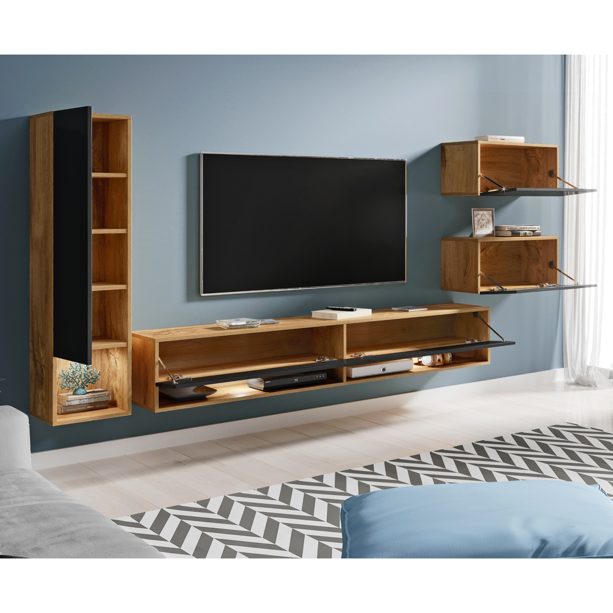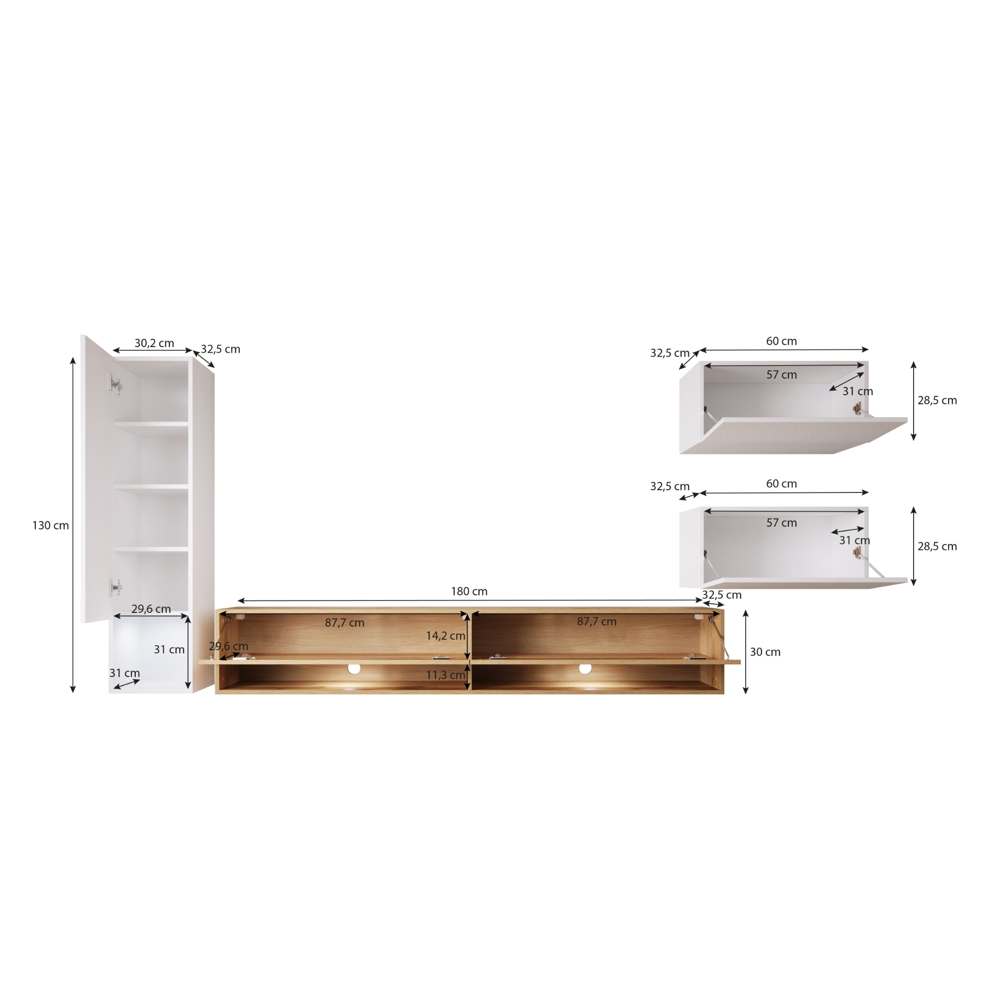 Súčasťou tejto zostavy sú 2 skrinky s výklopnými dvierkami, 1 skrinka s otočnými dvierkami a TV komoda. TV komoda disponuje 2 otvormi na kabeláž a ponúka dostatok priestoru na uloženie TV príslušenstva a ďalších potrebných predmetov. Skrinka s otočnými dvierkami je vybavená 4 vloženými policami, ktoré vám umožnia prehľadne si usporiadať všetky veci, ktoré sa rozhodnete do nej umiestniť. Skrinky s výklopnými dvierkami sú zasa ideálne na uloženie drobností.