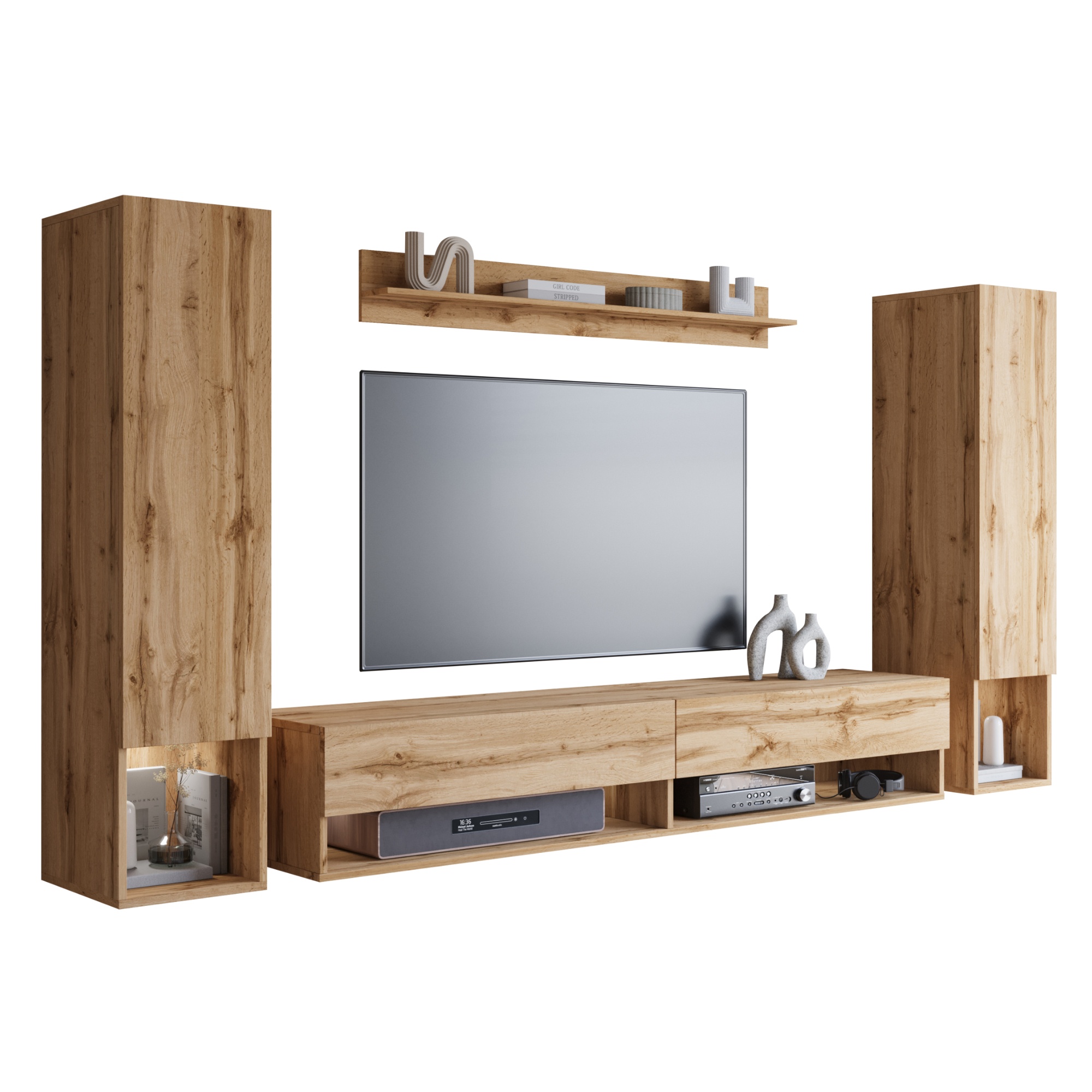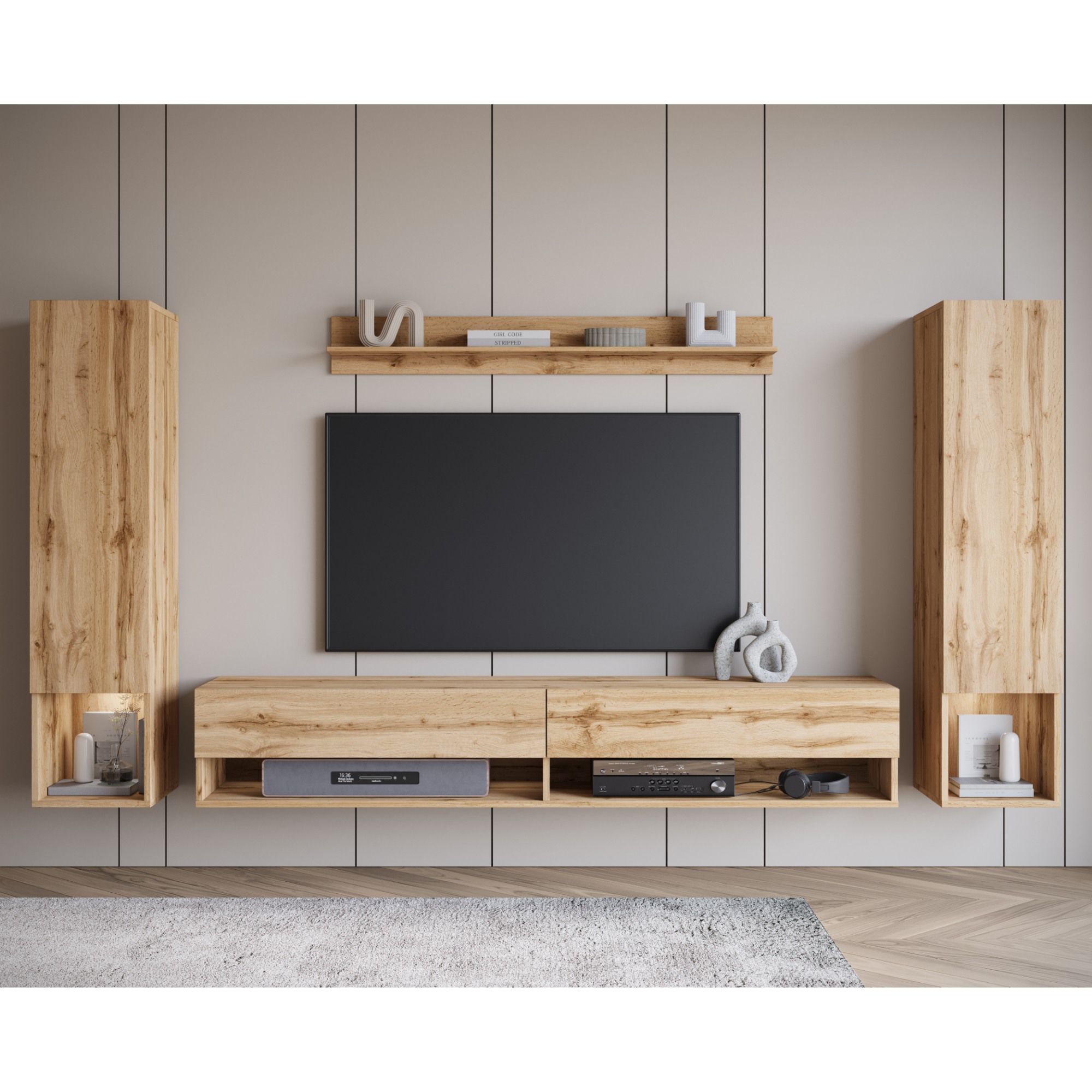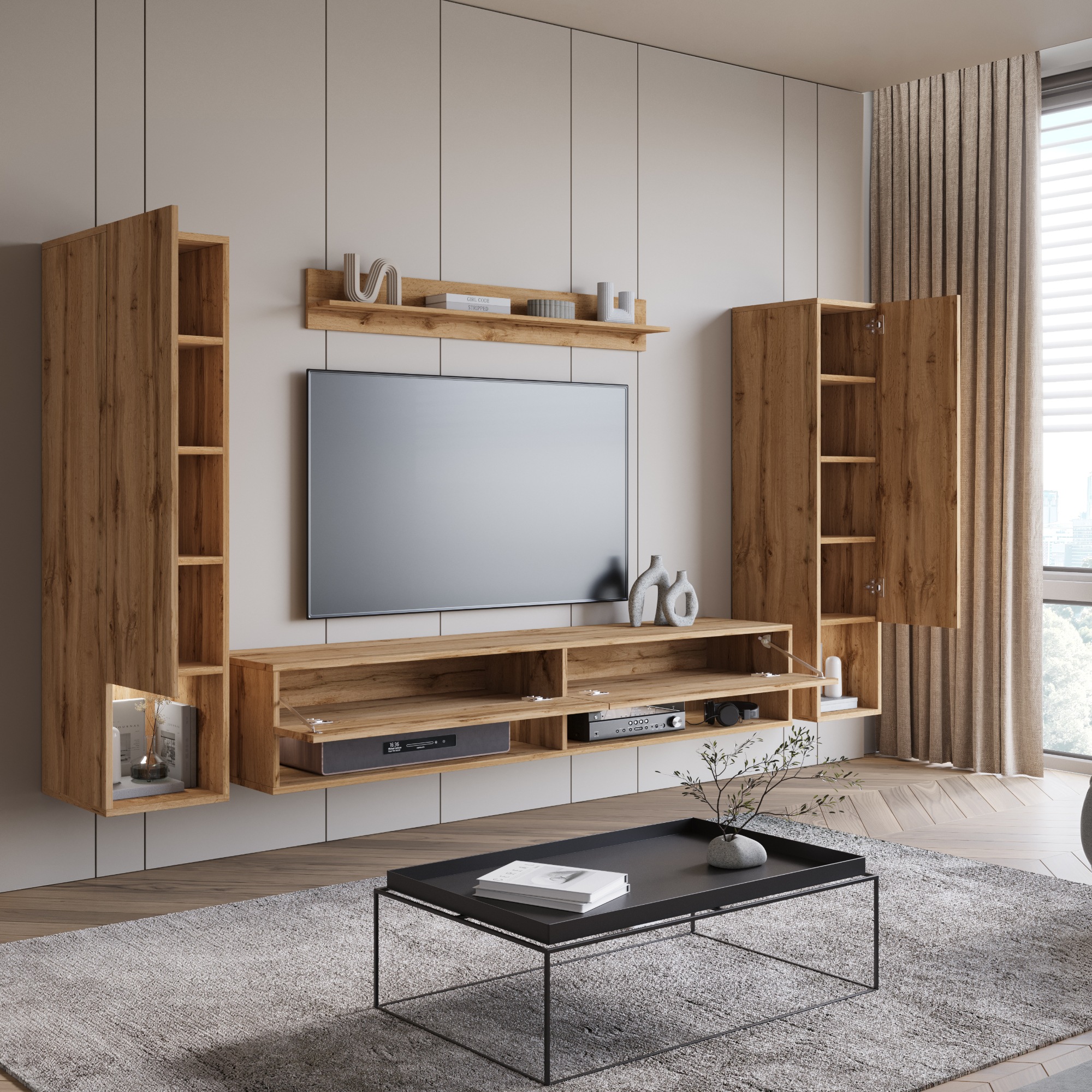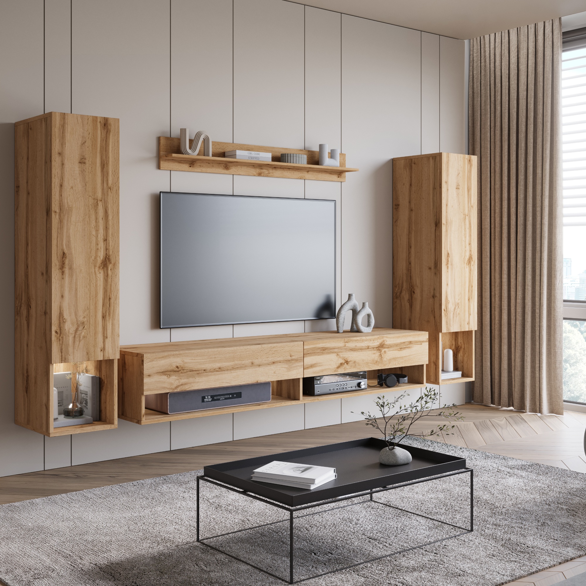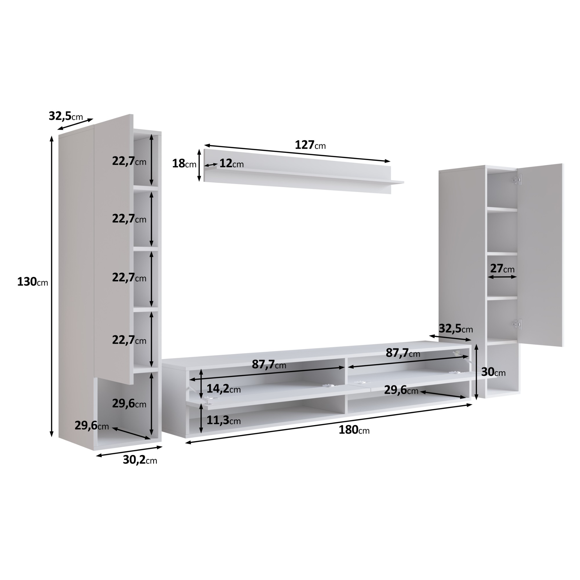 Súčasťou tejto zostavy sú 2 skrinky, nástenná polica a TV komoda. TV komoda ponúka dostatok priestoru na uloženie nielen TV príslušenstva, ale aj ďalších potrebných predmetov. Na nástennú policu zas môžete vystaviť vaše obľúbené dekorácie. Obe skrinky sú vybavené 4 vloženými policami, ktoré vám umožnia prehľadne si usporiadať všetky veci, ktoré sa rozhodnete do nej umiestniť.