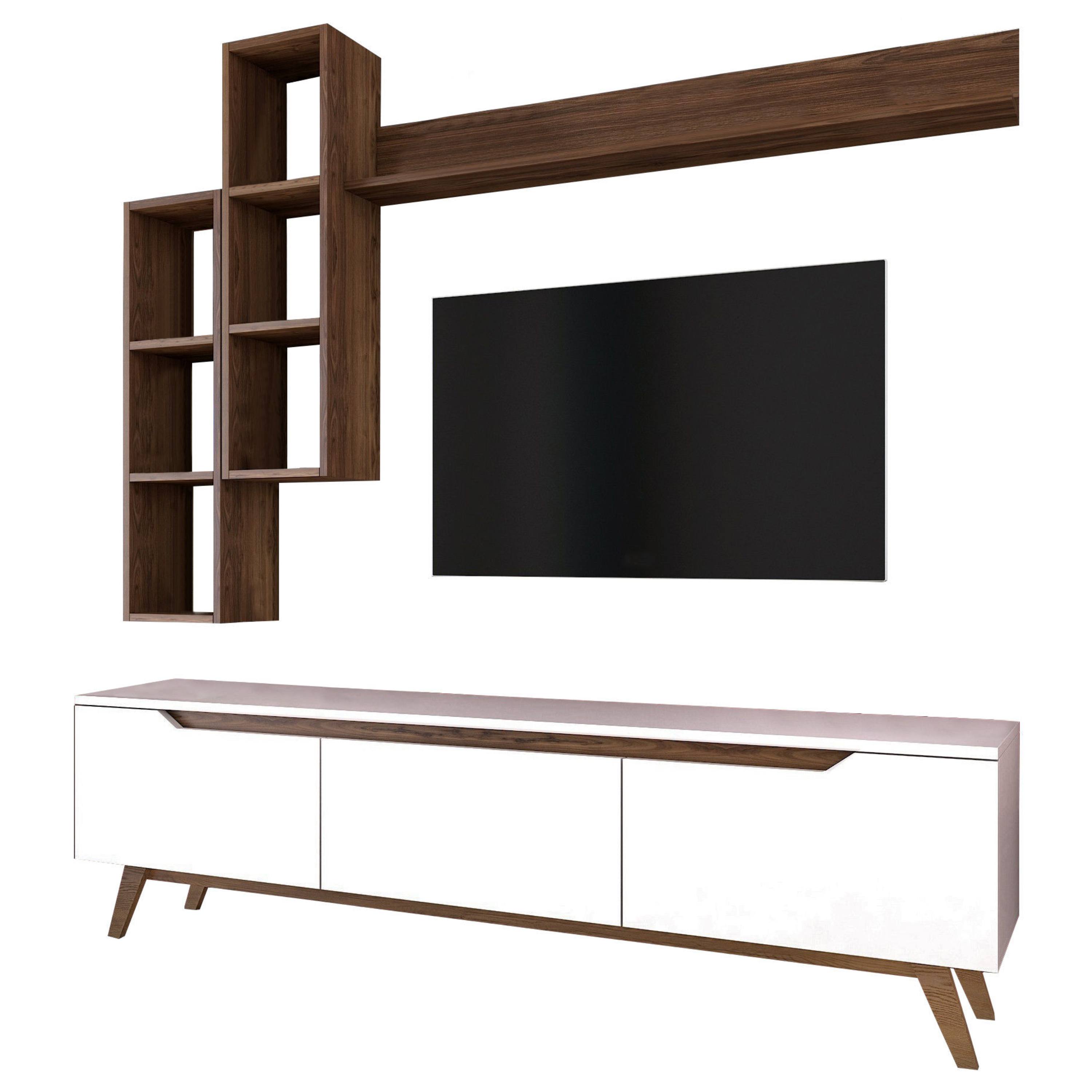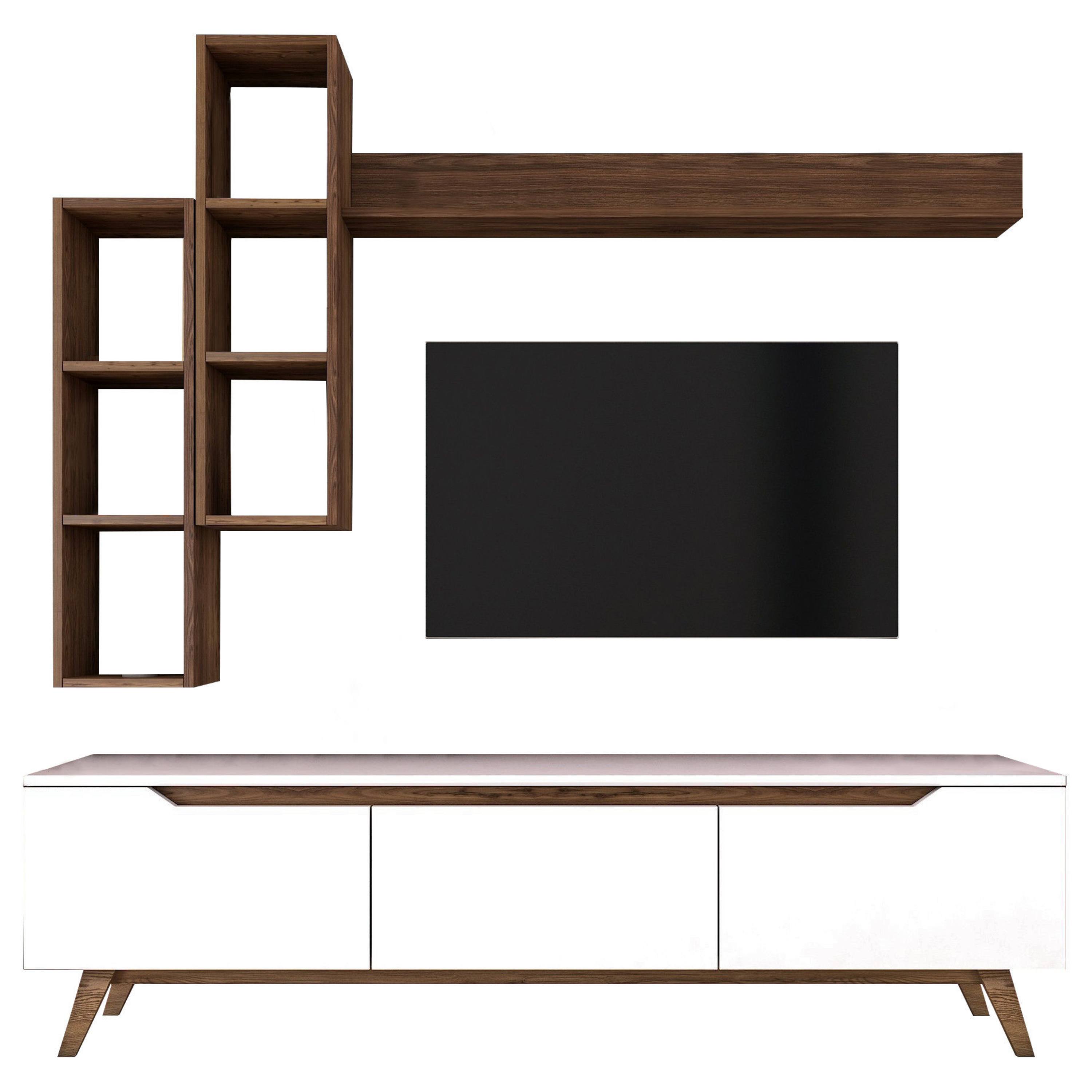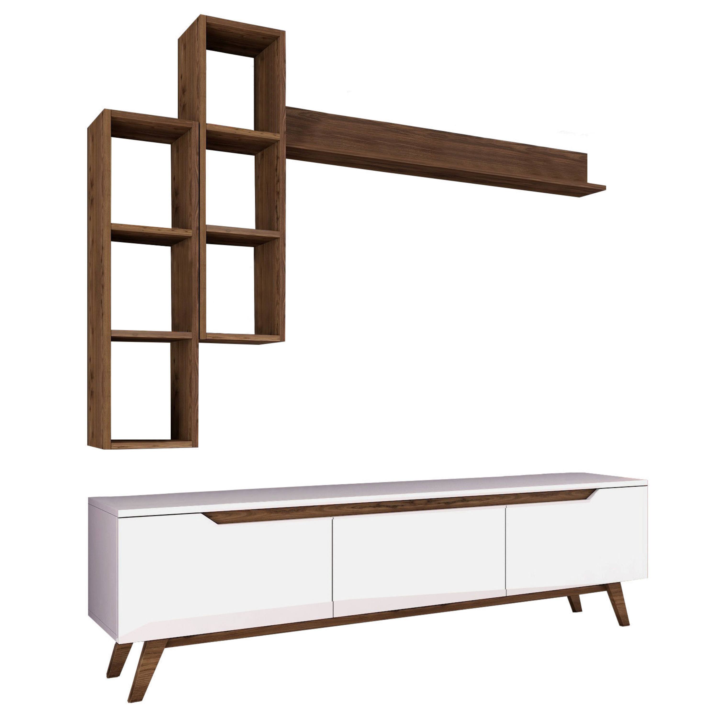 Vyrobená je z laminovaného dreveného materiálu, pre ktorý je typická jednoduchá údržba a dlhá životnosť. Kombinovaný úložný a odkladací priestor sa skladá z TV komody, z dvoch závesných regálov a z jednej police.