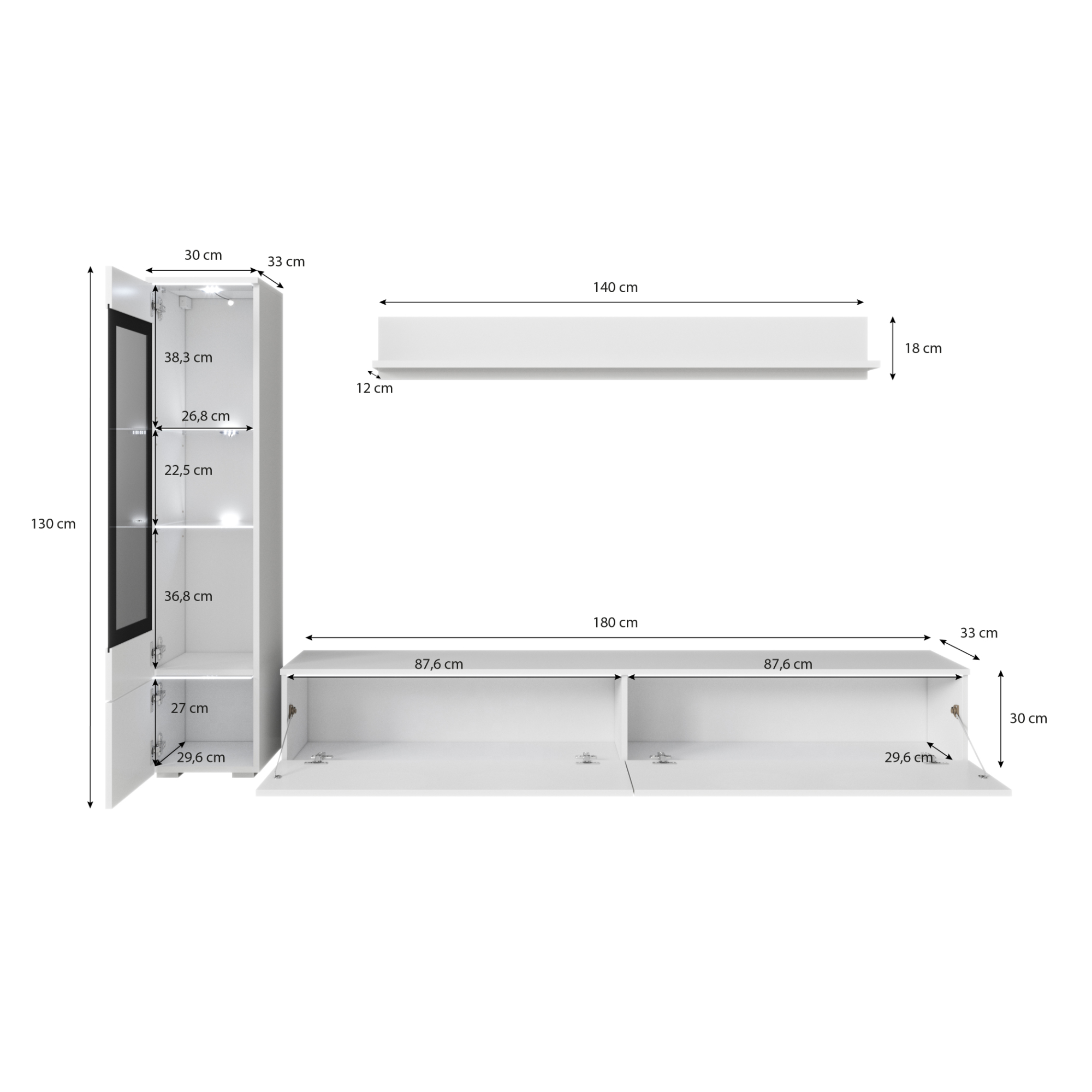 - Skladá sa z: TV komoda, Vitrína, Nástenná polica