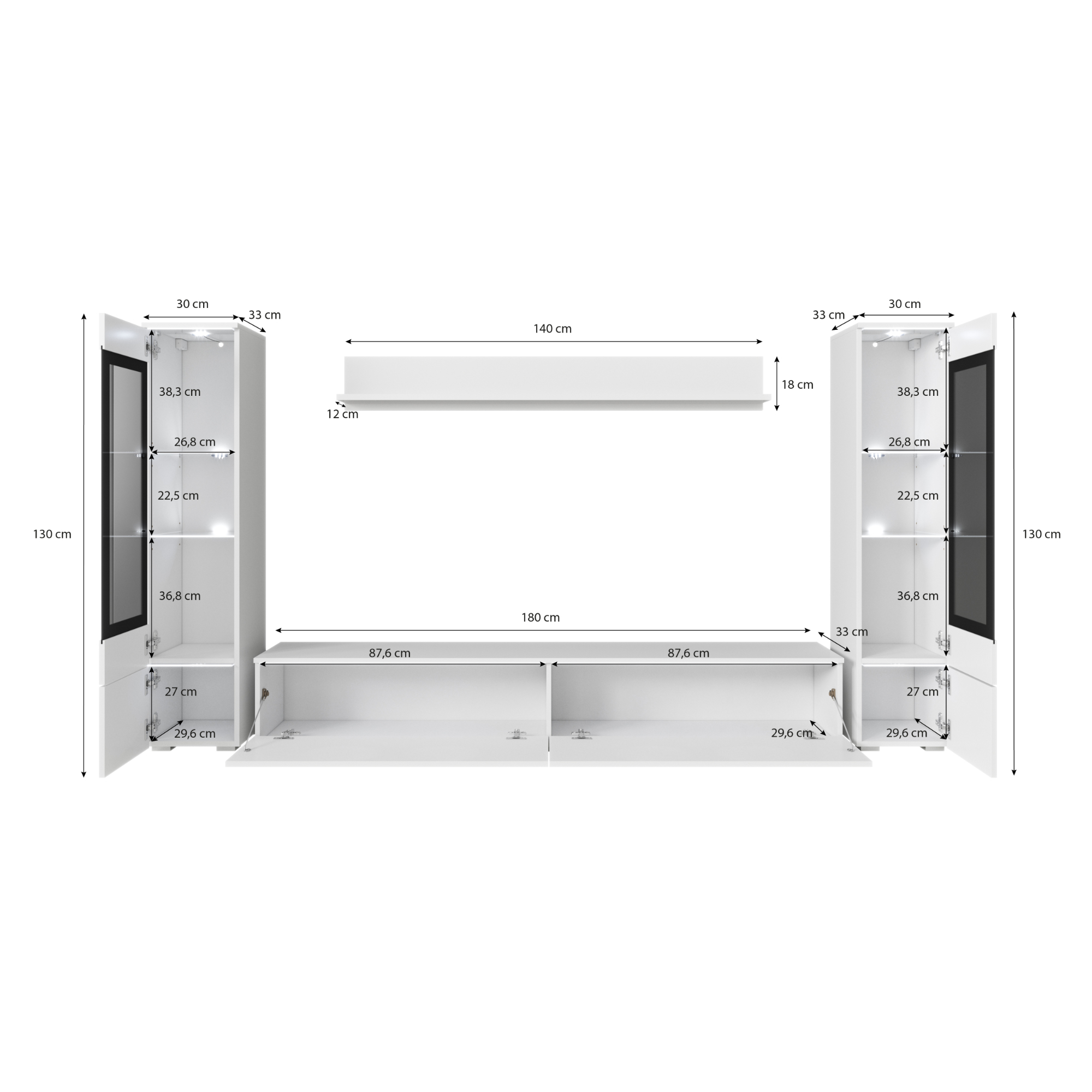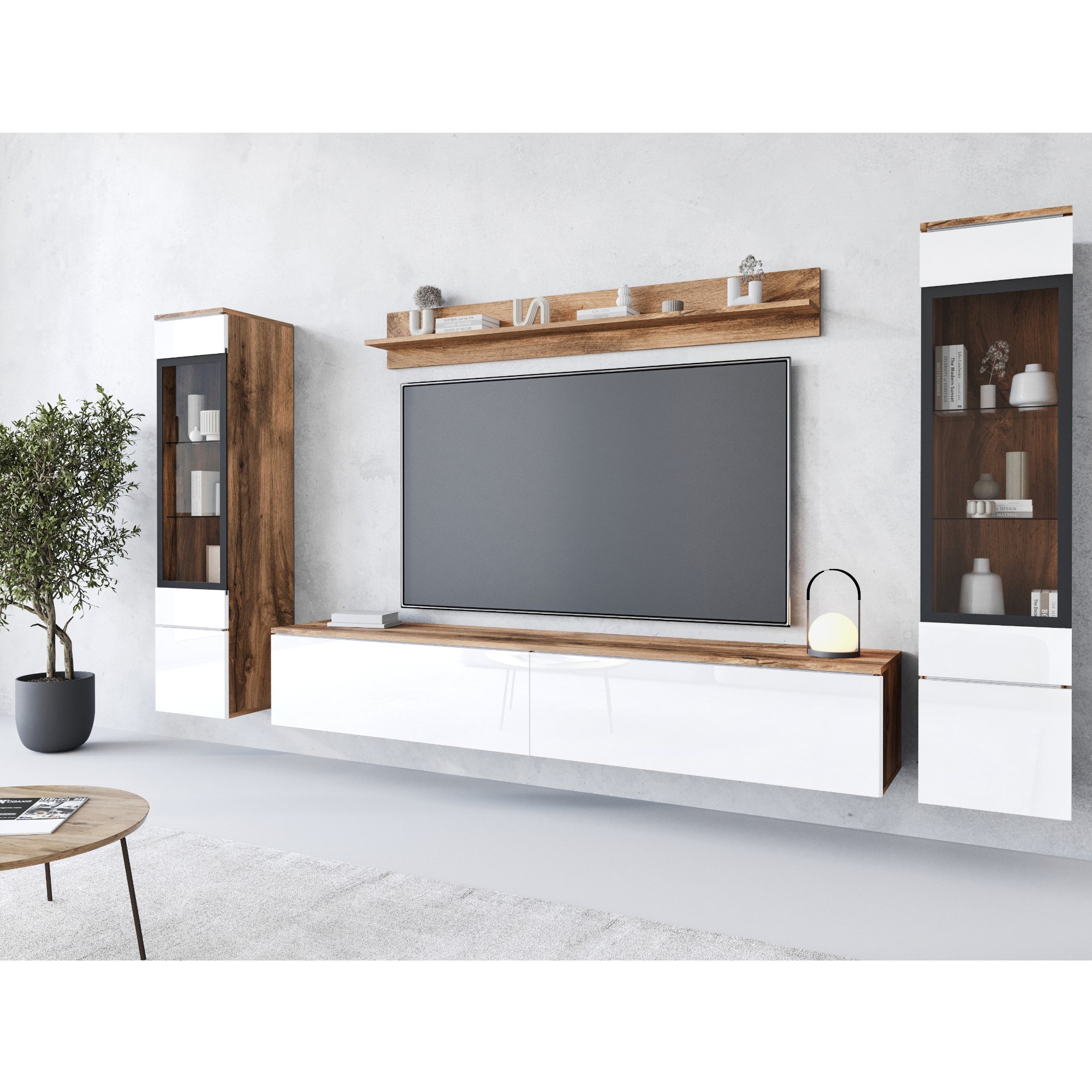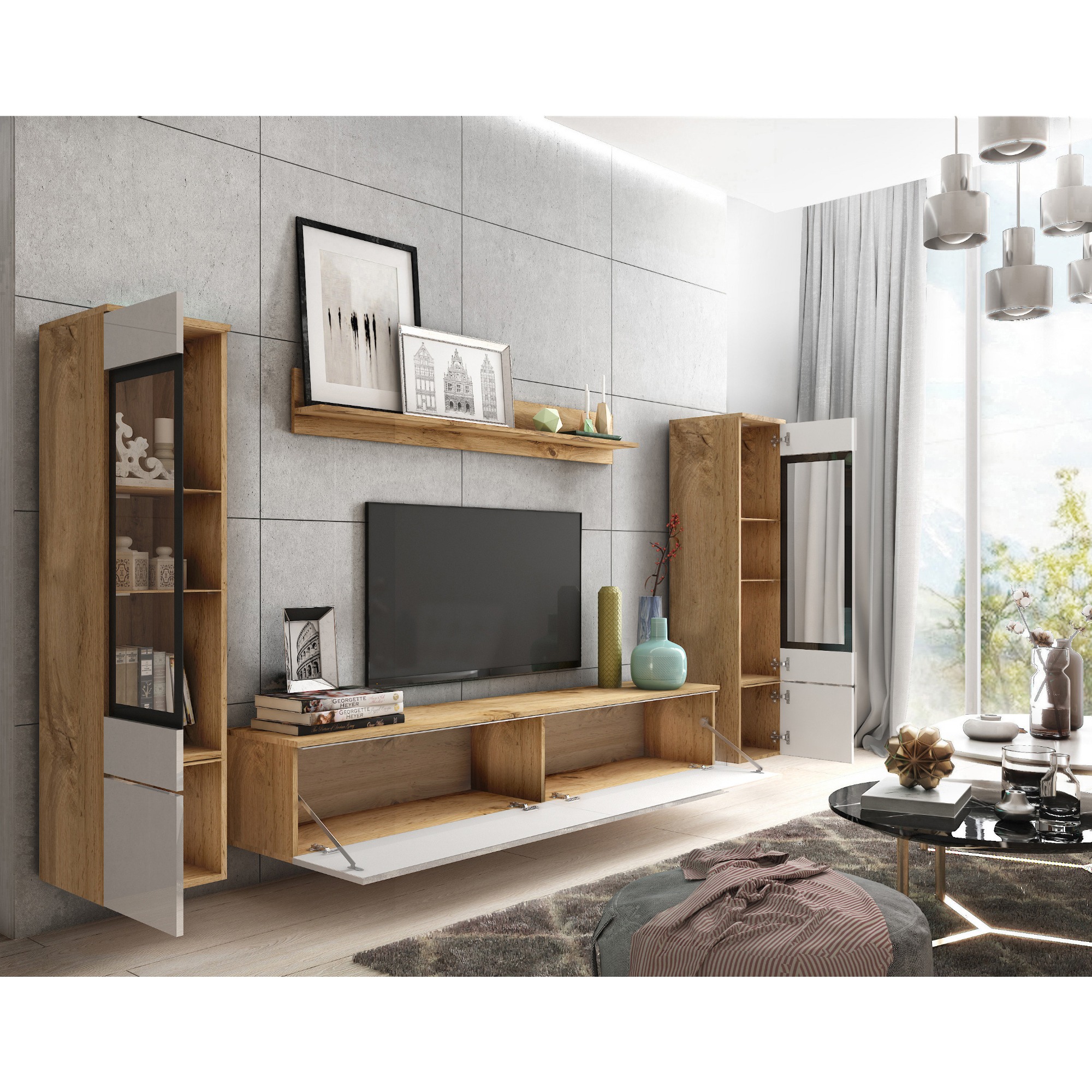 - Skladá sa z: TV komoda, Nástenná polica, 2 vitríny