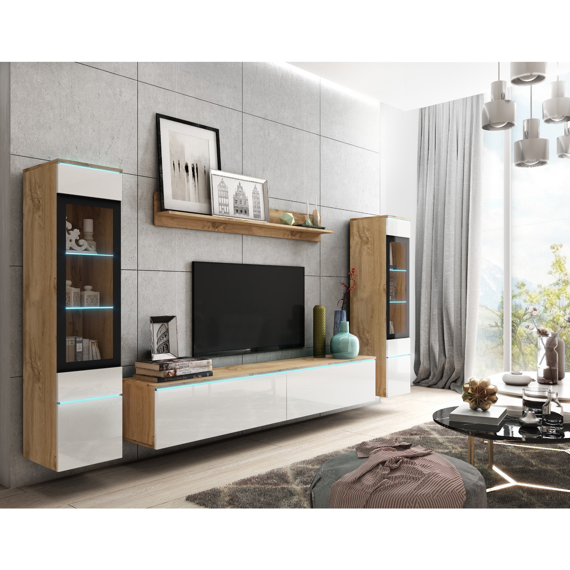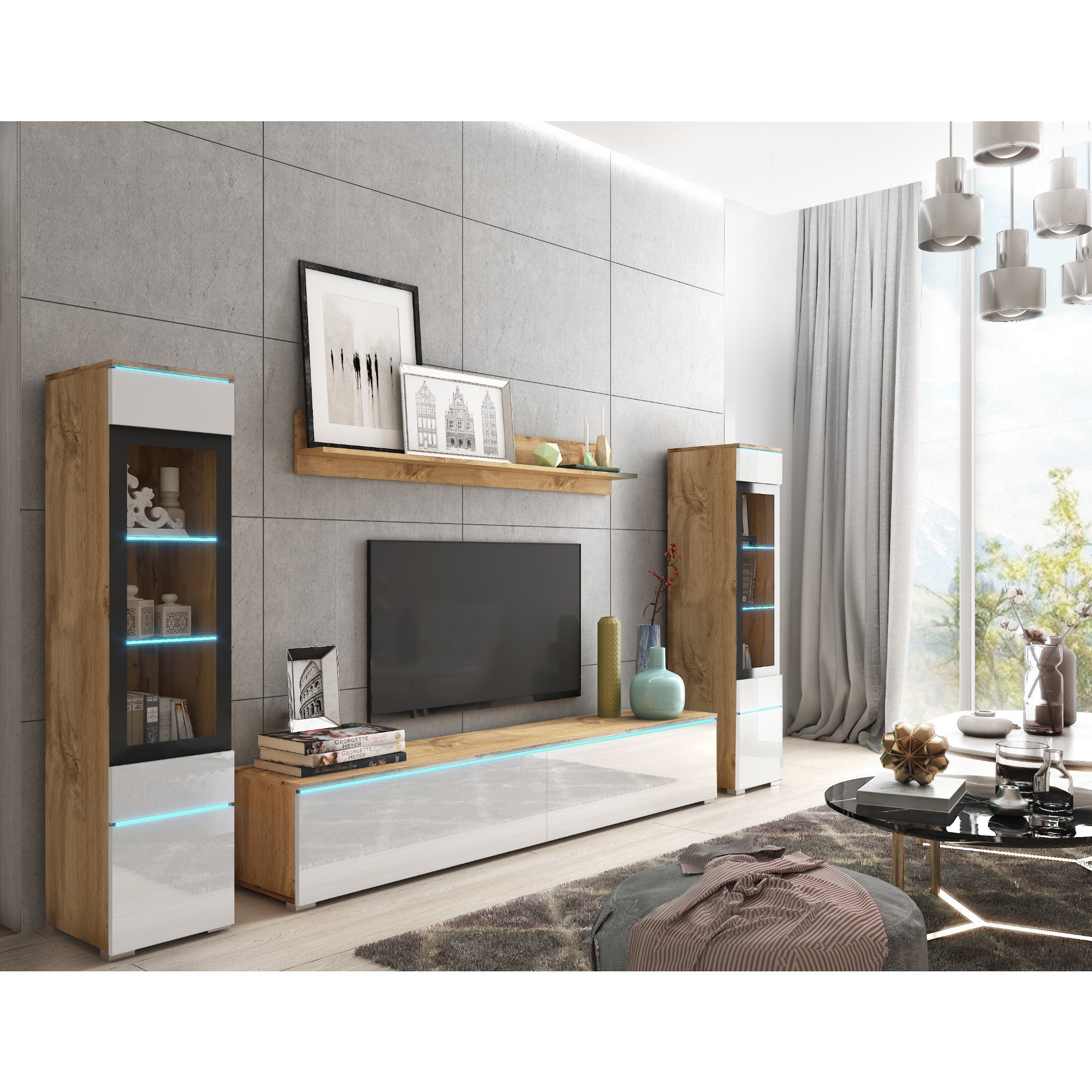 Súčasťou tejto steny je nástenná polica, na ktorú môžete vystaviť vaše obľúbené dekorácie, a TV komoda, do ktorej môžete uložiť nielen TV príslušenstvo. Nechýbajú ani 2 vitríny. Za dvierkami každej vitríny sú umiestnené 3 vložené police. Súčasťou oboch vitrín sú presklené dvierka. Stena je vybavená štýlovým LED osvetlením.