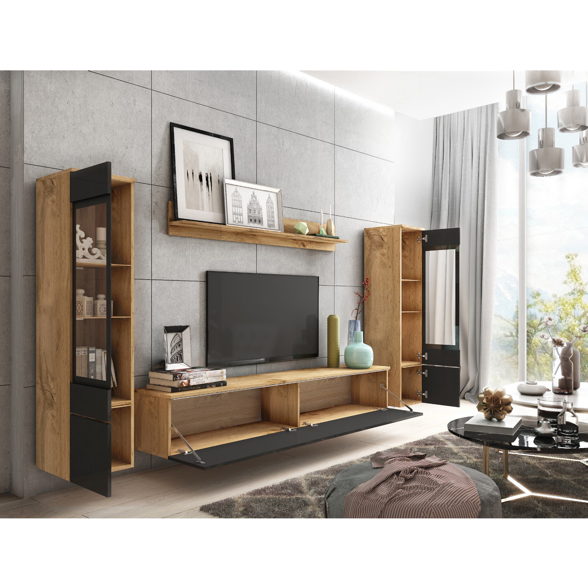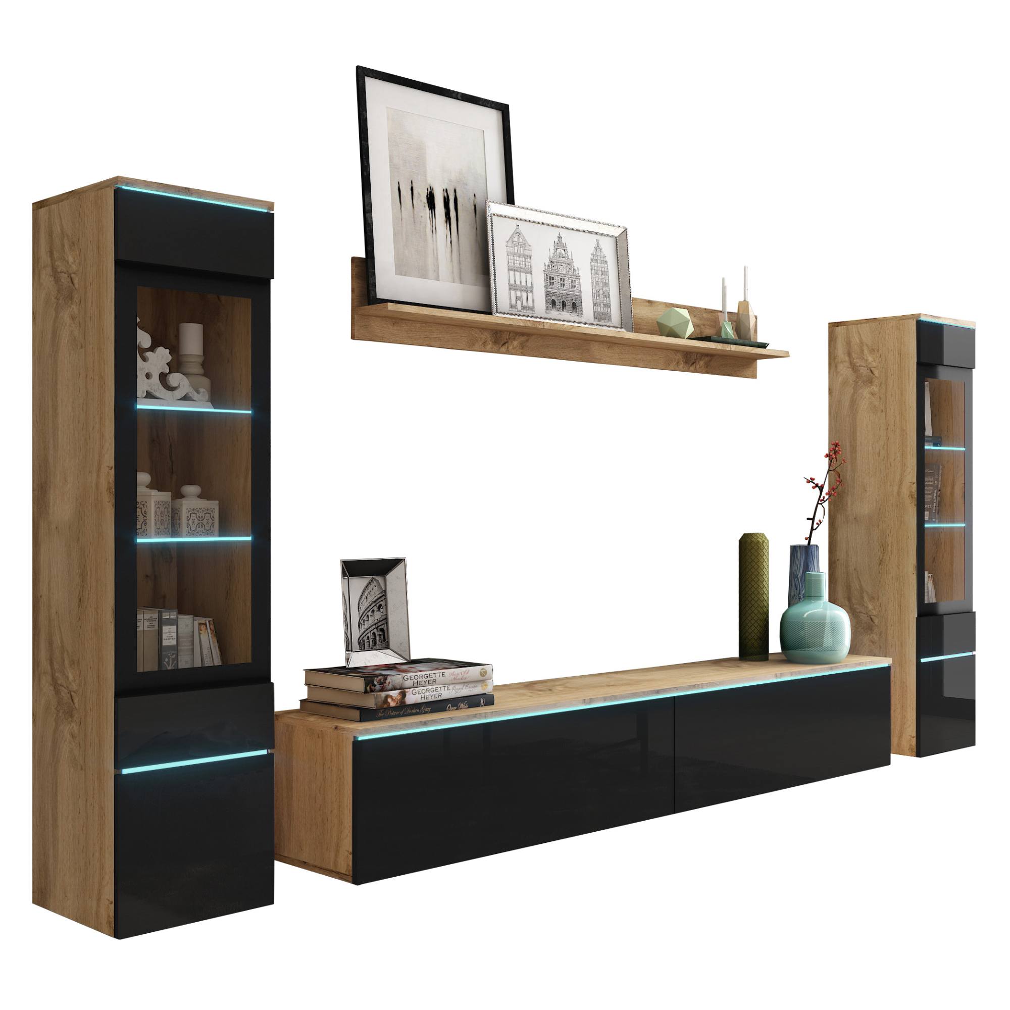 Obývacia stena PAVIA II - dub wotan/čierna lesklá