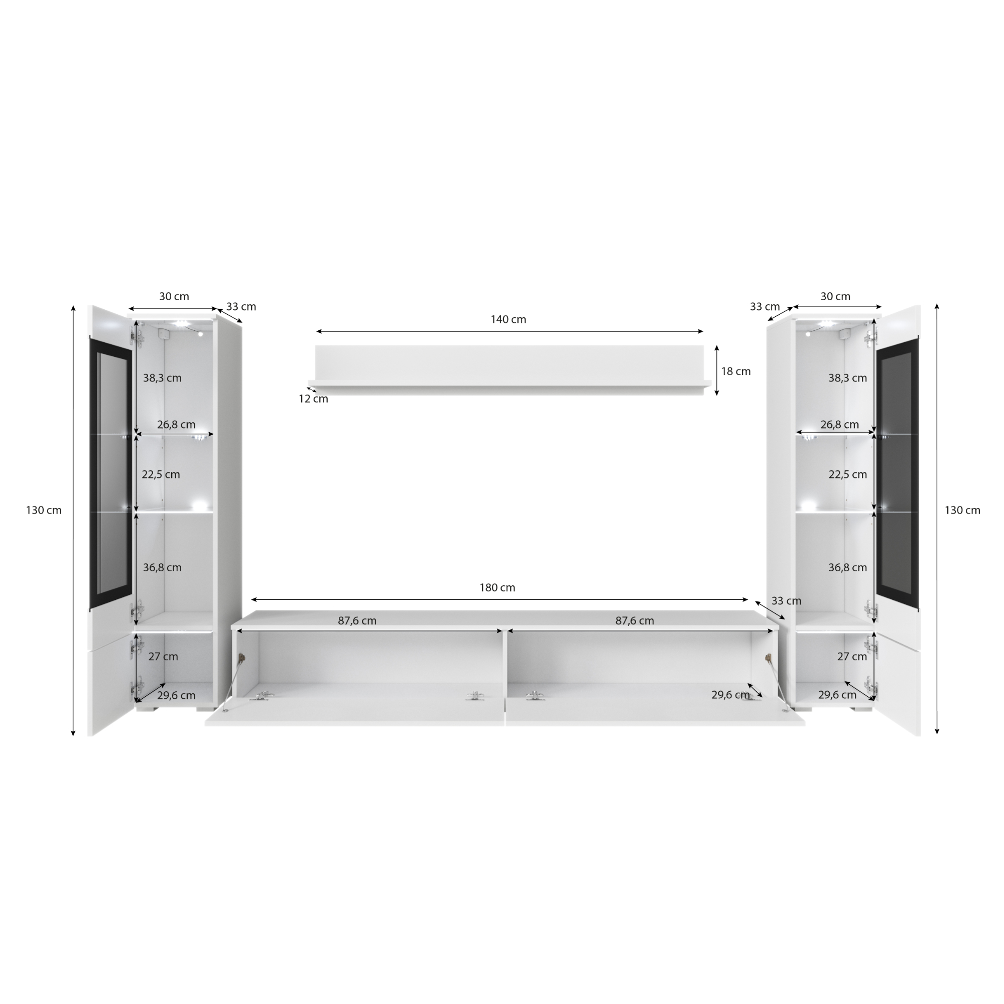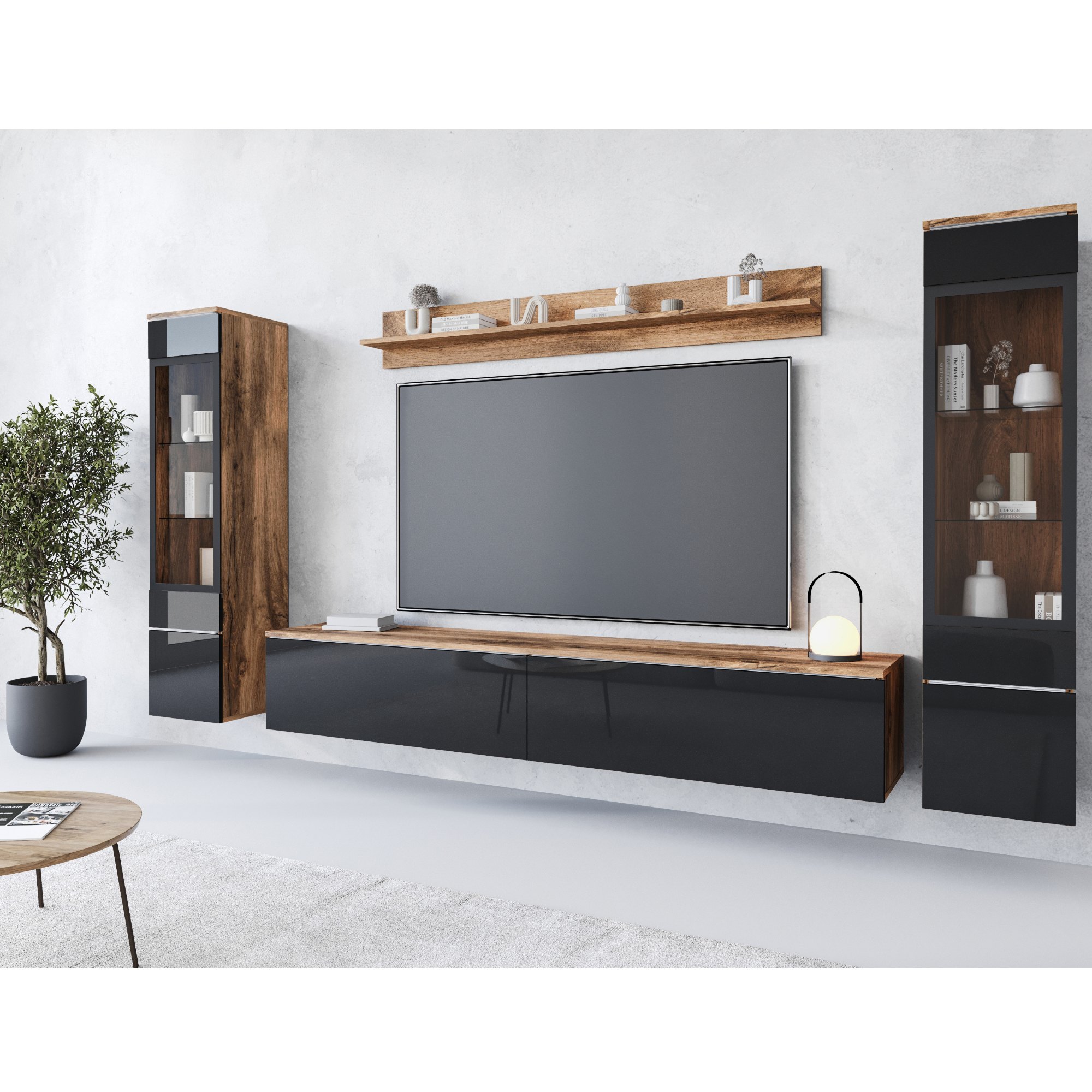 - Skladá sa z: TV komoda, Nástenná polica, 2 vitríny