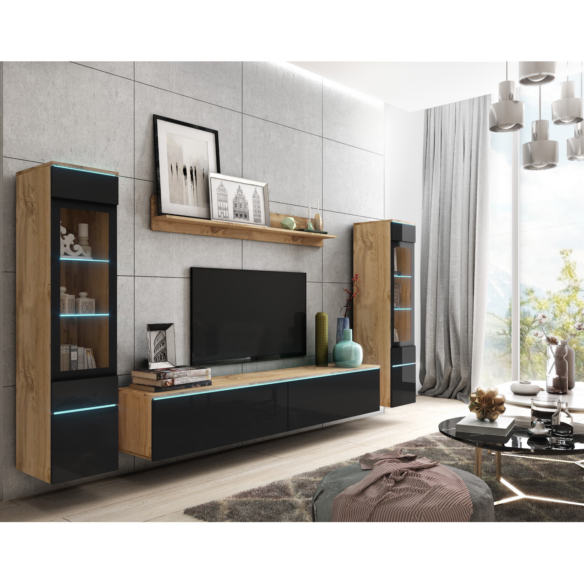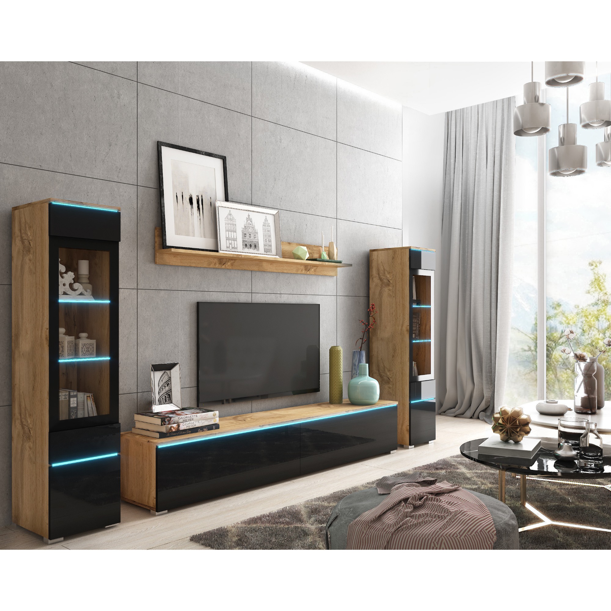 Súčasťou tejto steny je nástenná polica, na ktorú môžete vystaviť vaše obľúbené dekorácie, a TV komoda, do ktorej môžete uložiť nielen TV príslušenstvo. Nechýbajú ani 2 vitríny. Za dvierkami každej vitríny sú umiestnené 3 vložené police. Súčasťou oboch vitrín sú presklené dvierka. Stena je vybavená štýlovým LED osvetlením.
