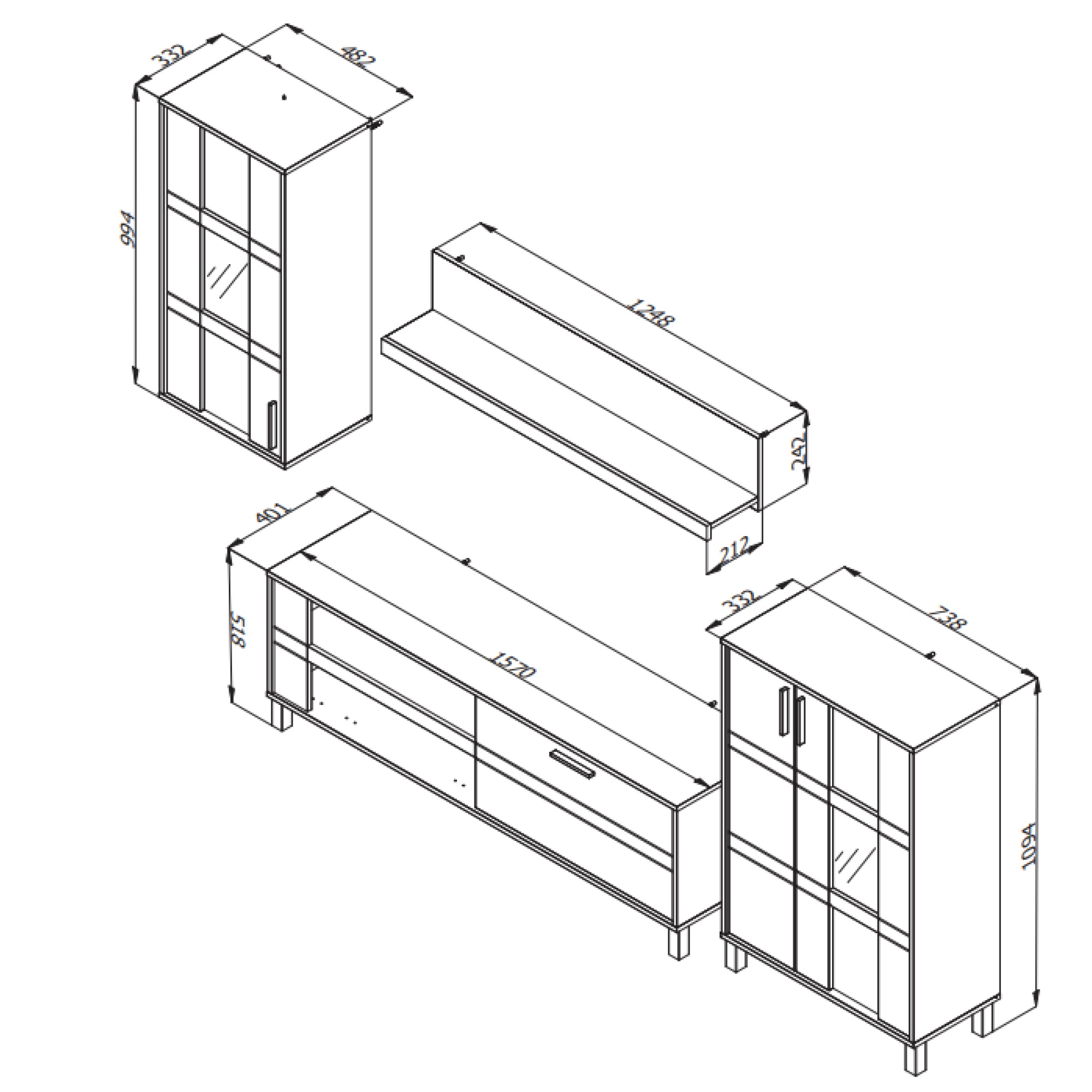 - Skladá sa z: Vitrína, závesná vitrína, TV komoda, nástenná polica