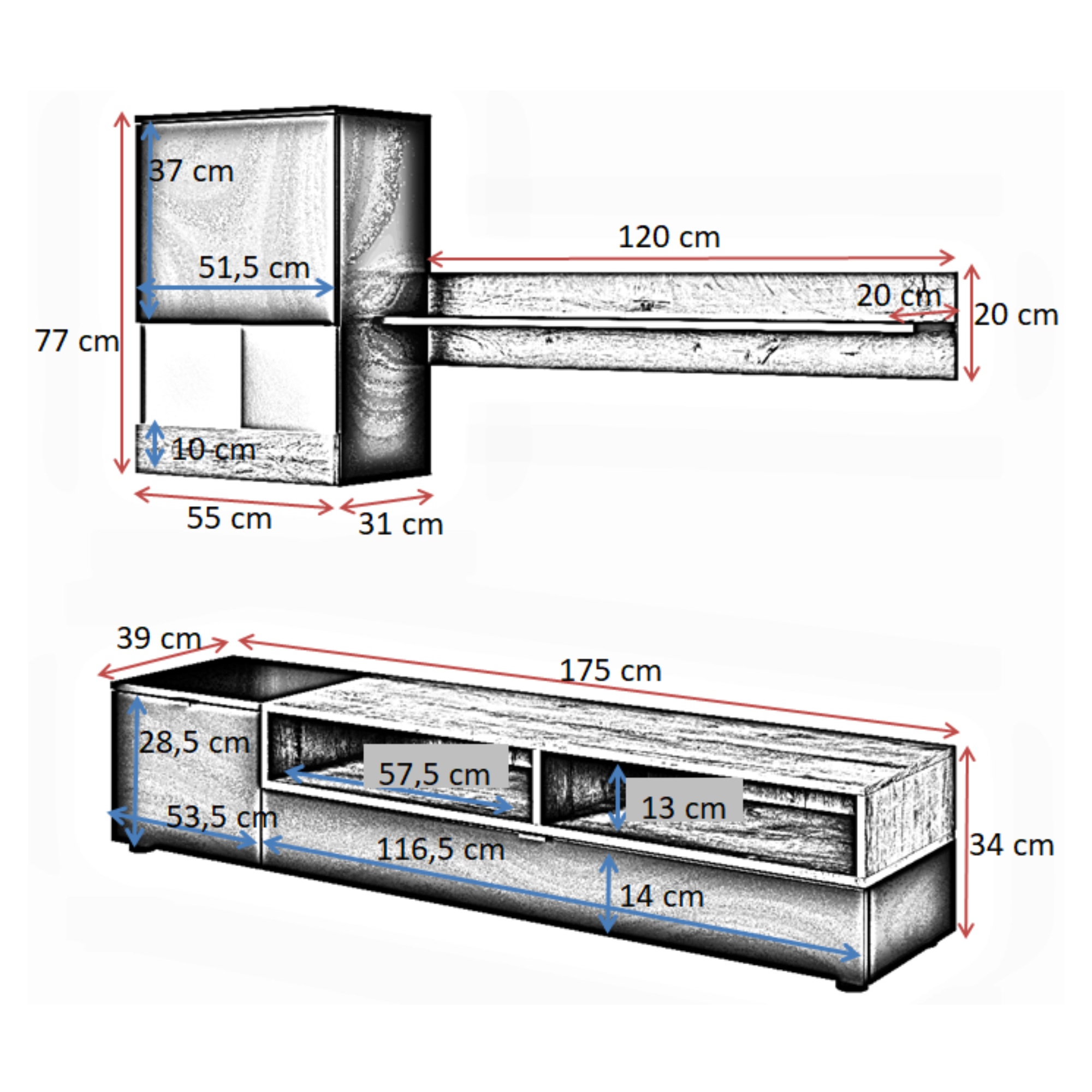 TV komoda je čiastočne uzatvárateľná pomocou 2 dverí, kedy za ľavými dverami je priestor predelený vloženou policou. Komoda ponúka aj množstvo otvoreného odkladacieho priestoru nielen na TV príslušenstvo. Nástenná vitrína s 1 vloženou policou za čiastočne presklenými dverami je ideálnym priestorom na vystavenie vašich pokladov. Poslednou súčasťou zostavy je samostatná nástenná polica, ktorá sa hodí na uloženie rastlín, fotografií alebo ďalších dekorácií. Všetky predné plochy sú doplnené o rúčky na ľahkú manipuláciu. Zostava je vyrobená z laminovaného dreveného materiálu, ktorý je nenáročný na údržbu.