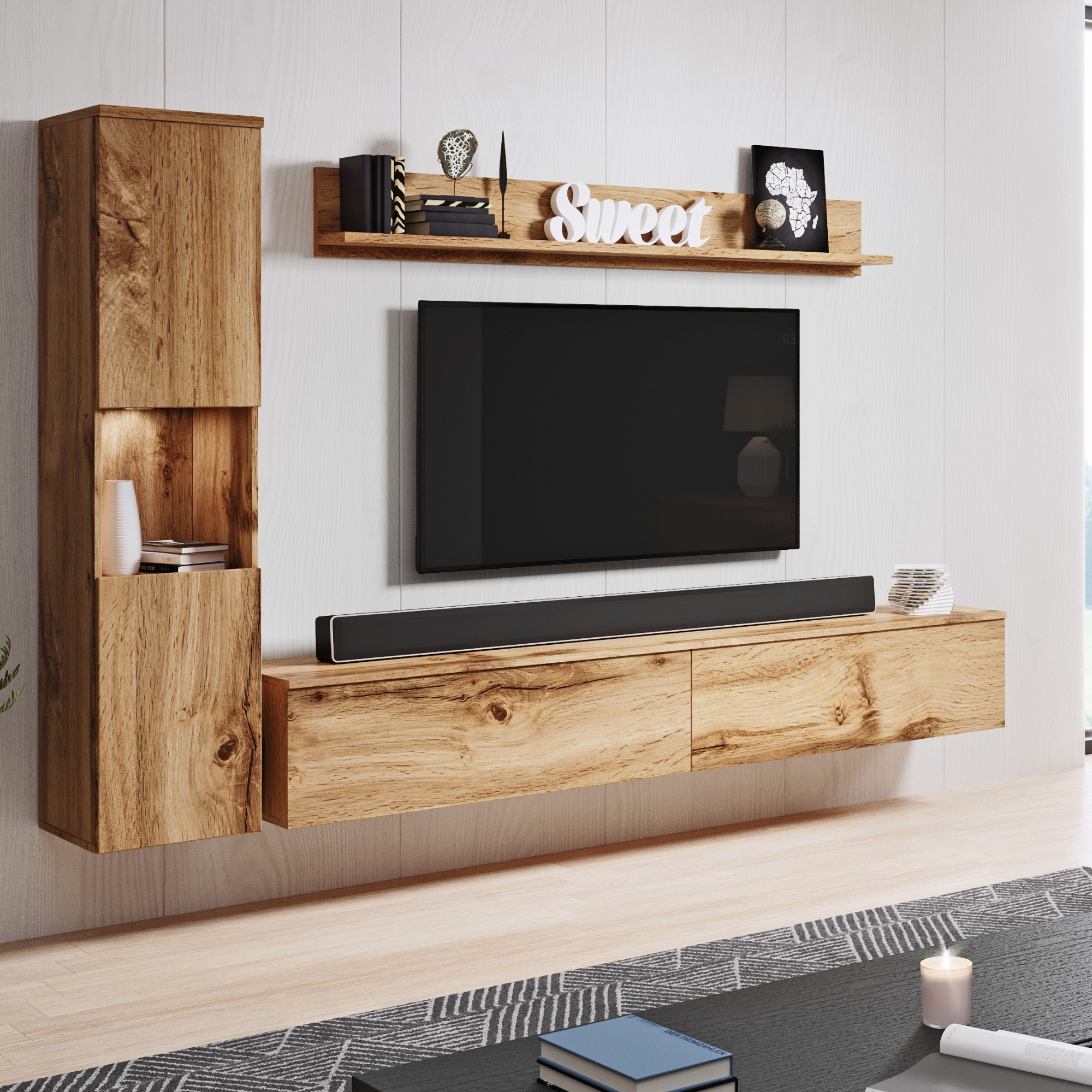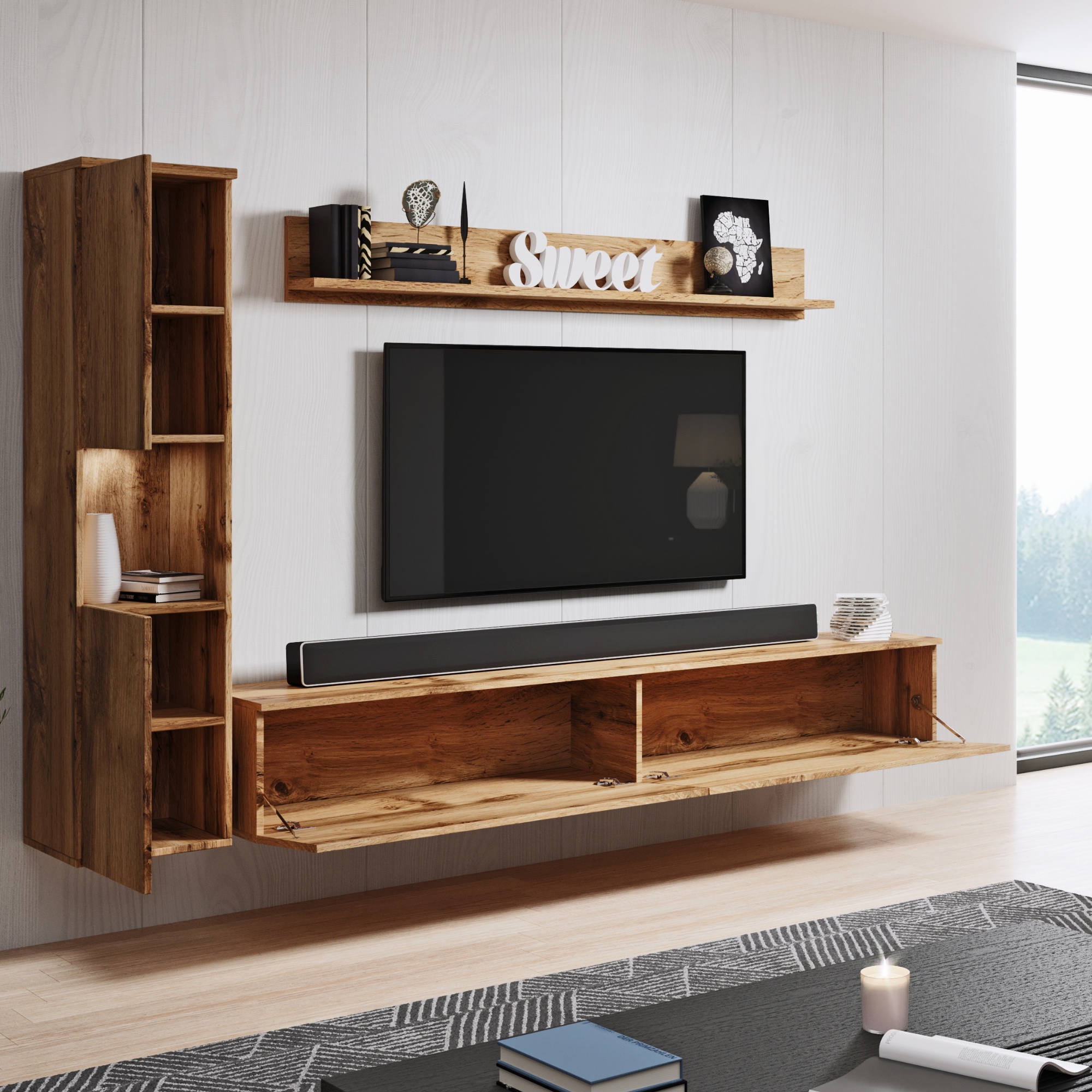 Táto zostava sa skladá zo skrinky, nástennej police a TV komody. TV komoda ponúka dostatok priestoru na uloženie nielen TV príslušenstva, ale aj ďalších potrebných predmetov. Na nástennú policu zasa môžete vystaviť vaše obľúbené dekorácie. Skrinka je vybavená 2 vloženými policami, z ktorých každá sa ukrýva za jednými dvierkami.