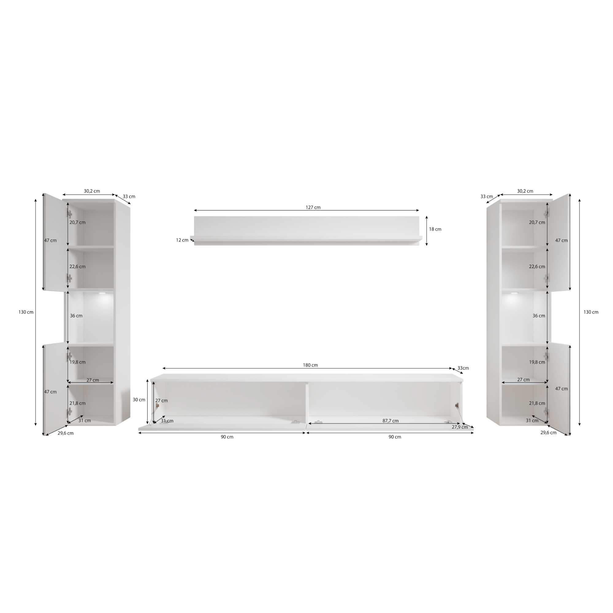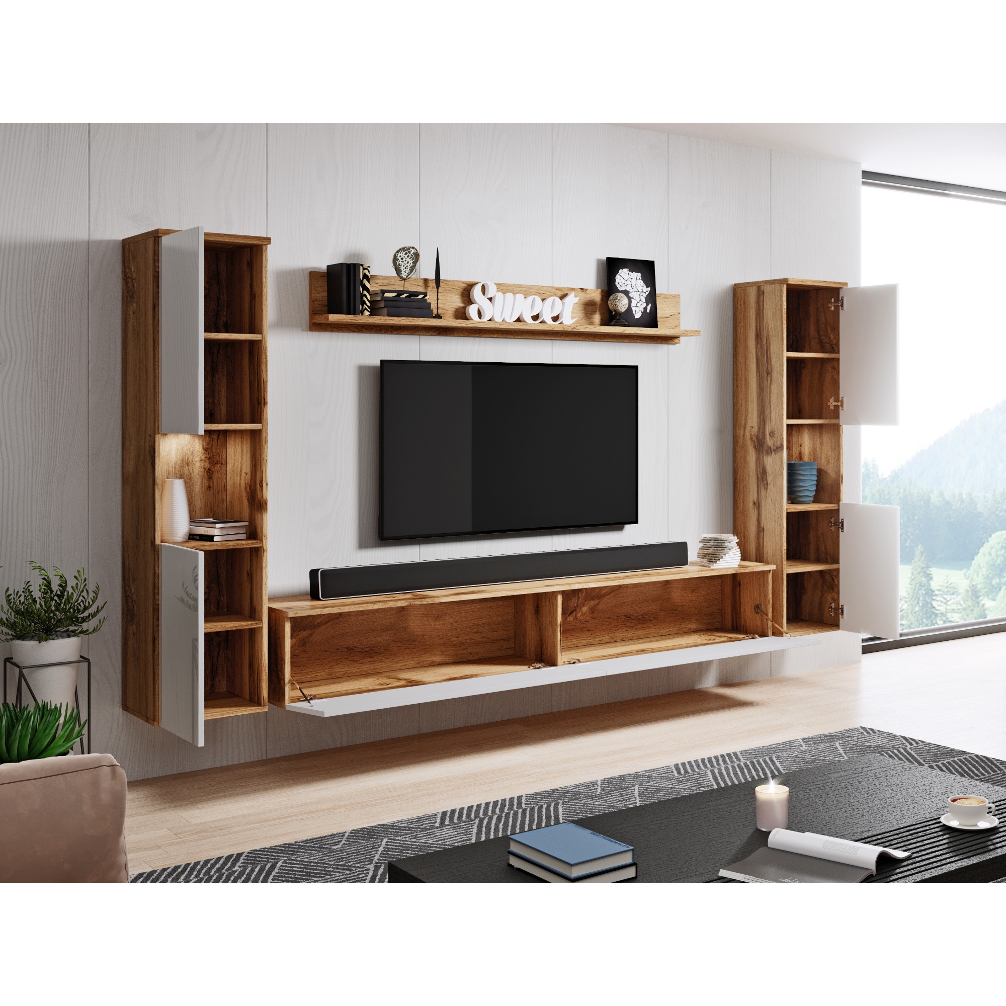 Táto zostava sa skladá z 2 skriniek, nástennej police a TV komody. TV komoda ponúka dostatok priestoru na uloženie nielen TV príslušenstva, ale aj ďalších potrebných predmetov. Na nástennú policu môžete vystaviť vaše obľúbené dekorácie. Obe skrinky sú vybavené 2 vloženými policami, ktoré vám umožnia prehľadne si usporiadať všetky veci, ktoré sa rozhodnete do nej umiestniť.
