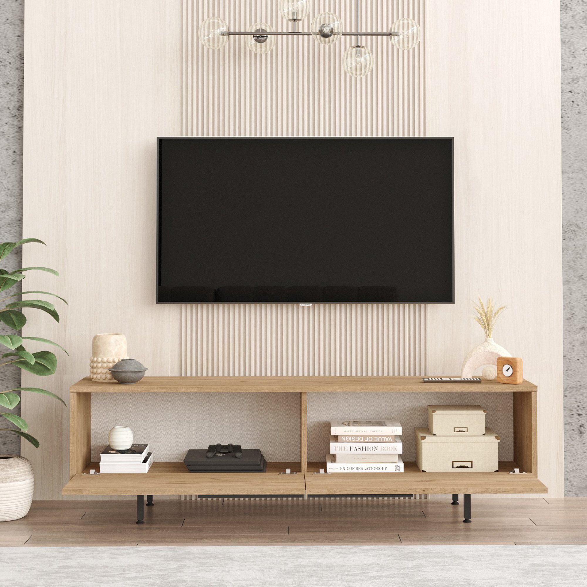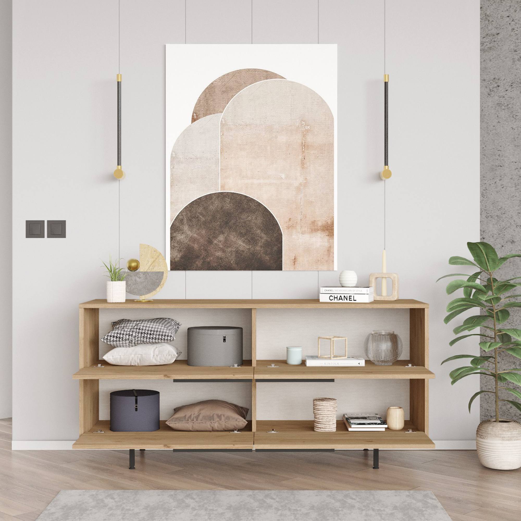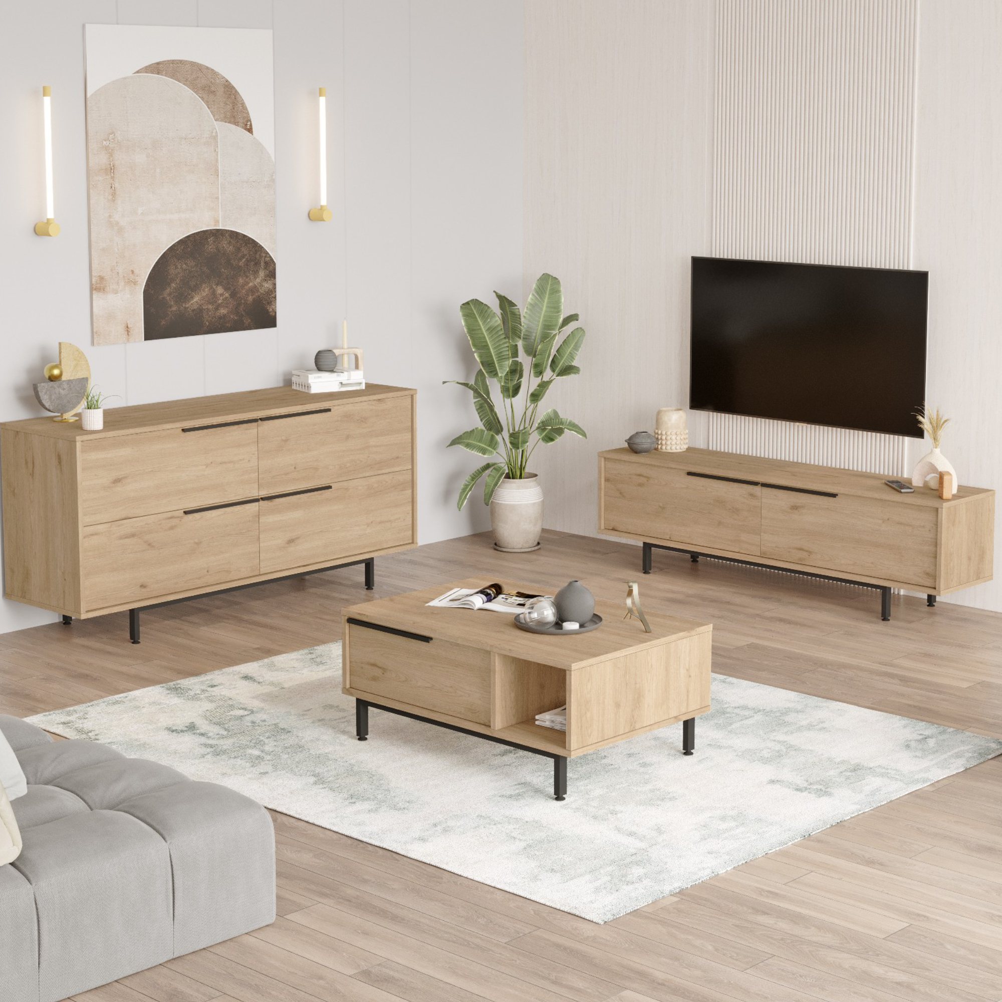 Zostavu tvorí TV komoda, konferenčný stolík a komoda. Zostava poskytuje dostatok úložného priestoru nielen na TV príslušenstvo, ale aj na ďalšie predmety, ktoré potrebujete mať po ruke. Umožňuje tiež vystavenie vašich obľúbených dekorácií. Aby sa s jej dvierkami ľahšie manipulovalo, je vybavená praktickými rúčkami.