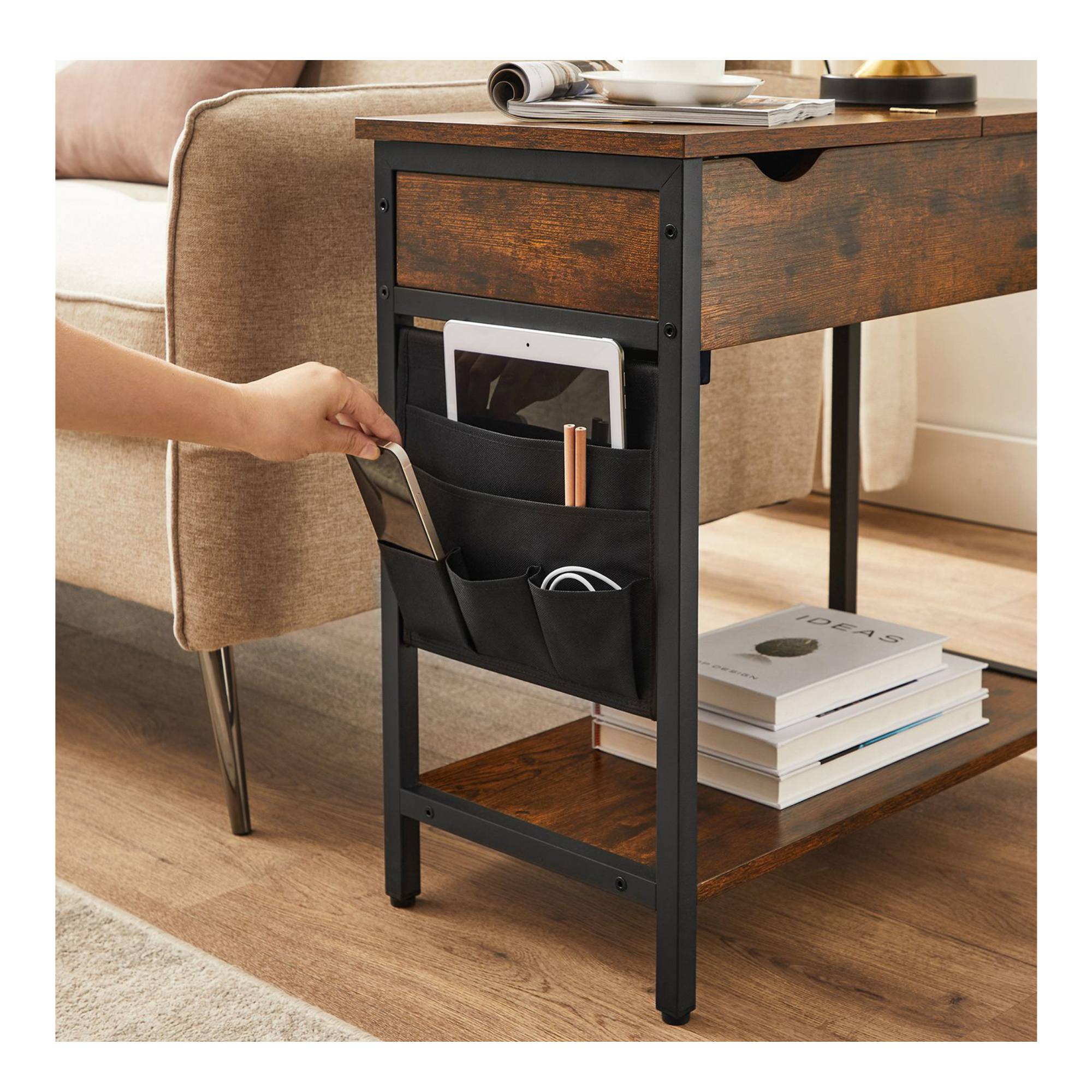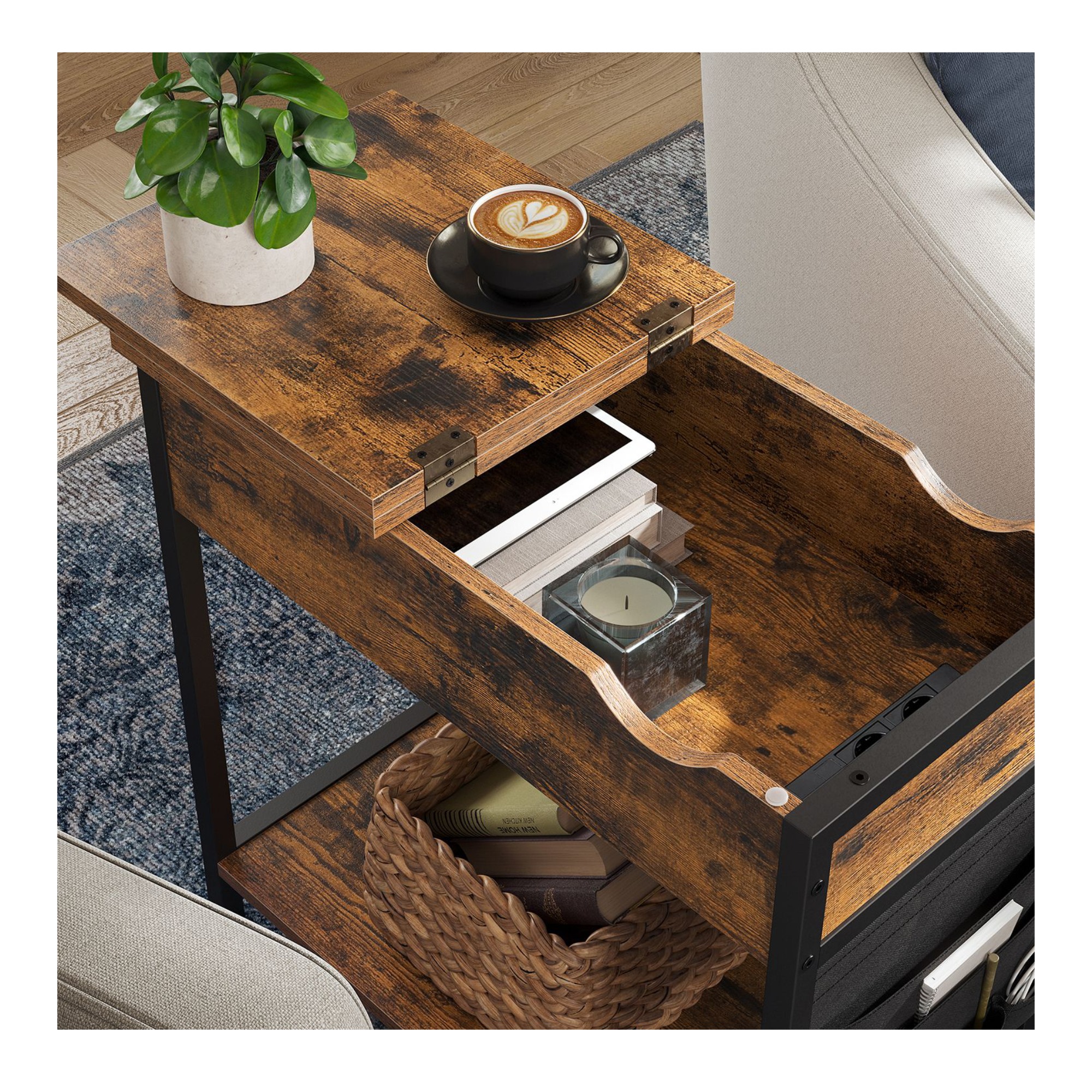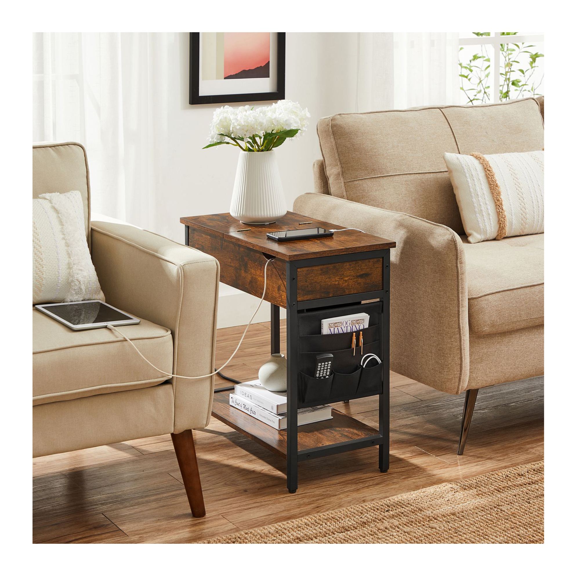 Vyrobený je z drevotrieskových dosiek vo farbe starého dreva. Maximálnu stabilitu zaisťuje pevný oceľový rám. Nohy stolíka sú nastaviteľné, takže sa ľahko prispôsobia nerovnostiam podlahy. Hlavná doska je doplnená o praktický uzavretý úložný priestor, spodnú celoplošnú policu a o bočné vrecko na tlačoviny. Všetky potreby tak nájdu svoje miesto. Vnútorná bočná strana navyše disponuje dvojicou zásuviek a dvoma USB portami. Vaše mobilné telefóny, notebooky a ďalšie príslušenstvo tak budú vždy pripravené na použitie.