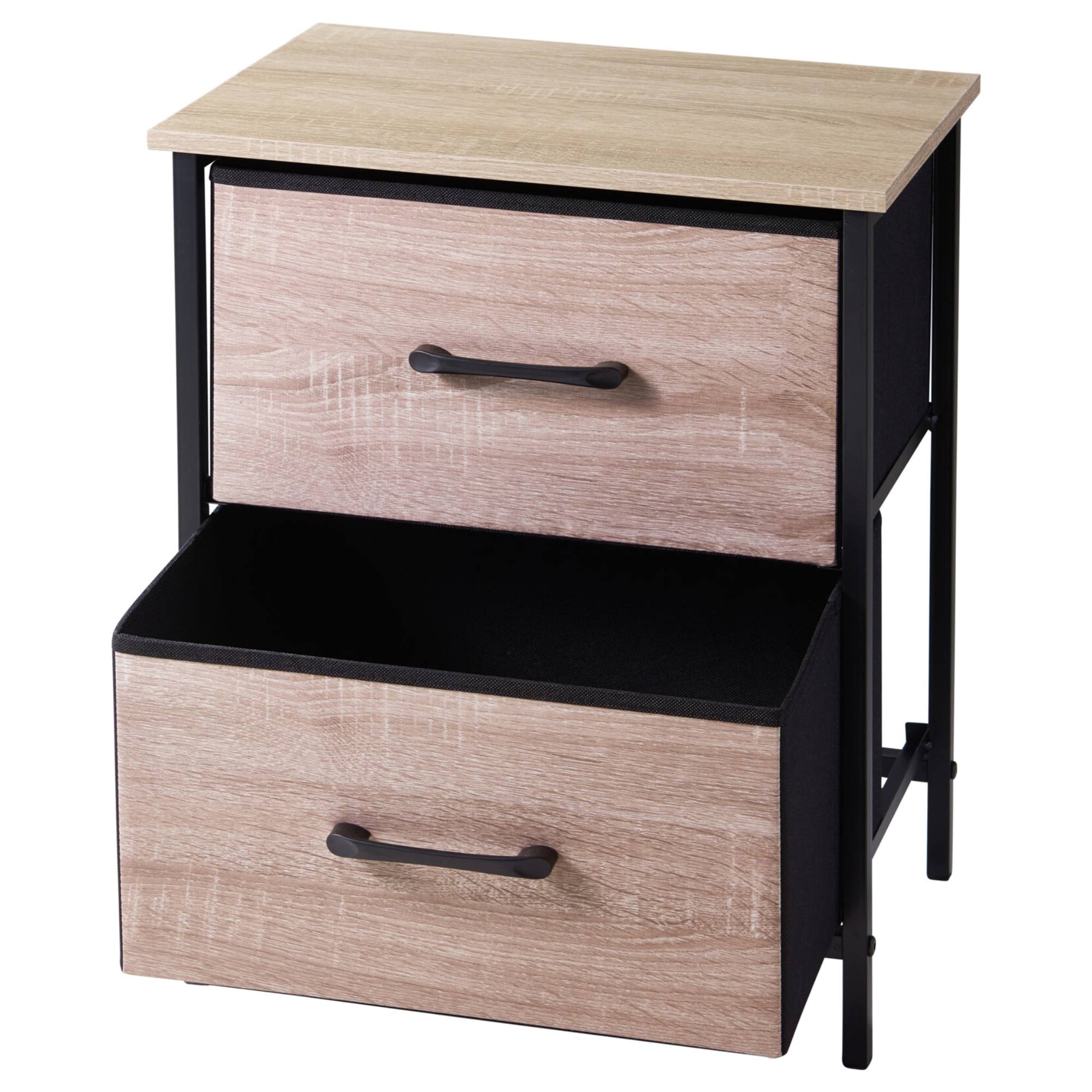 Je vybavený 2 zásuvkami, ktoré poskytujú dostatok priestoru na uloženie všetkého potrebného. Sú vybavené praktickými úchytkami pre pohodlné používanie. Má stabilnú kovovú konštrukciu v čiernej farbe, ktorú kontrastne dopĺňa dekor dreva. Vrchná doska a predná časť zásuviek sú vyrobené z drevovláknitej MDF dosky. Korpus zásuviek je vytvorený z netkanej textílie.