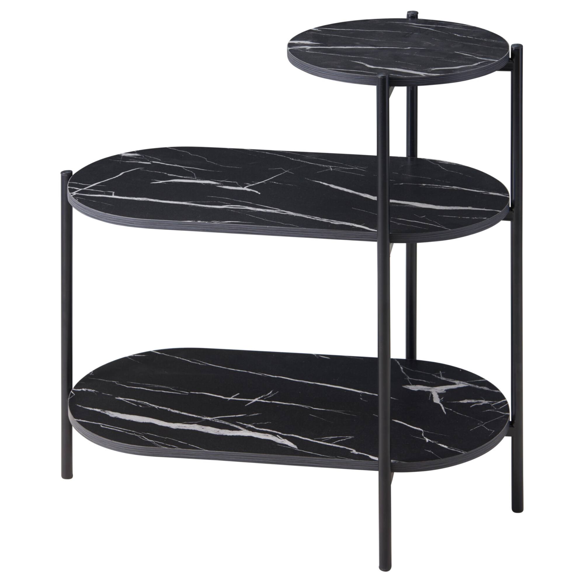 Má stabilnú kovovú konštrukciu v čiernej farbe. Je vybavený 1 menšou okrúhlou policou a 2 ďalšími policami oválneho tvaru. Police sú vyrobené z drevovláknitej MDF dosky s dekorom mramoru, ktorý stolíku dodáva luxusný nádych. Je ideálnym doplnkom k sedacej súprave, kde poslúži ako praktické odkladacie miesto na nápoje a knihy či vystavenie dekorácií.