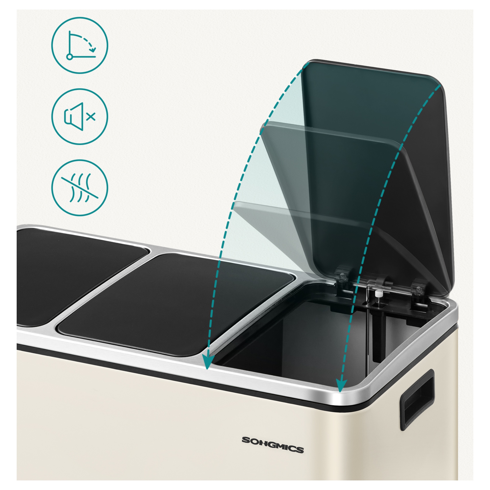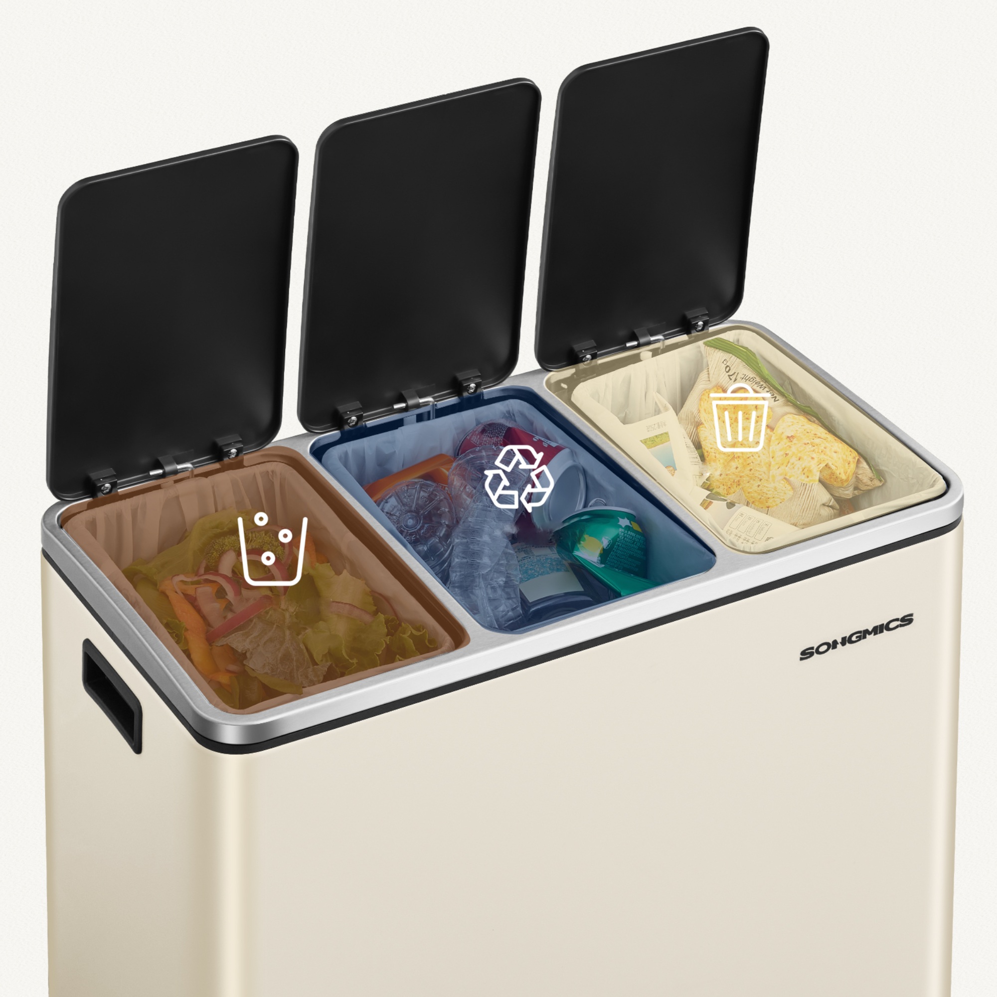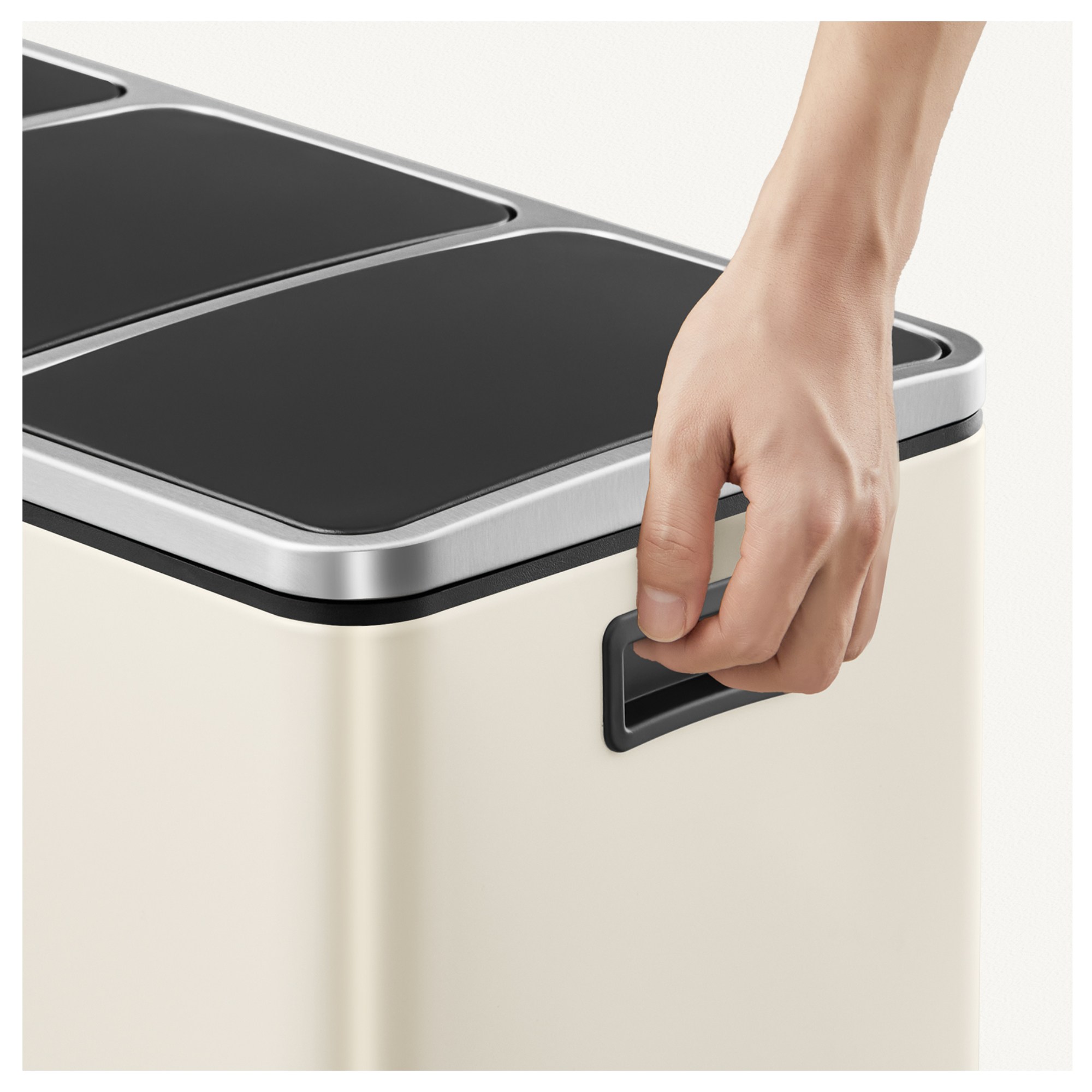Disponuje 3 plastovými nádobami, z ktorých každá má objem 18 l. Praktické rozdelenie umožní jednoduché triedenie odpadu. Všetky nádoby sú vybavené vekom z ABS plastu, ktoré zabraňuje úniku zápachu. Veká disponujú tichým dovieraním, ktoré zabezpečuje plynulé zatváranie bez búchania, a tým aj príjemnejšie každodenné používanie. Na otváranie jednotlivých košov slúžia nožné pedále, ktoré zabezpečujú rýchlu, pohodlnú a hygienickú likvidáciu odpadu. Je tiež vybavený úchytmi po stranách na jednoduchú manipuláciu.