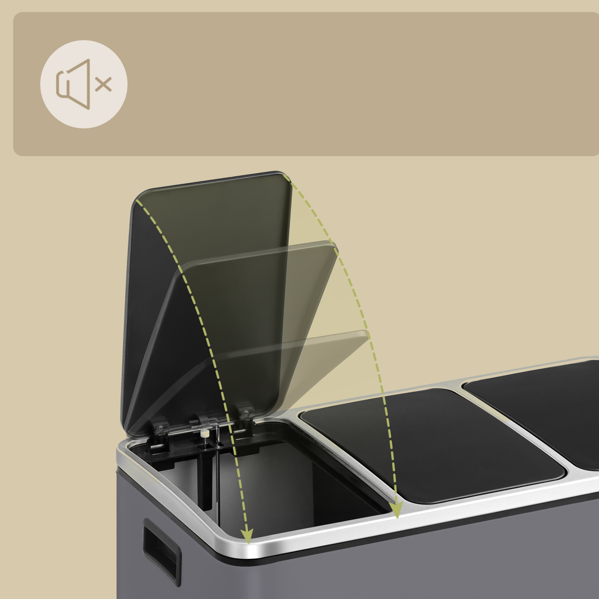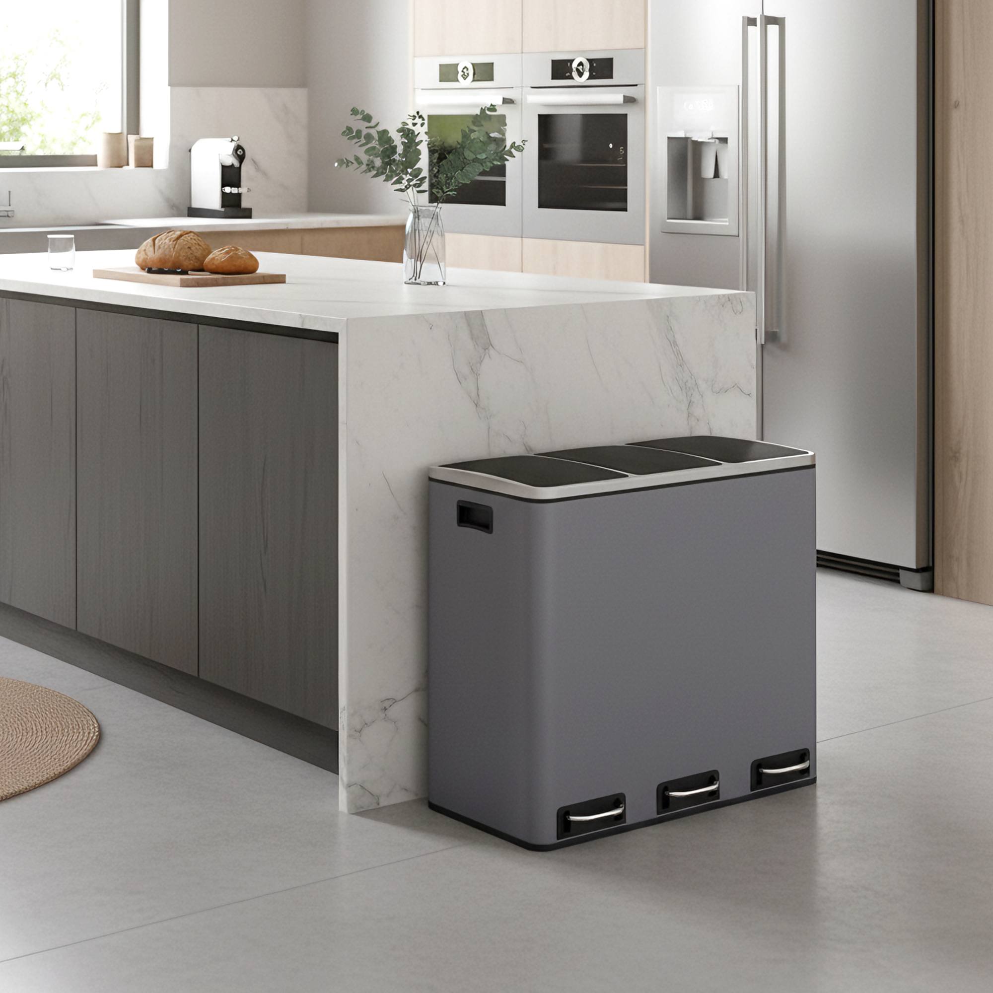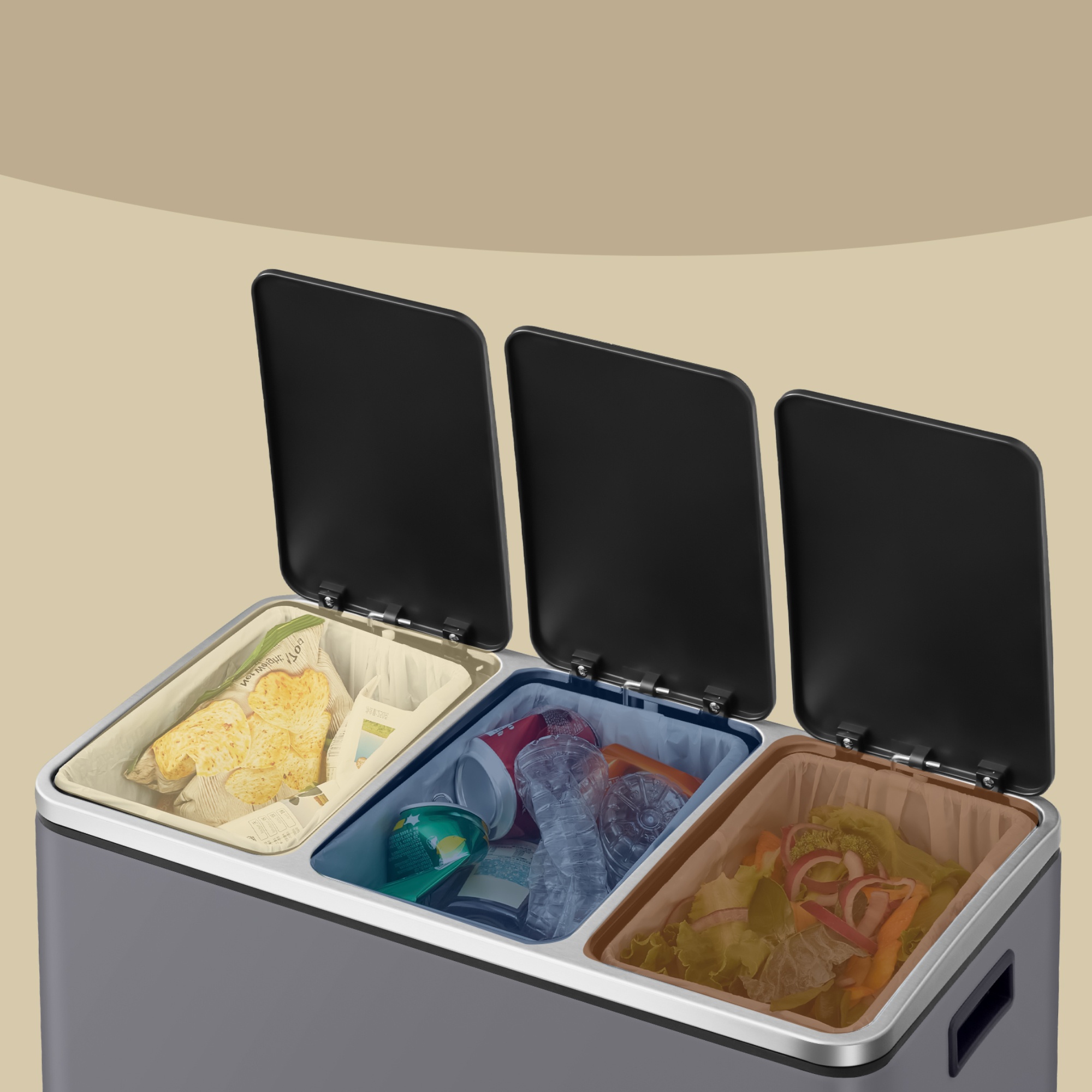 Disponuje 3 plastovými nádobami, z ktorých každá má objem 18 l. Praktické rozdelenie umožní jednoduché triedenie odpadu. Všetky nádoby sú vybavené vekom z ABS plastu, ktoré zabraňuje úniku zápachu. Veká disponujú tichým dovieraním, ktoré zabezpečuje plynulé zatváranie bez búchania, a tým aj príjemnejšie každodenné používanie. Na otváranie jednotlivých košov slúžia nožné pedále, ktoré zabezpečujú rýchlu, pohodlnú a hygienickú likvidáciu odpadu. Je tiež vybavený úchytmi po stranách na jednoduchú manipuláciu.