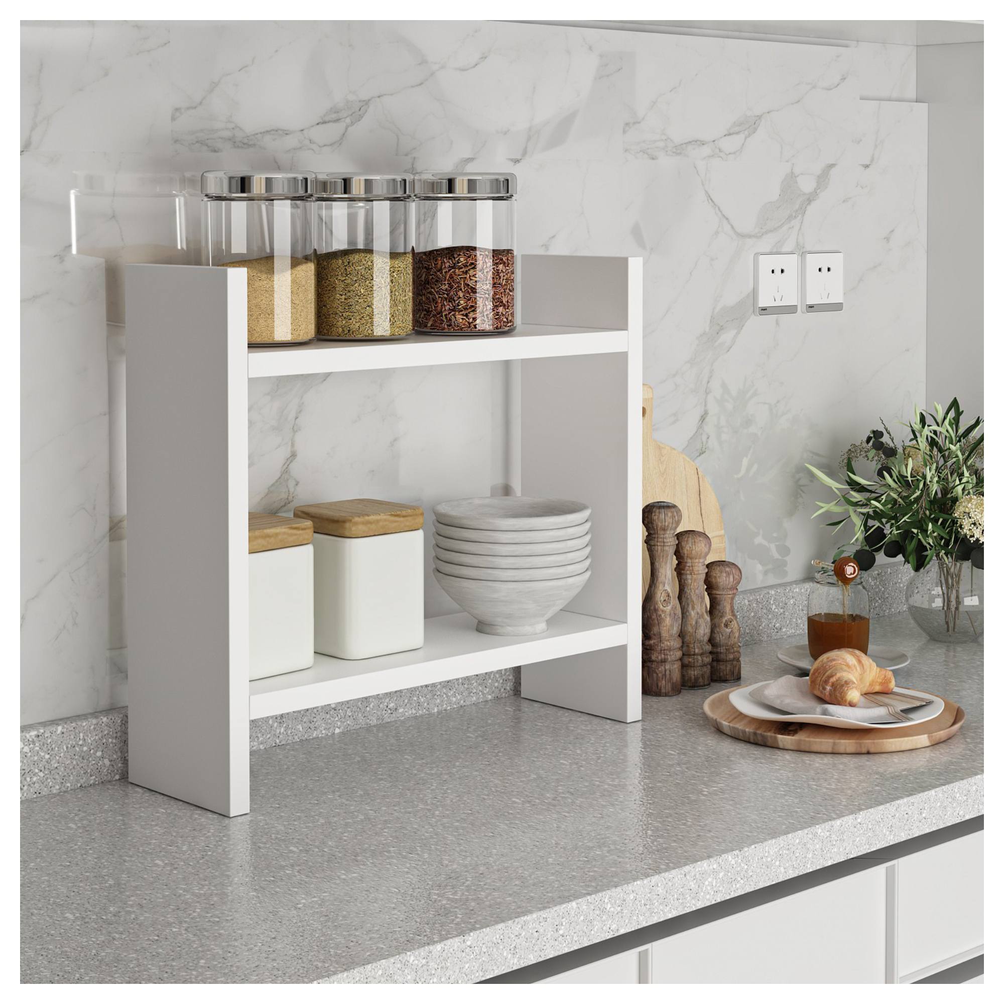 Disponuje 2 priestrannými policami, ideálny na korenie, kuchynské náčinie alebo štýlové vystavenie hrnčekov a iného riadu. Je vyrobený z laminovanej drevotrieskovej dosky, ktorá sa vyznačuje svojou ľahkou údržbou. Vďaka jeho jednoduchému vyhotoveniu sa bude vynímať v rôznych interiéroch. Pomôže vám s organizáciou a úhľadným usporiadaním v kuchyni a v tých menších ušetrí miesto.