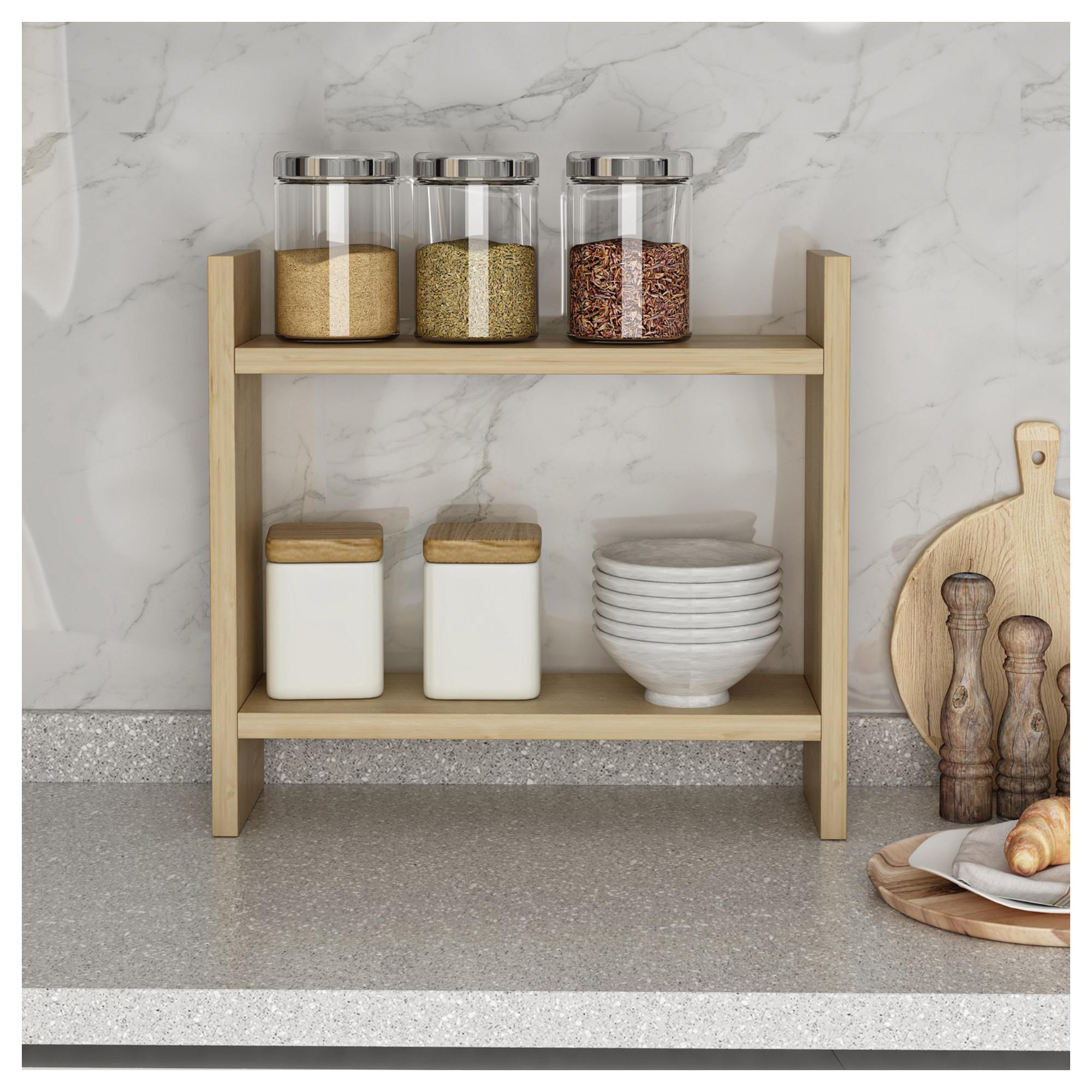 Disponuje 2 priestrannými policami, ideálny na korenie, kuchynské náčinie alebo štýlové vystavenie hrnčekov a iného riadu. Je vyrobený z laminovanej drevotrieskovej dosky, ktorá sa vyznačuje svojou ľahkou údržbou. Vďaka jeho jednoduchému vyhotoveniu sa bude vynímať v rôznych interiéroch. Pomôže vám s organizáciou a úhľadným usporiadaním v kuchyni a v tých menších ušetrí miesto.