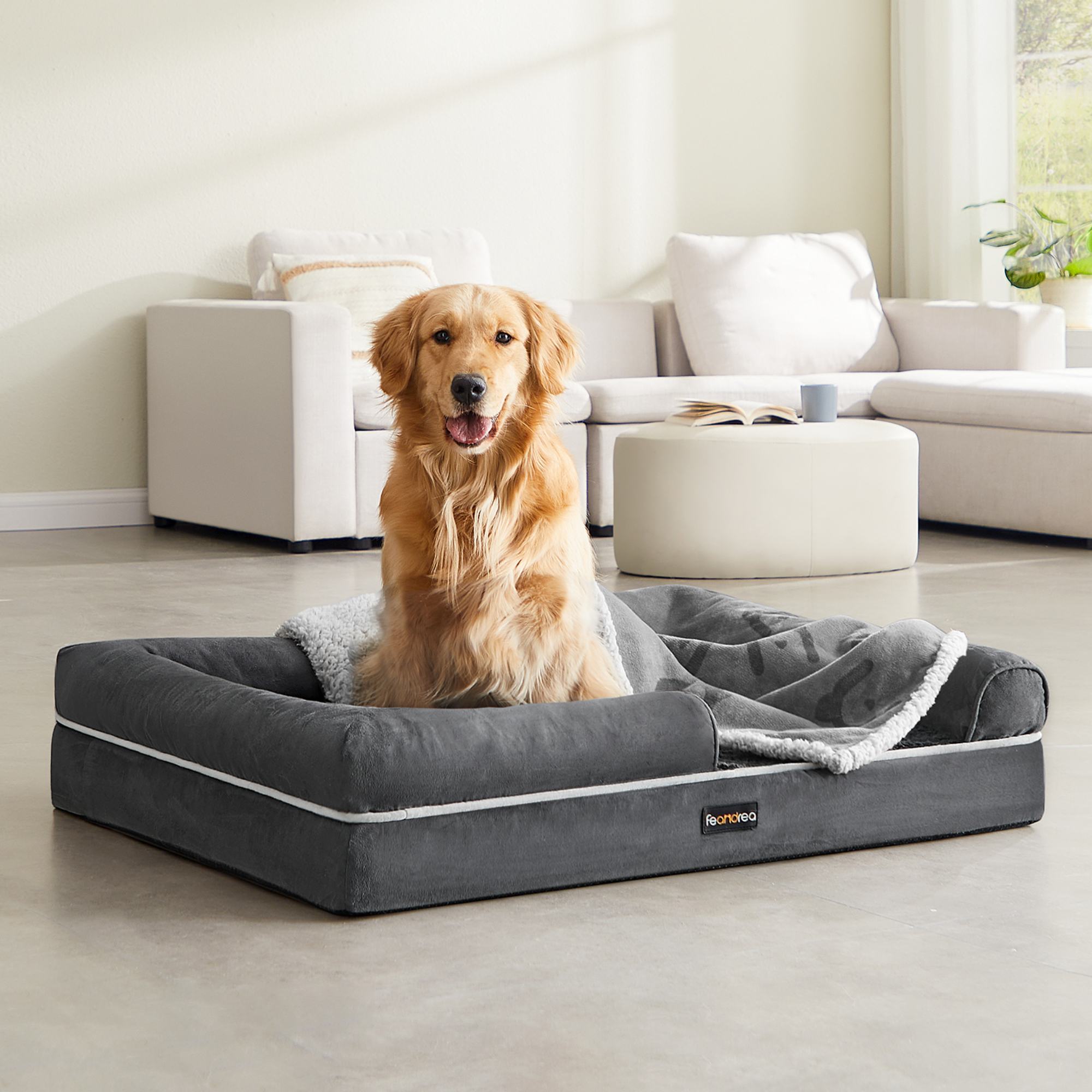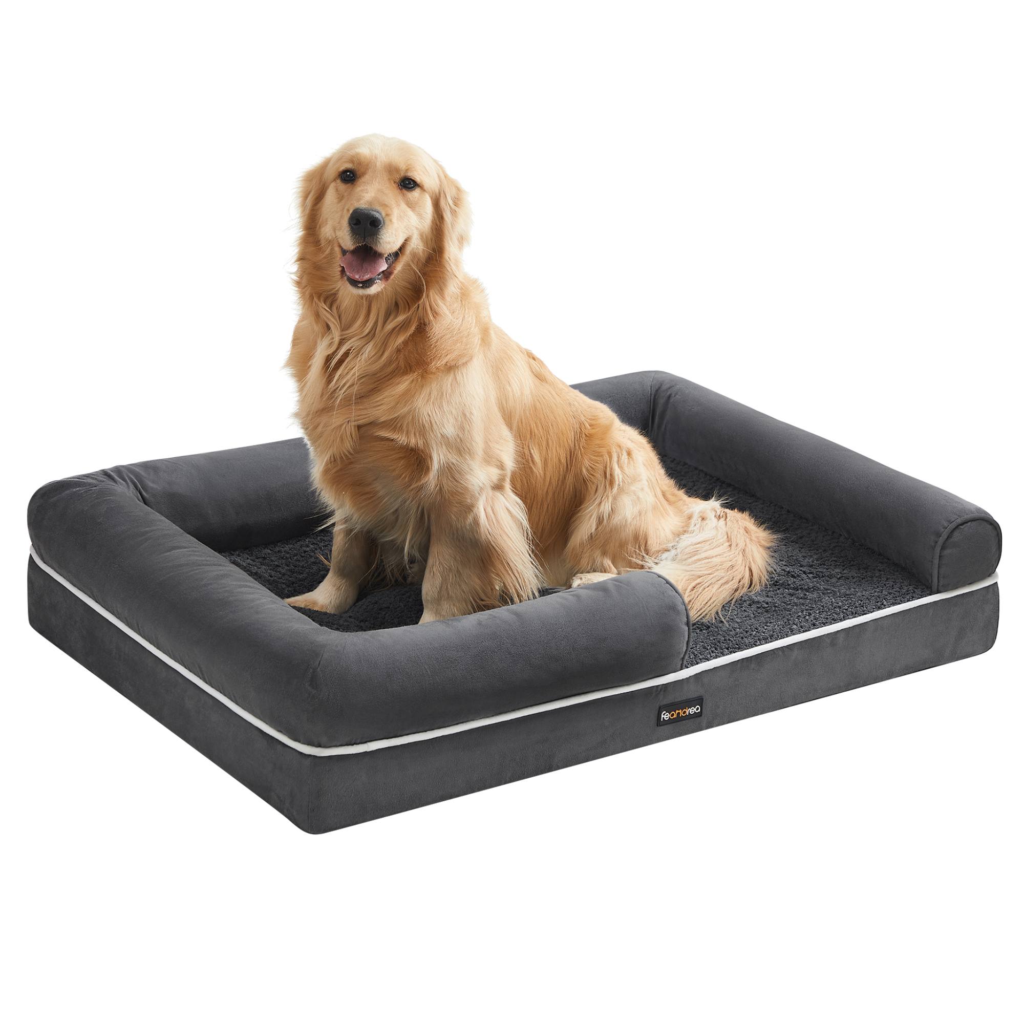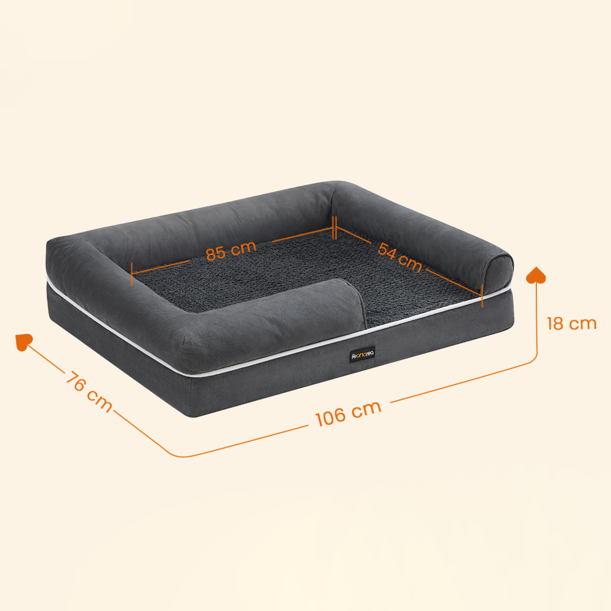 Pelech s rozmermi 106x76 cm je vhodný pre psy do 40 kg. Základom je hrubý penový matrac, ktorý poskytuje úľavu kĺbom, podporuje chrbát a zabezpečuje lepšie prúdenie vzduchu. Pena je potiahnutá mäkkou plyšovou látkou s vodoodolnou spodnou vrstvou, ktorá zabraňuje presiaknutiu tekutín do matraca. Korpus je vyrobený z hladkej látky imitujúcej semiš. Zvýšené okraje v kombinácii s mäkkou polypropylénovou výplňou podopierajú krk a hlavu, čím zabezpečujú maximálny komfort a pocit bezpečia. Spodná strana je opatrená protišmykovou vrstvou, ktorá udrží pelech na mieste. Vytvára ideálny priestor pre pokojný spánok aj ničím nerušený odpočinok.