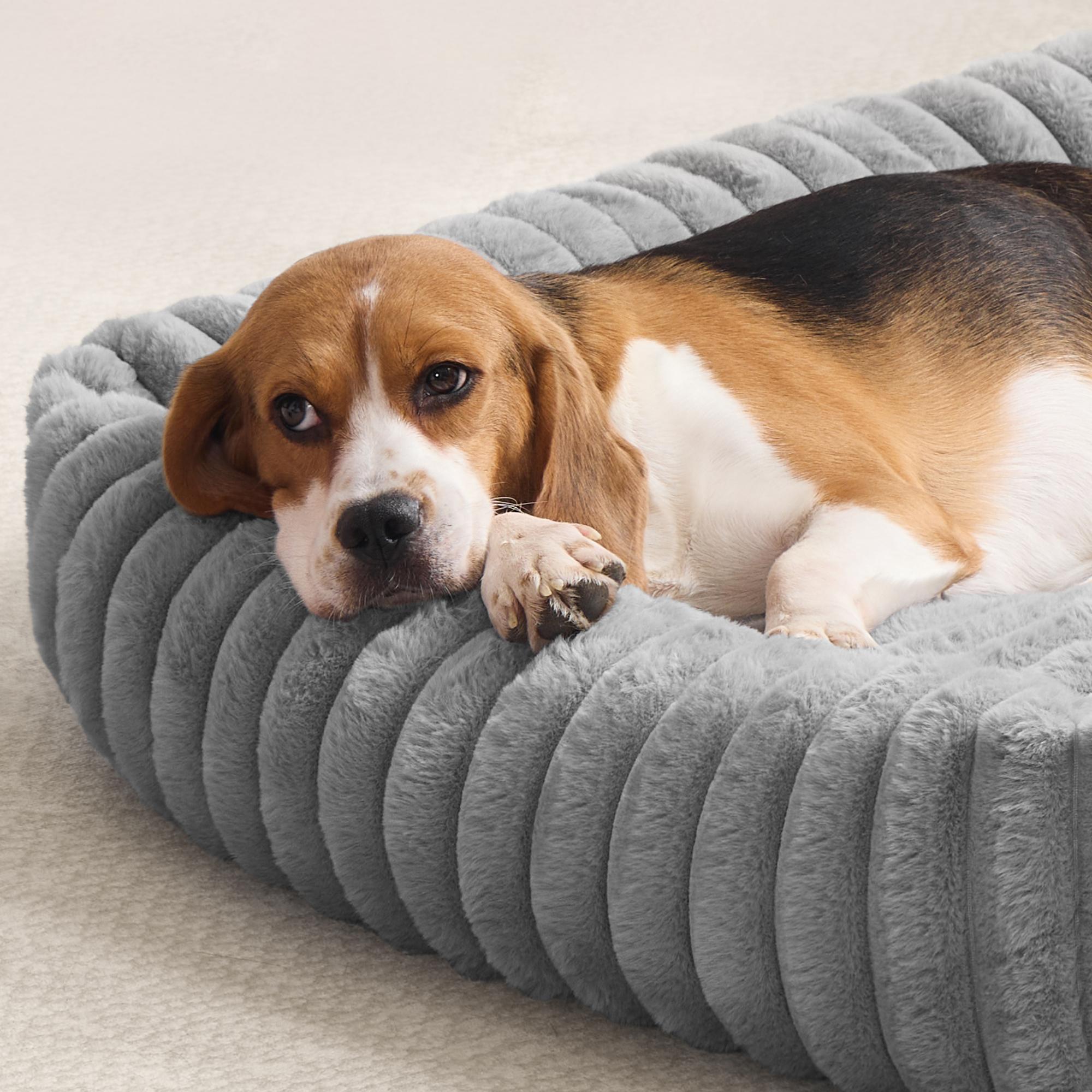 Pelech s rozmermi 91x68 cm je vhodný pre psy do 25 kg. Je vyrobený z hladkej a mäkkej látky imitujúcej králičiu kožušinu doplnenej o rebrovaný povrch. Zvýšené okraje v kombinácii s mäkkou polypropylénovou výplňou podopierajú krk a hlavu, čím zabezpečujú maximálny komfort a pocit bezpečia. Spodná strana je opatrená protišmykovou vrstvou, ktorá udrží pelech na mieste. Vytvára ideálny priestor pre pokojný spánok aj ničím nerušený odpočinok.