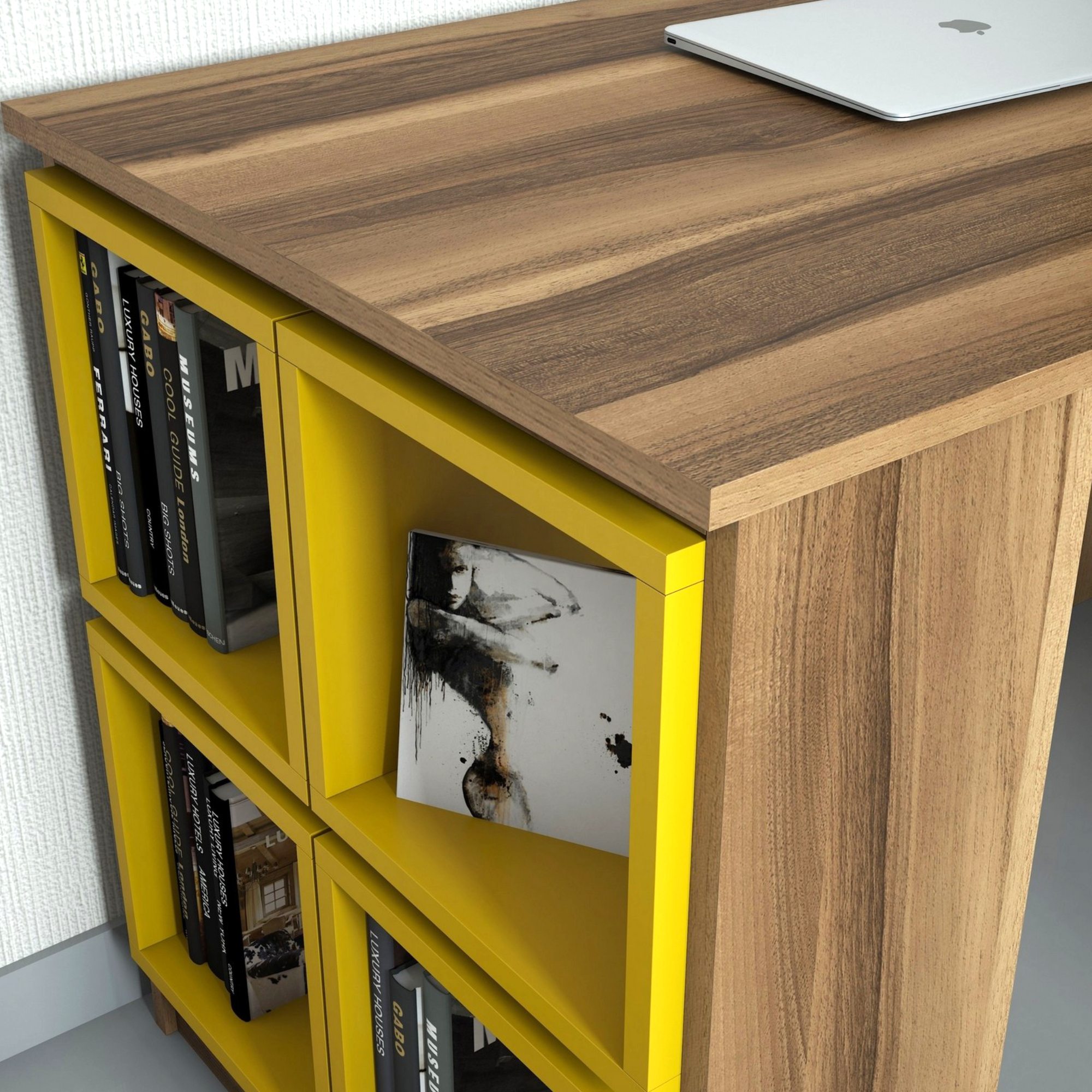 Pracovná doska s hĺbkou 65 cm poskytuje dostatok priestoru na prácu na PC aj na ďalšiu kancelársku činnosť. Súčasťou balenia je 5 ks úložných boxov s rozmermi (š/v/h: 30x30x24 cm), ktoré slúžia ako vložené police na uloženie kníh a dekorácií vnútri stola. Boxy možno tiež variabilne vyberať zo stola a využiť ich ako ďalší úložný priestor aj mimo pracovný stôl. Skvele sa budú vynímať napríklad na stene. Laminovaná drevotriesková doska je nenáročná na údržbu a je ideálna na každodenné používanie.
