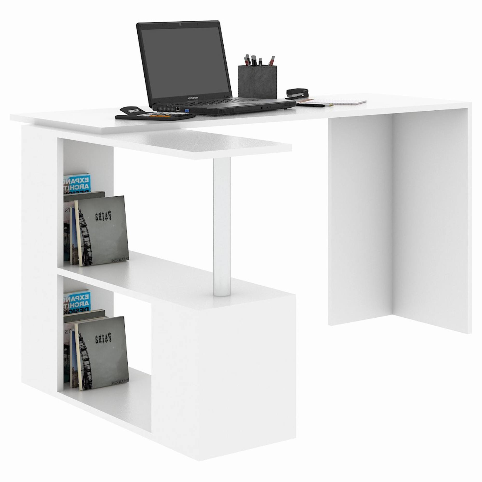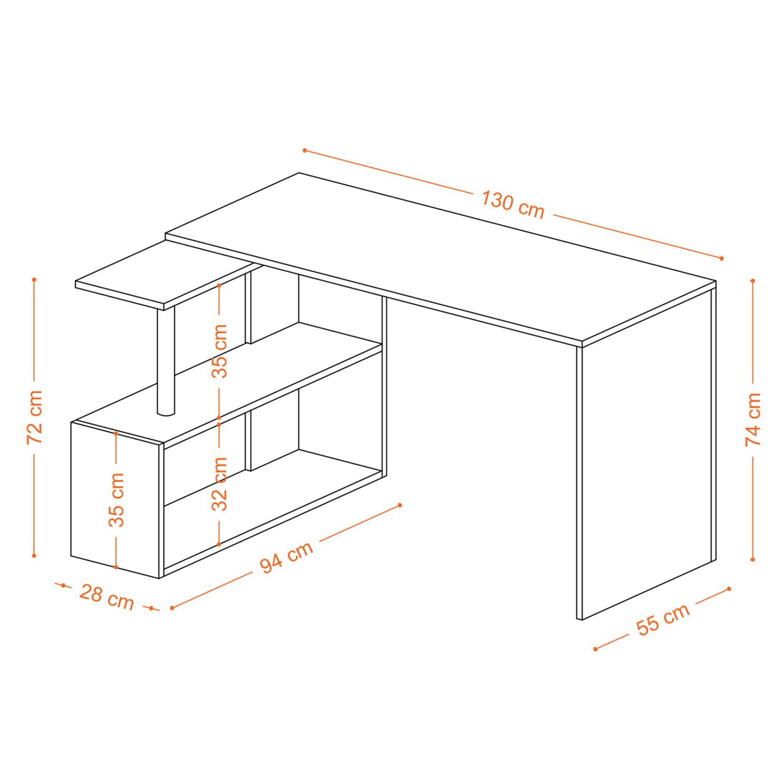 Rohový písací stôl GELINCIK splní aj tie najnáročnejšie požiadavky. Umožní vám vašu každodennú kancelársku prácu, pri ktorej budete mať k dispozícii navyše aj príručný regál. Tu môžete odložiť vaše dokumenty, šanóny a iné predmety. Stôl sa vďaka svojmu minimalistickému vzhľadu bude vynímať takmer v každom interiéri. Povrch stola vyžaduje minimálnu údržbu.
