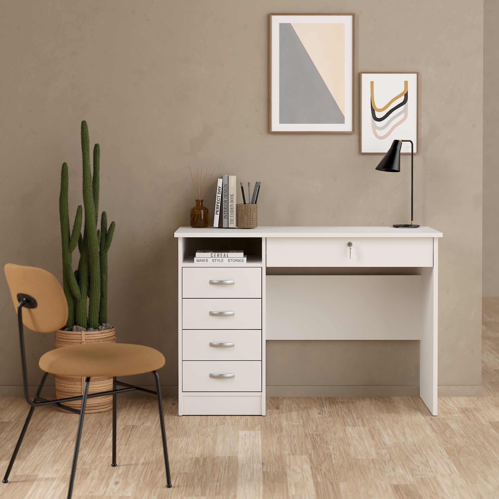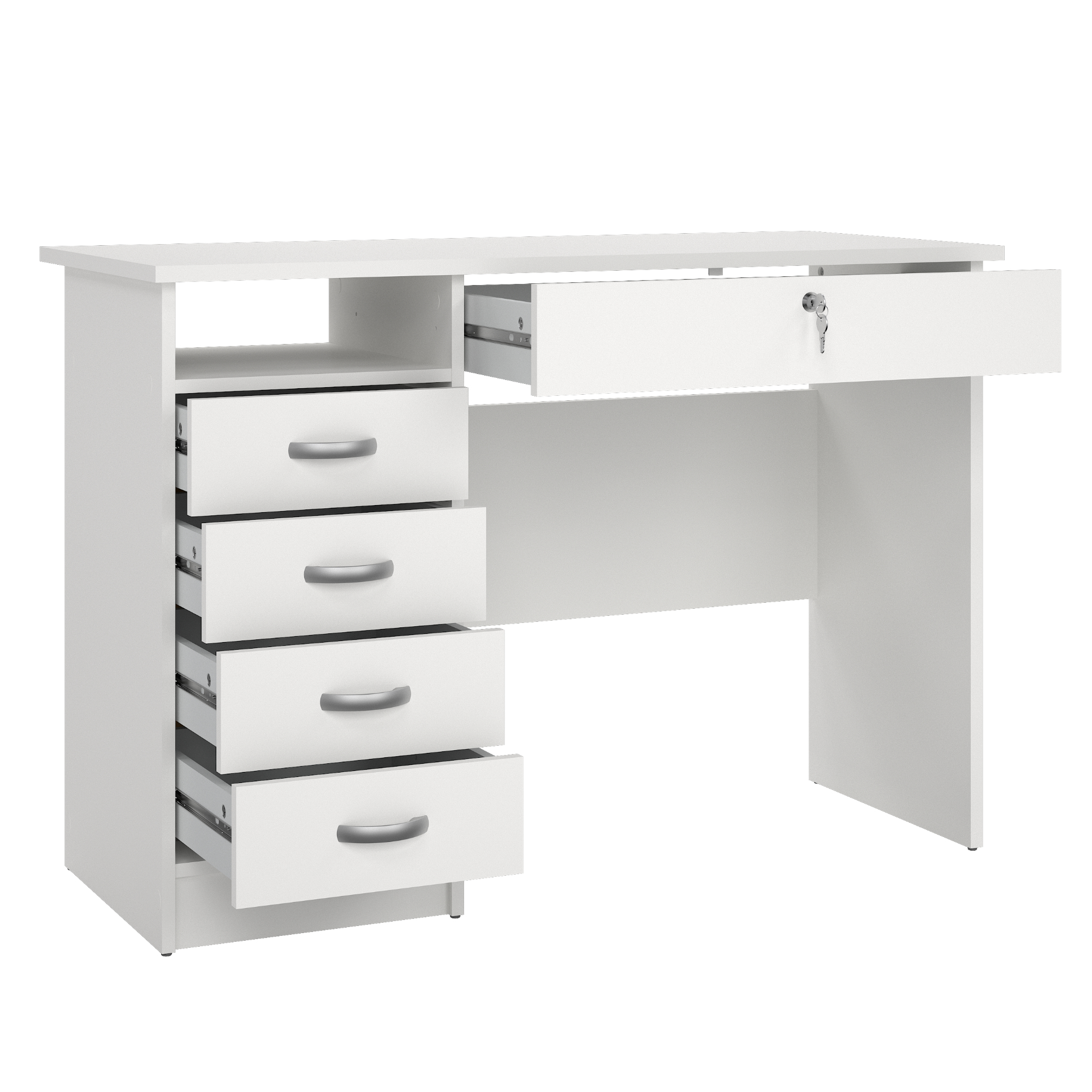 Stôl disponuje nielen kontajnerom so štyrmi zásuvkami, ale aj ďalšou uzamykateľnou zásuvkou. Vďaka tomu poskytne miesto na uloženie kancelárskych pomôcok aj ďalších drobností.