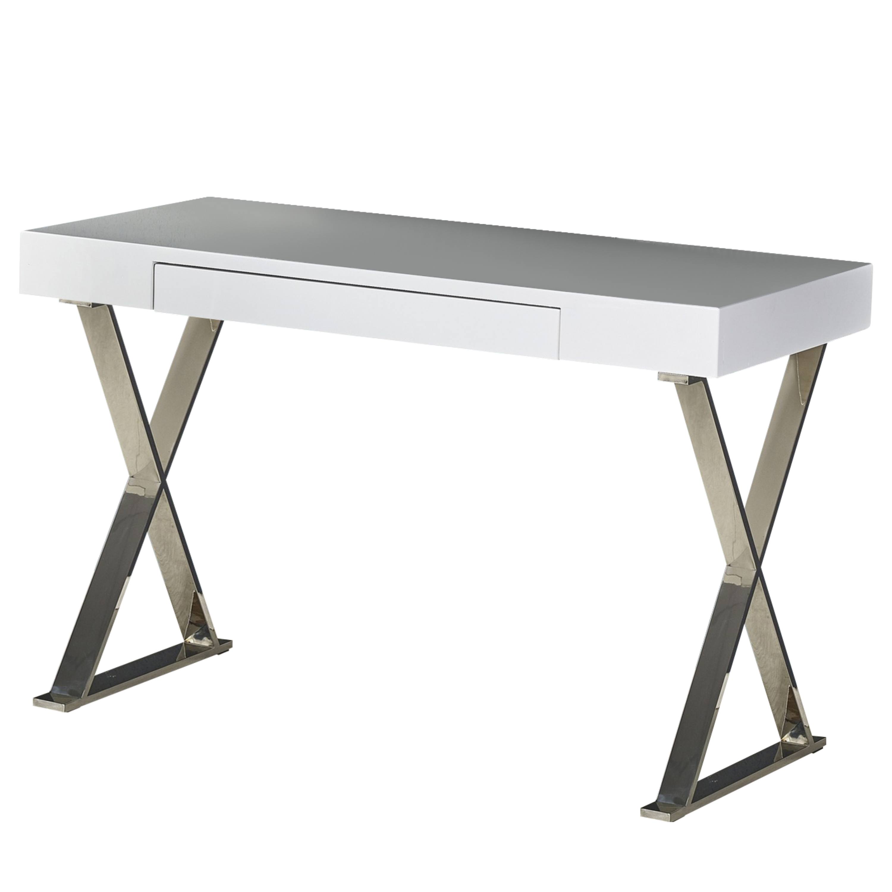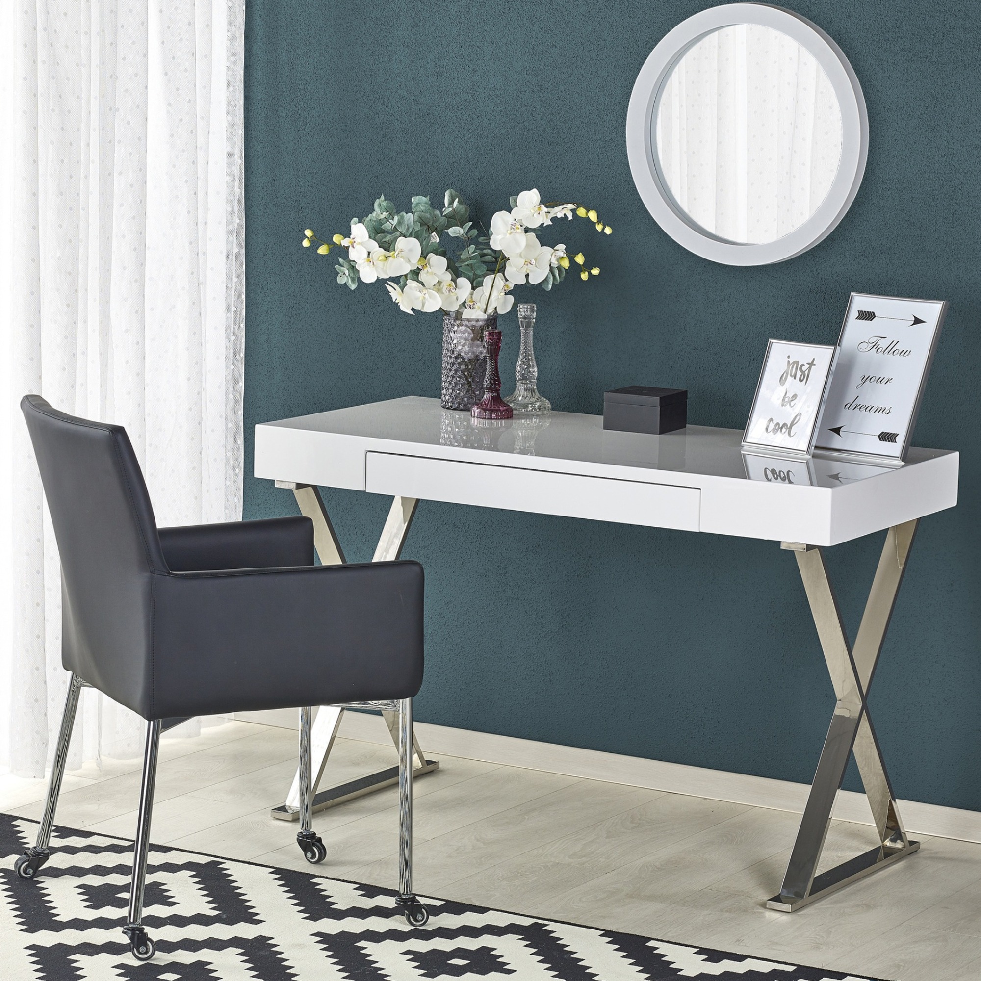 Písací stôl SCB-31 nadchne každého nadšenca moderného dizajnu a čistého vyhotovenia. Zaujme svojim povrchom vo vysokom lesku, odtieňom bielej farby a pochrómovanými nohami. Perfektne tak zapadne do moderne zariadených interiérov. Do prostrednej zásuvky si môžete odložiť všetky dokumenty alebo písacie potreby. Kovové nohy pridávajú na stabilite a robustnosti. Stôl sa vyznačuje jednoduchou údržbou.