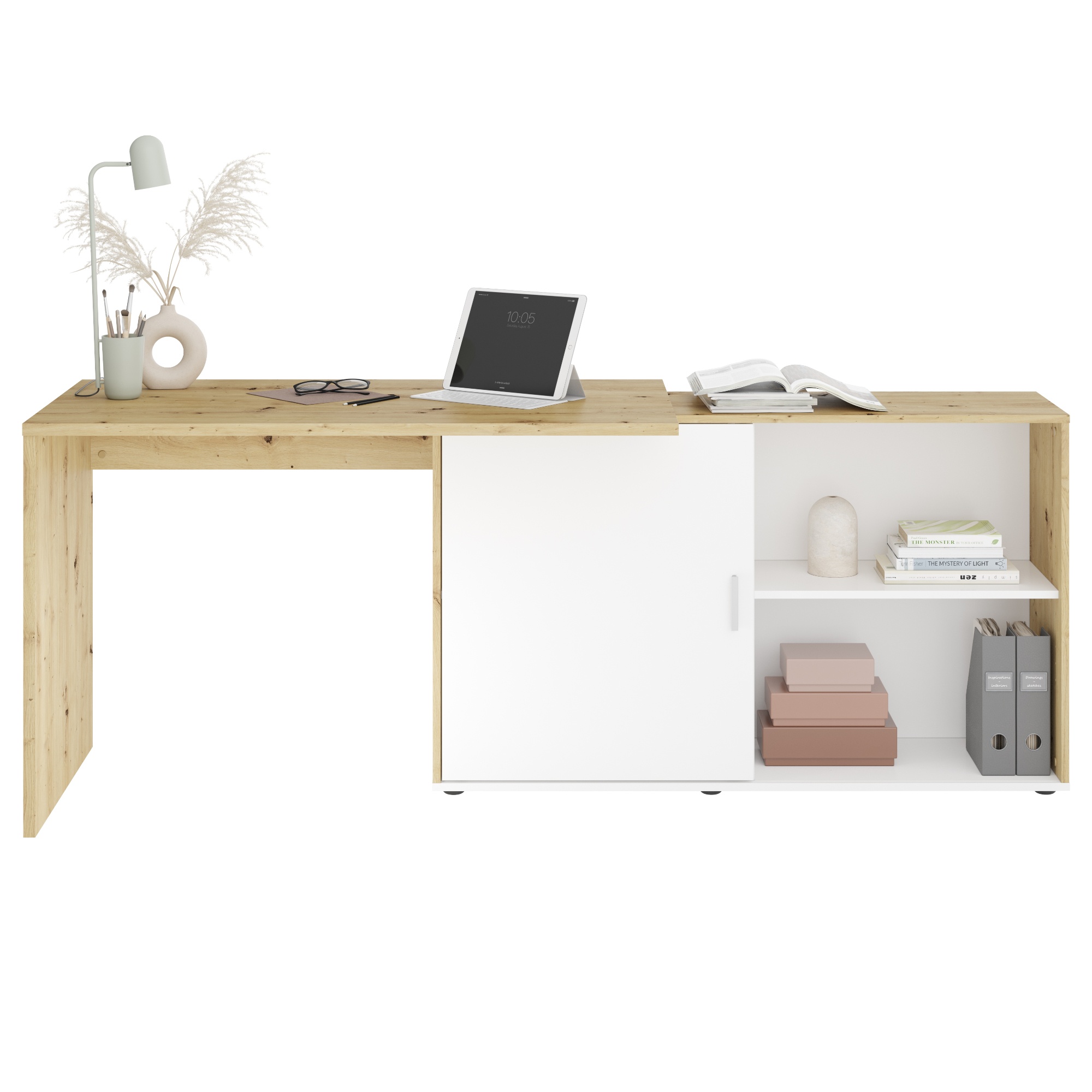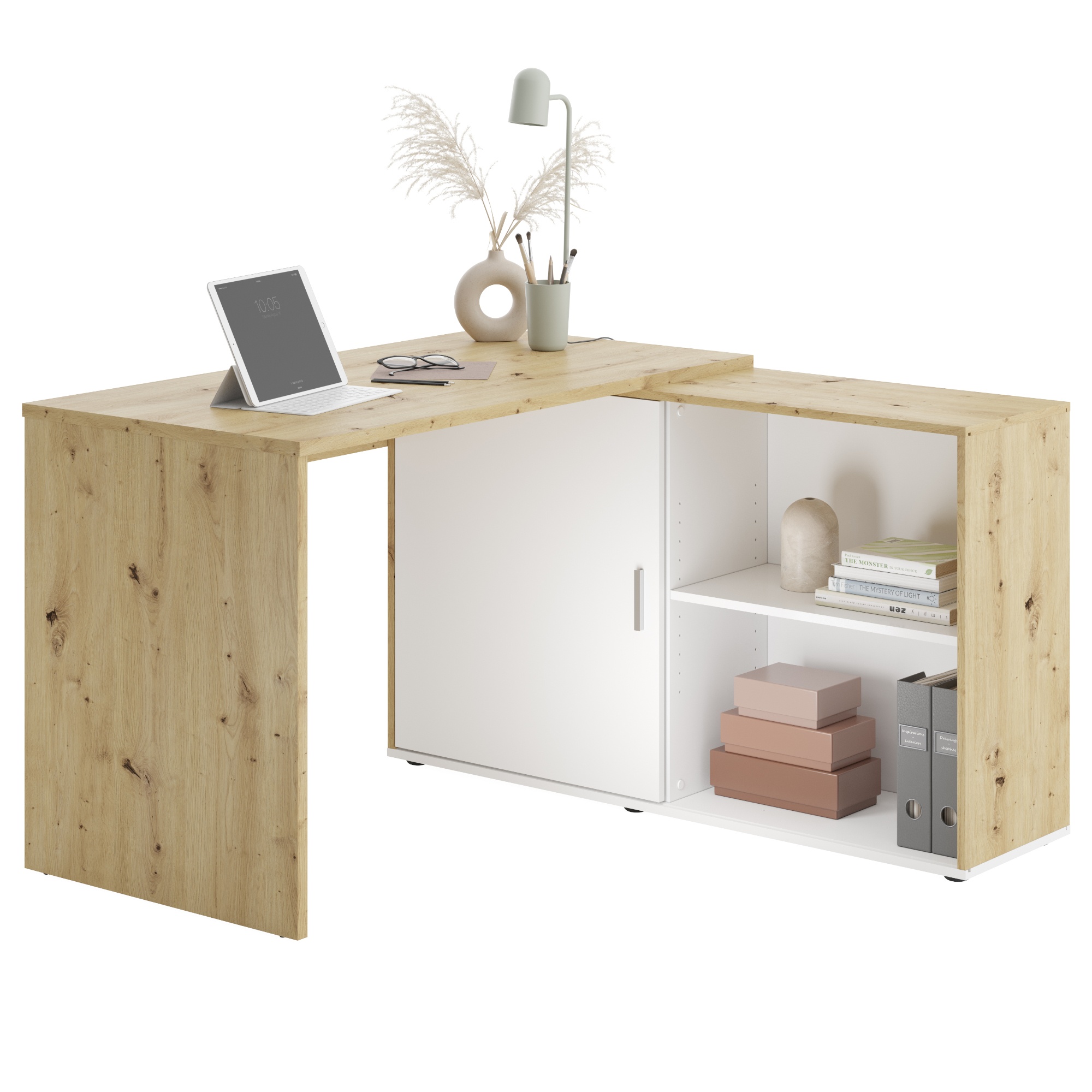 Moderný rohový písací stôl TEODORO optimálne vyrieši vašu pracovňu či kanceláriu. Prírodný dekor duba artisan v kombinácii s bielou farbou zapadne takmer do každého interiéru. Stôl je možné zmontovať do rôznych podôb, regálovú komodu môžete mať po ľavej či pravej strane, taktiež je možné ju mať v priamej línii s hornou doskou stola. Vnútri komody tak budete mať všetko priamo po ruke, môžete tu umiestniť všetky vaše dokumenty či šanóny. Povrch stola sa vyznačuje jednoduchou údržbou.