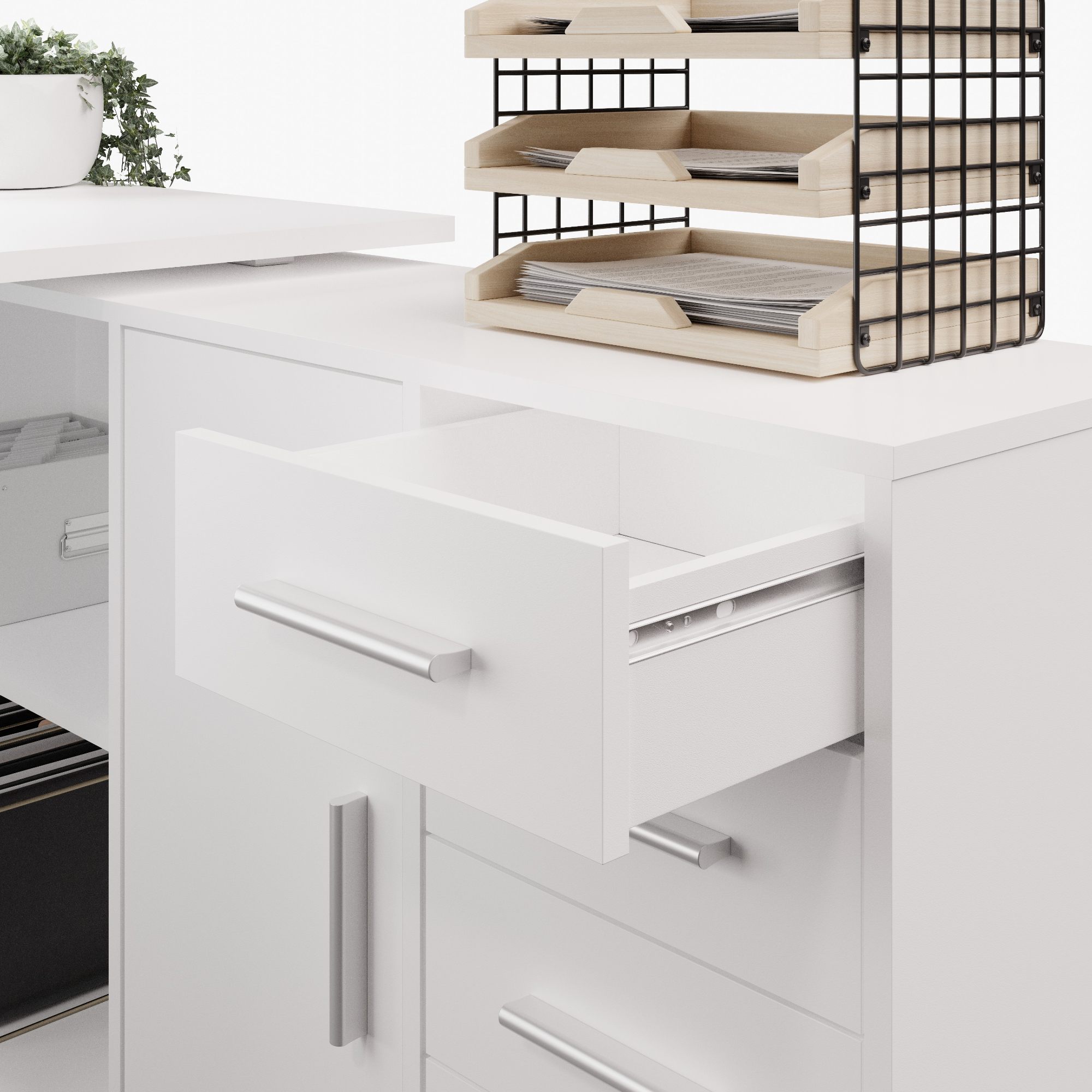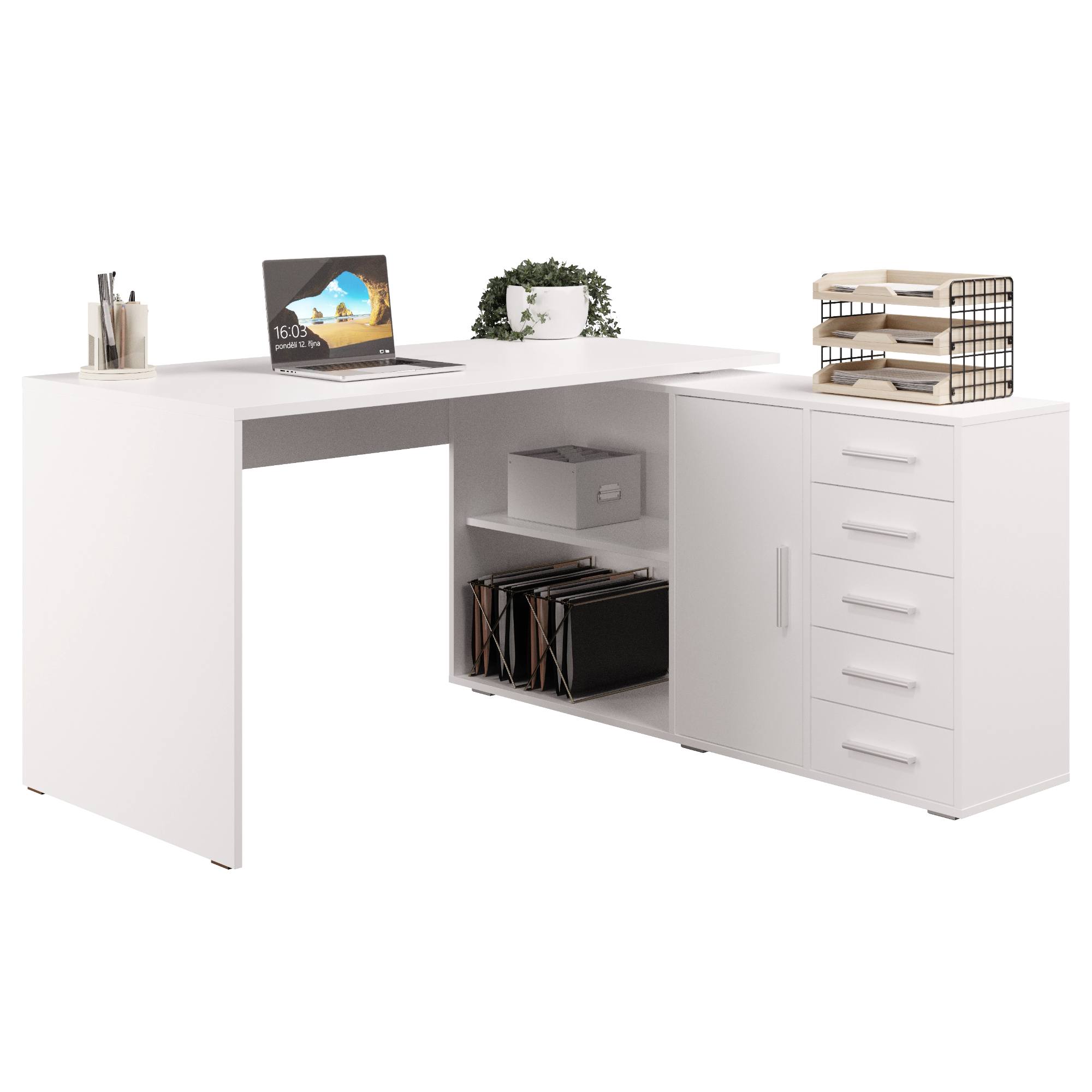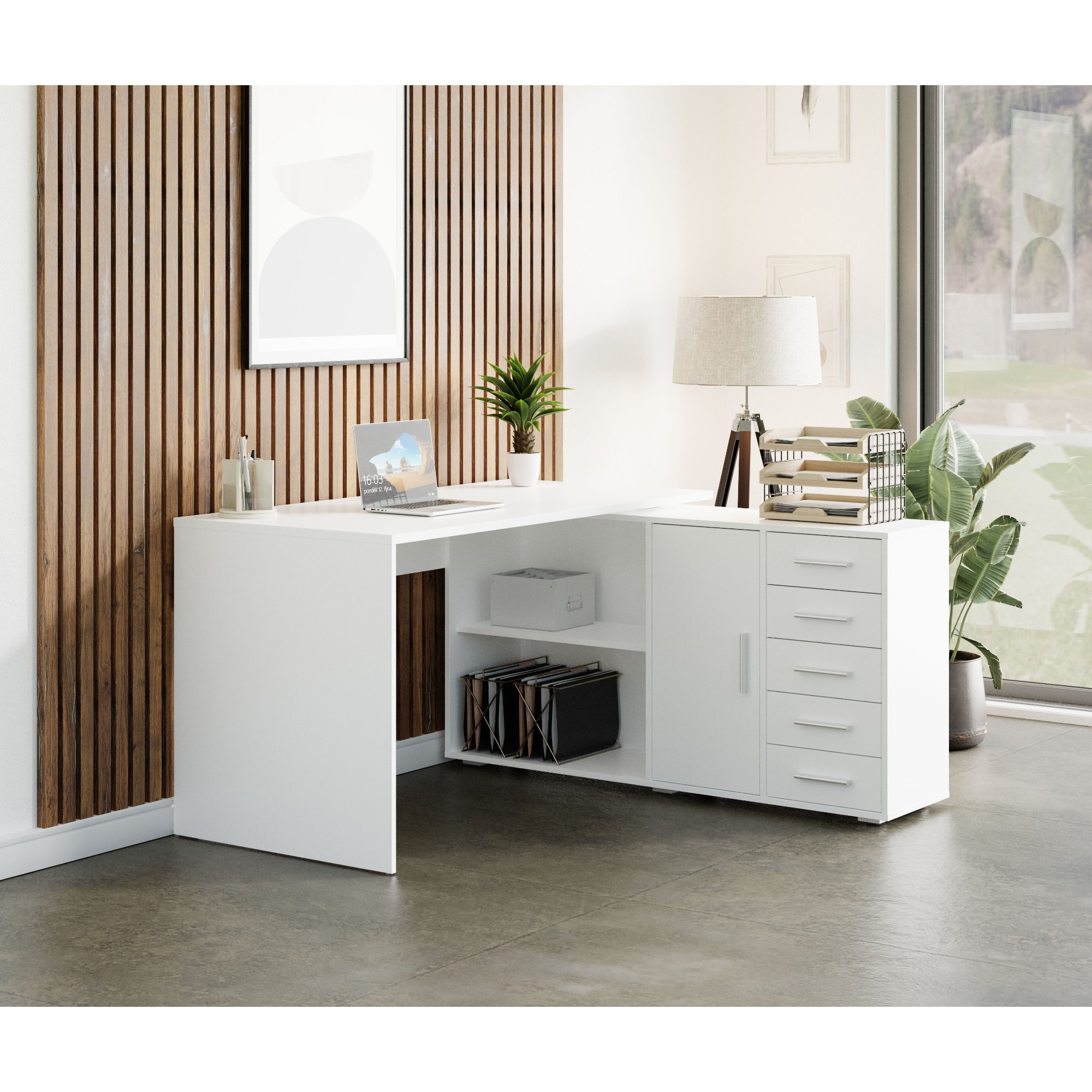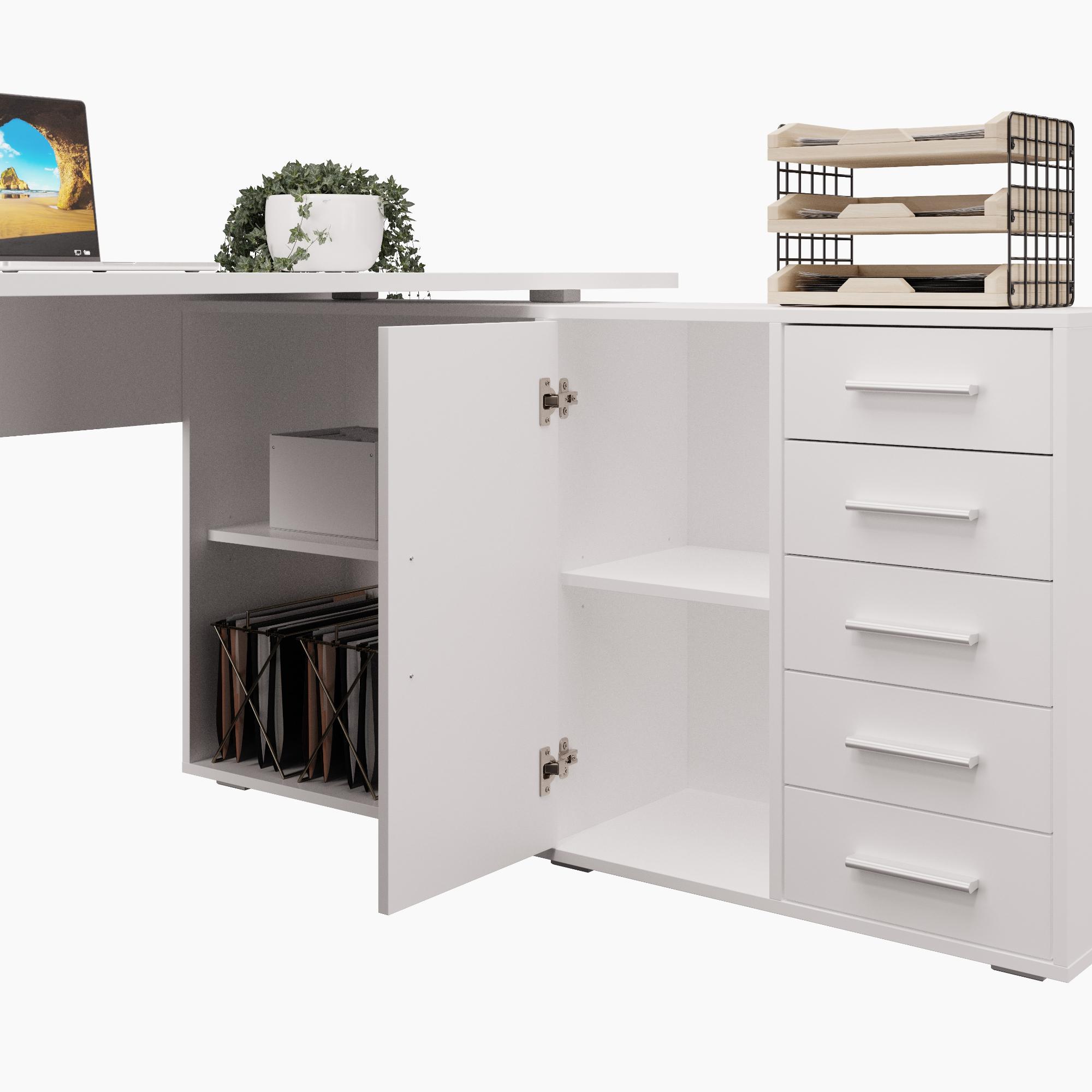 Praktická rohová kombinácia TOP spája pracovný stôl a komodu a skvele sa hodí na zariaďovanie domácej kancelárie. Moderné vyhotovenie vytvára v celej miestnosti príjemné prostredie na každodennú prácu. Úložný priestor komody pozostáva z piatich zásuviek, skrinky s jednou vloženou policou a z otvoreného regála. Laminovaný drevený materiál sa ľahko udržuje.
