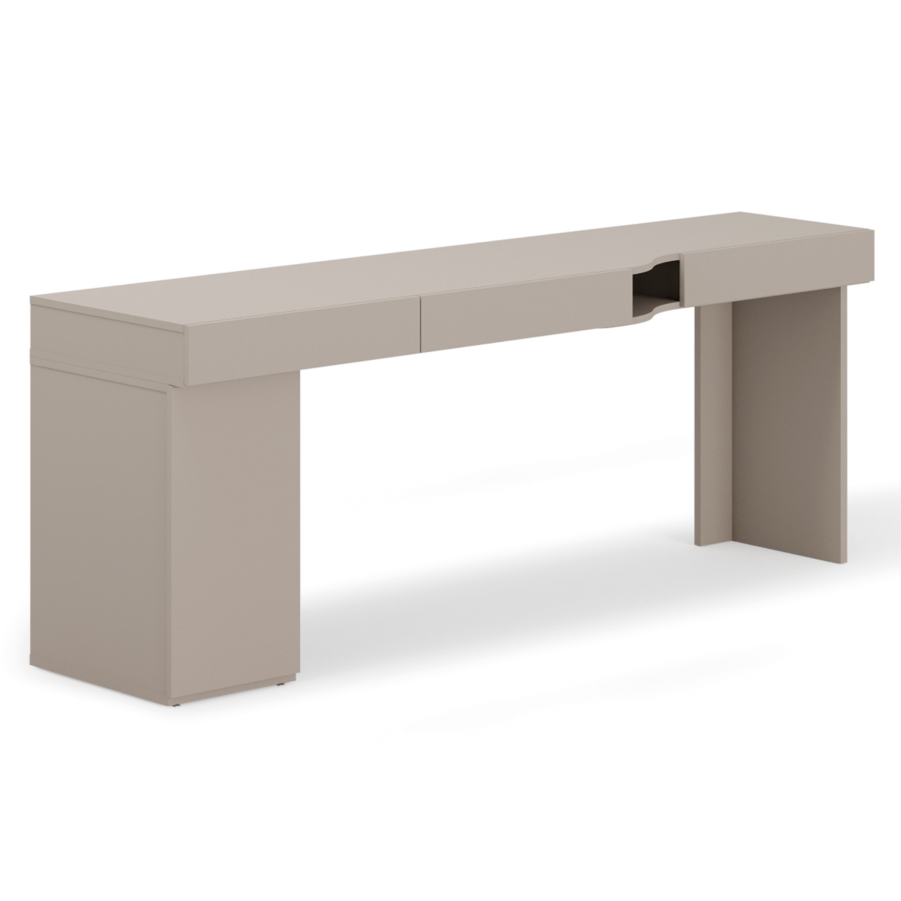 Set obsahuje písací stôl s priestrannou hornou doskou, ktorého súčasťou sú 3 zásuvky a otvorený priestor na uloženie dokumentov či školských potrieb. Stôl upevníte na jednej strane k skrinke, ktorá je uzatvárateľná pomocou otočných dvierok. Za nimi sa nachádza priestor s vloženou policou. Zostava je vyhotovená vo funkčnom prevedení bez úchytiek, čo podčiarkuje čistý, moderný vzhľad celku.