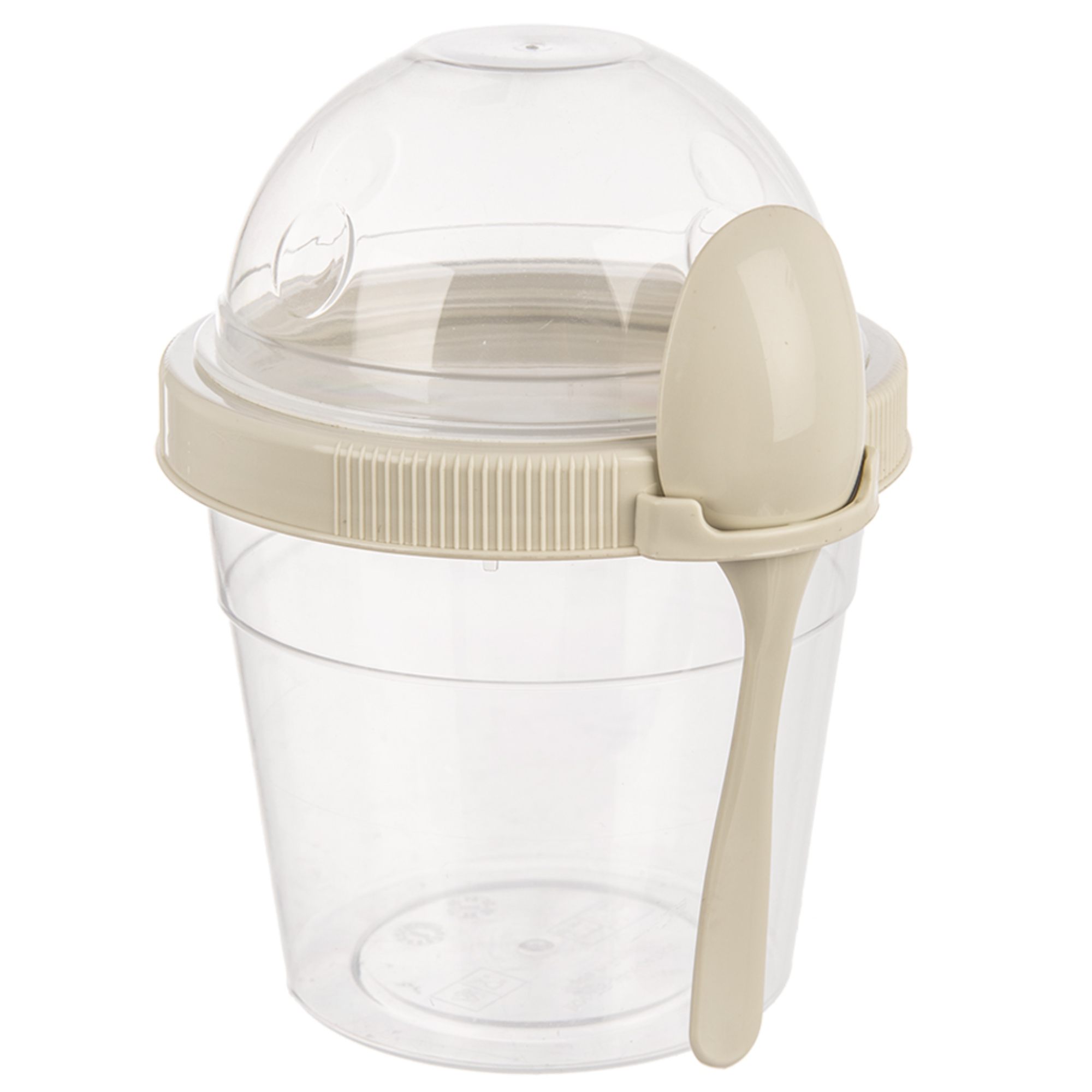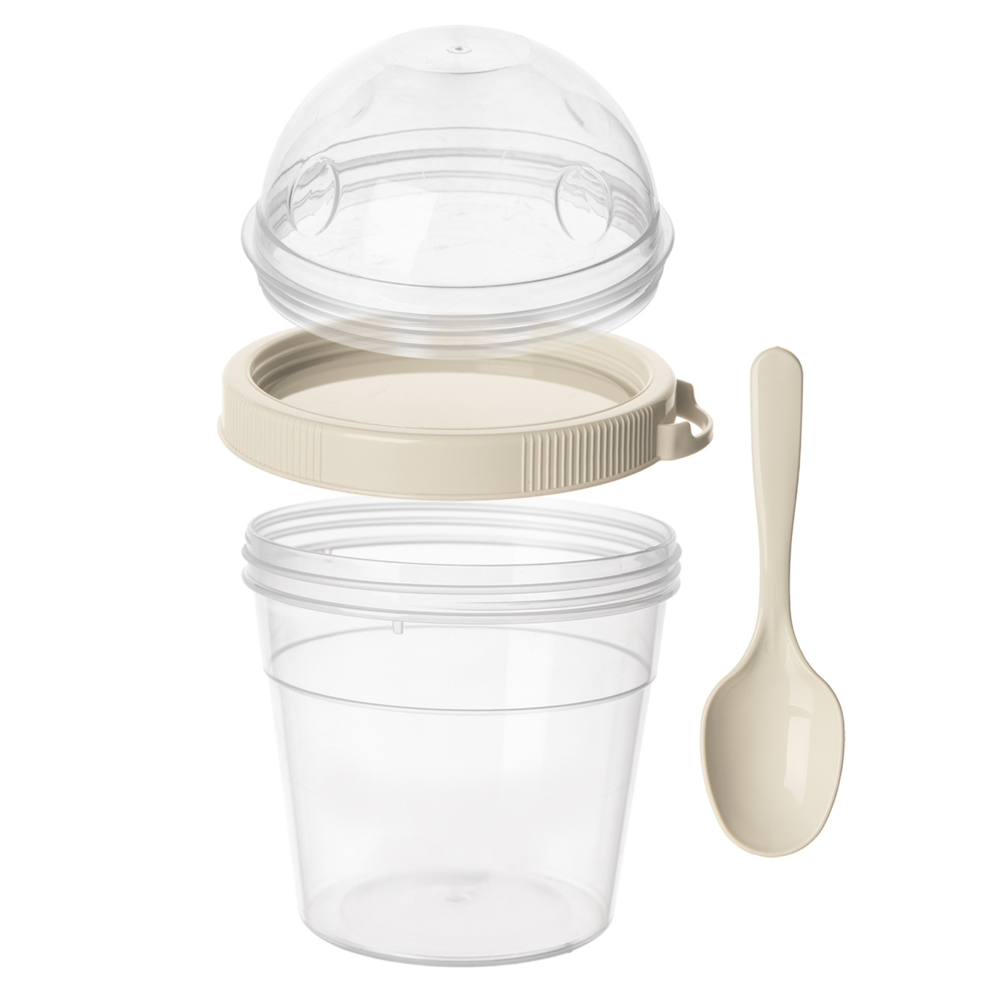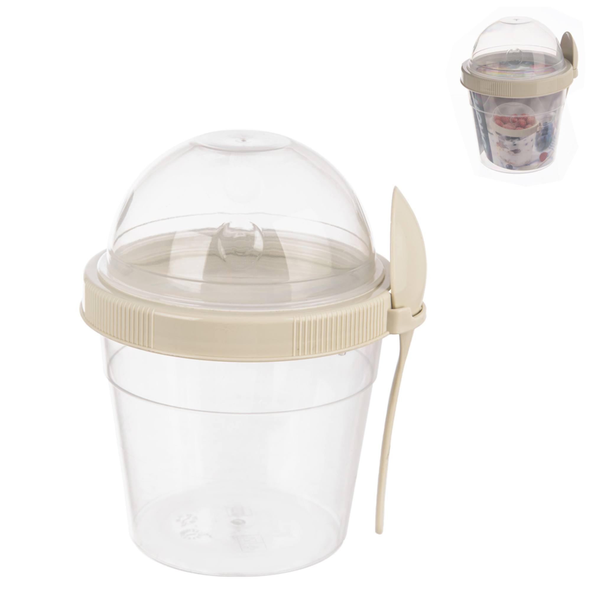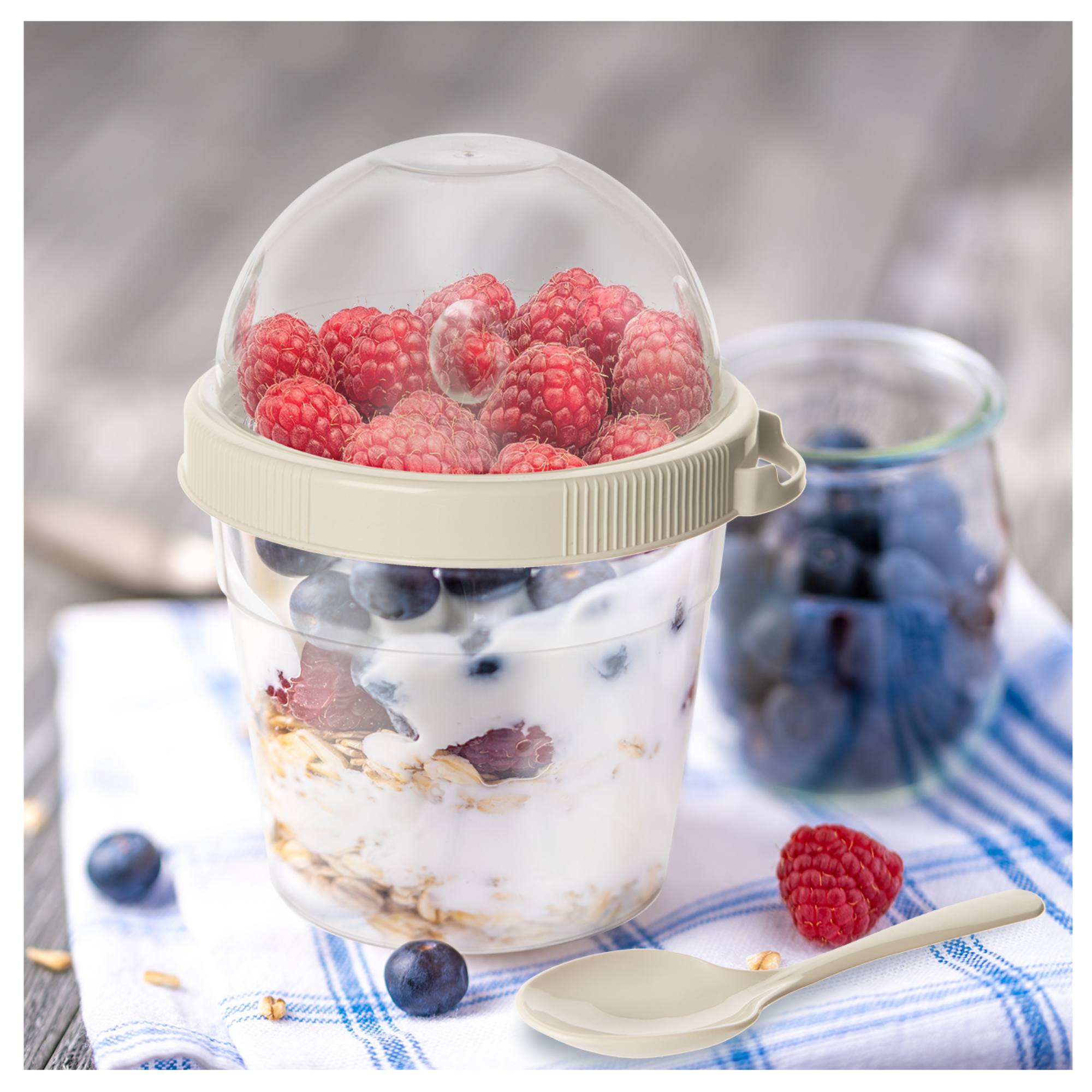 Nádoba je vybavená pevným vekom, ktoré zaistí tesné uzavretie, a krúžkom na pohodlné pripevnenie lyžičky, vďaka čomu môžete obsah konzumovať kdekoľvek bez toho, aby ste potrebovali ďalší riad. Dvojúrovňová konštrukcia umožňuje ľahké oddelenie prísad, ako sú ovocie, granola, krutóny, od jogurtu či šalátu, čo vám uľahčí prípravu a prenášanie pokrmov.